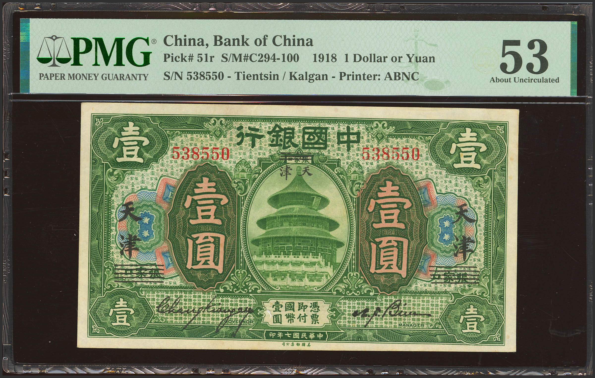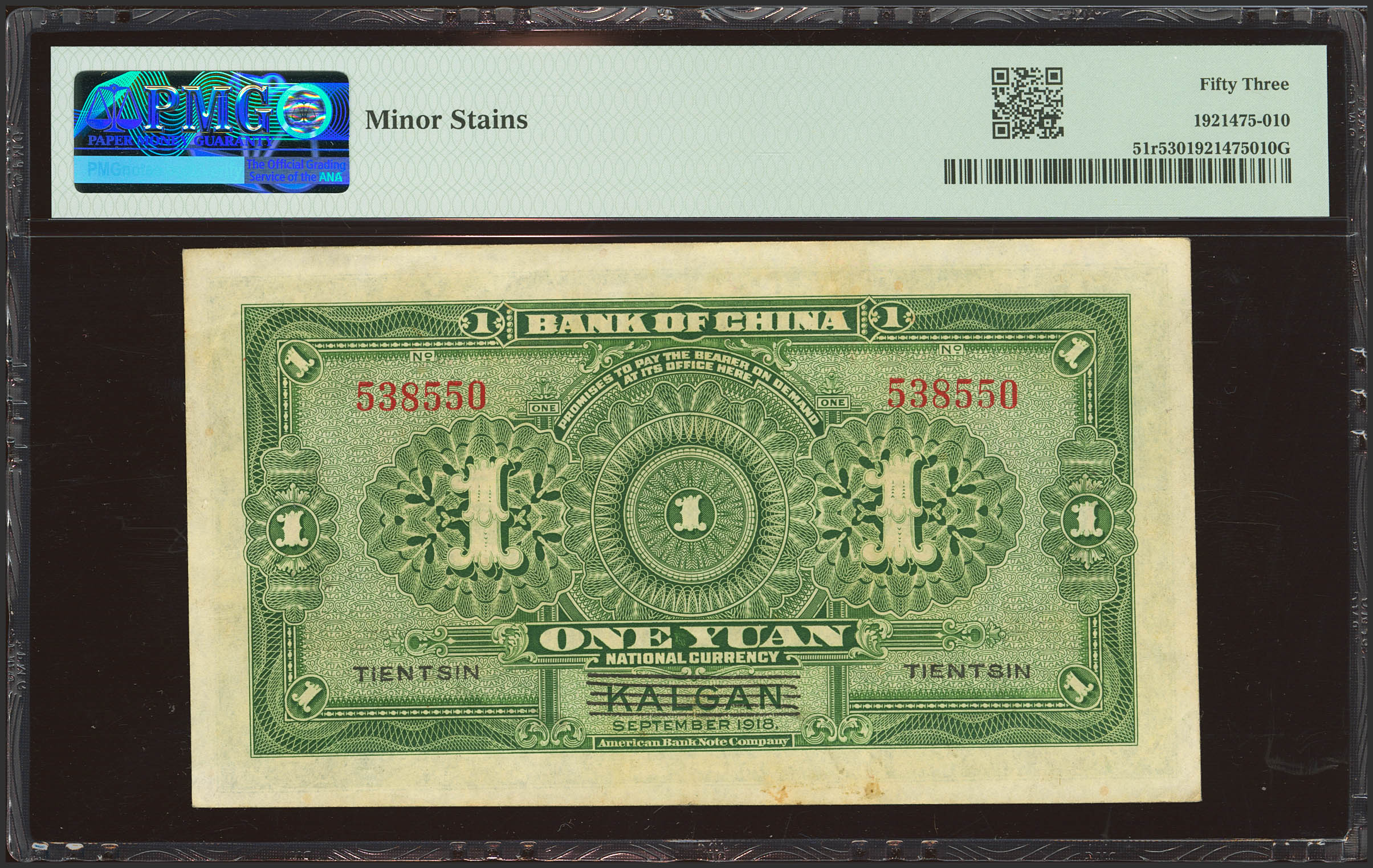 CHINA. 1 Yuan. September 1918. Bank of China. Tientsin / Kalgan. (Pick: 51r, SM: C294-100). PMG53 (minor stains).
