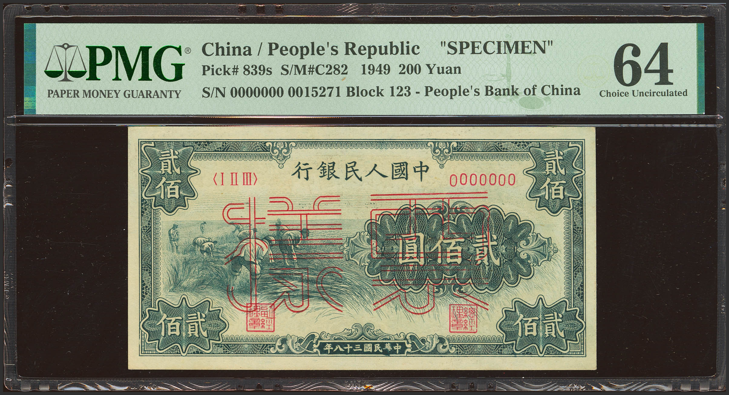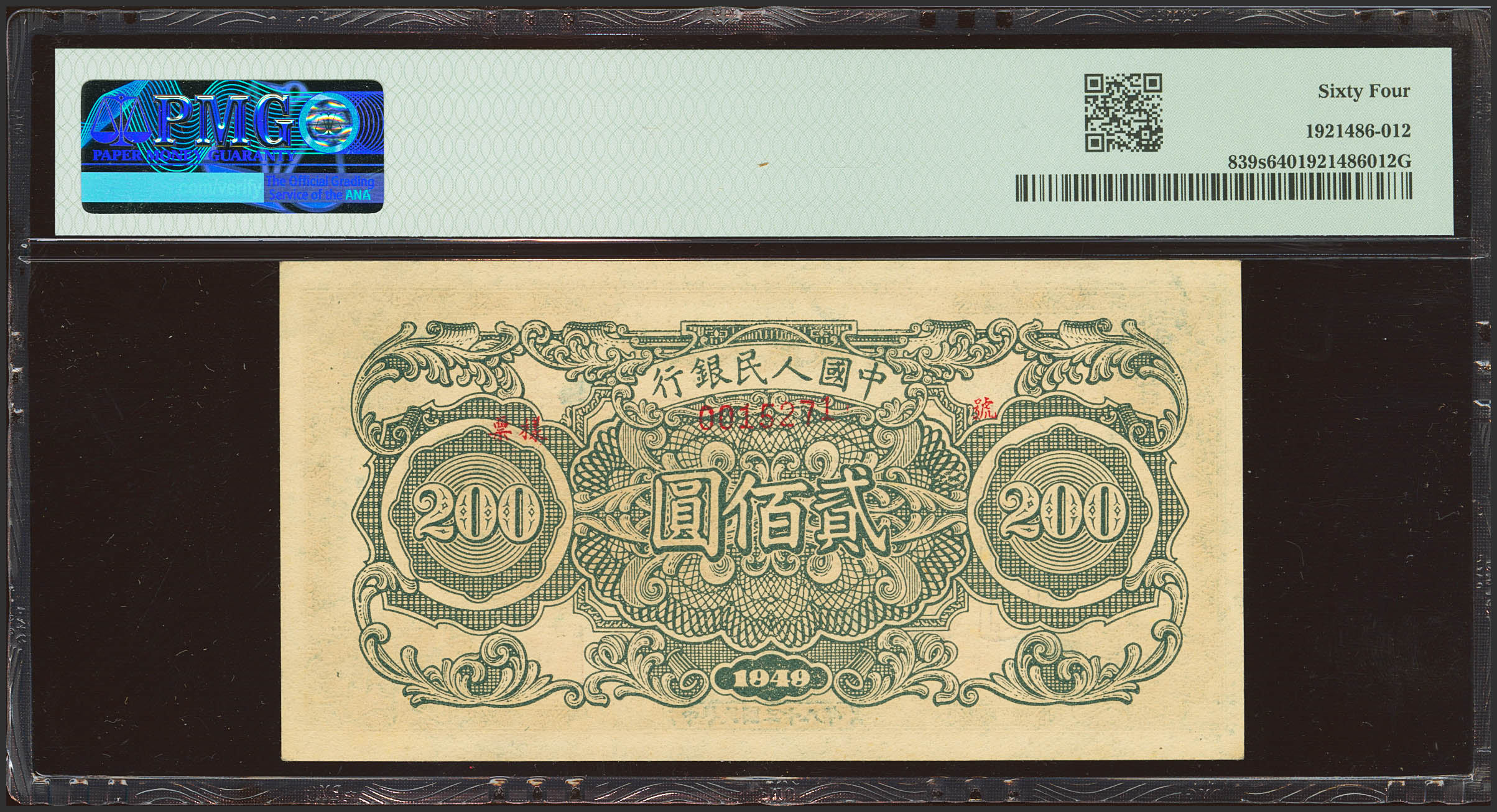 CHINA. 200 yuan. 1949. Peoples Bank. Specimen. (Pick: 839s, SM: C282). PMG64.