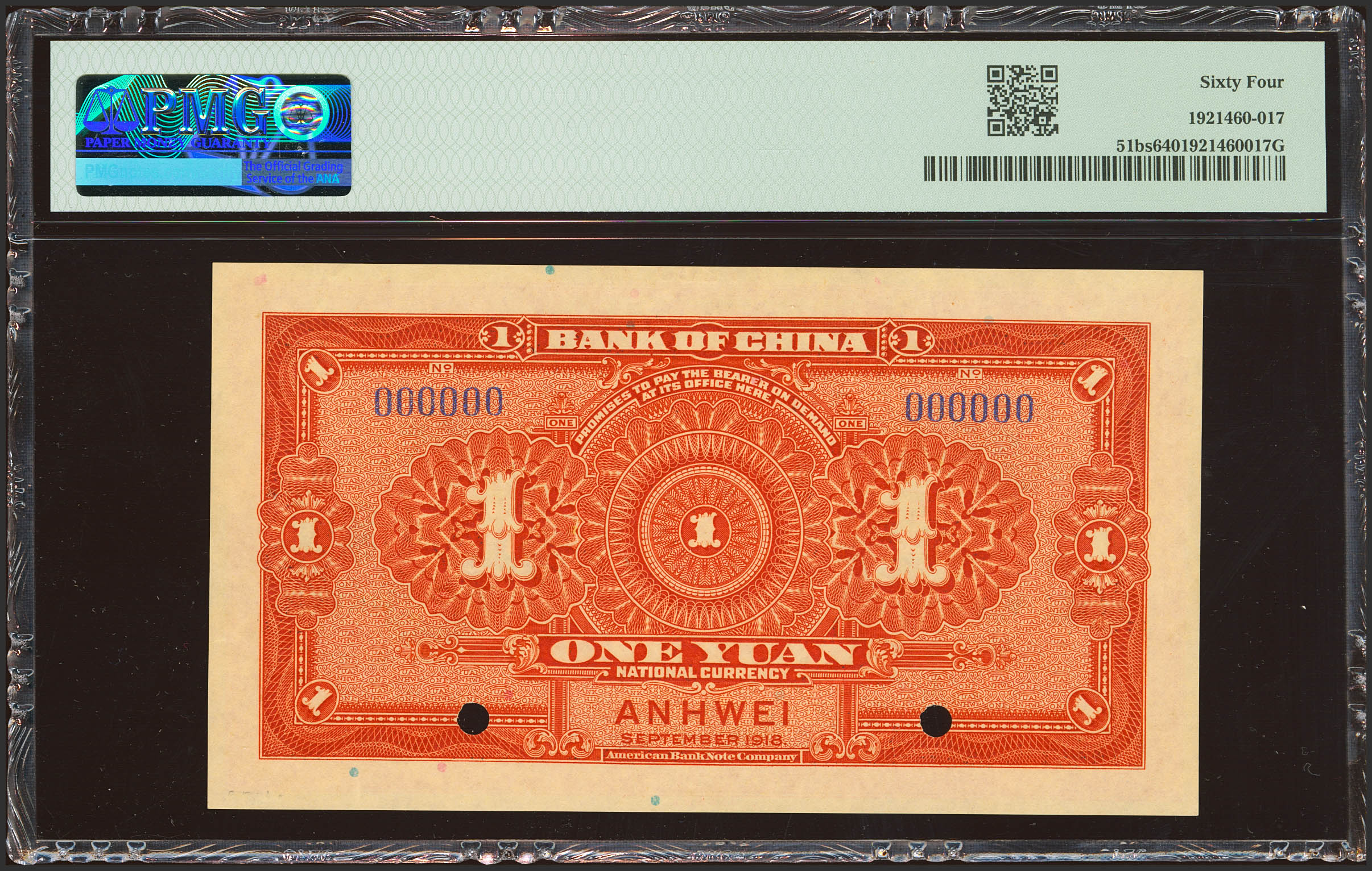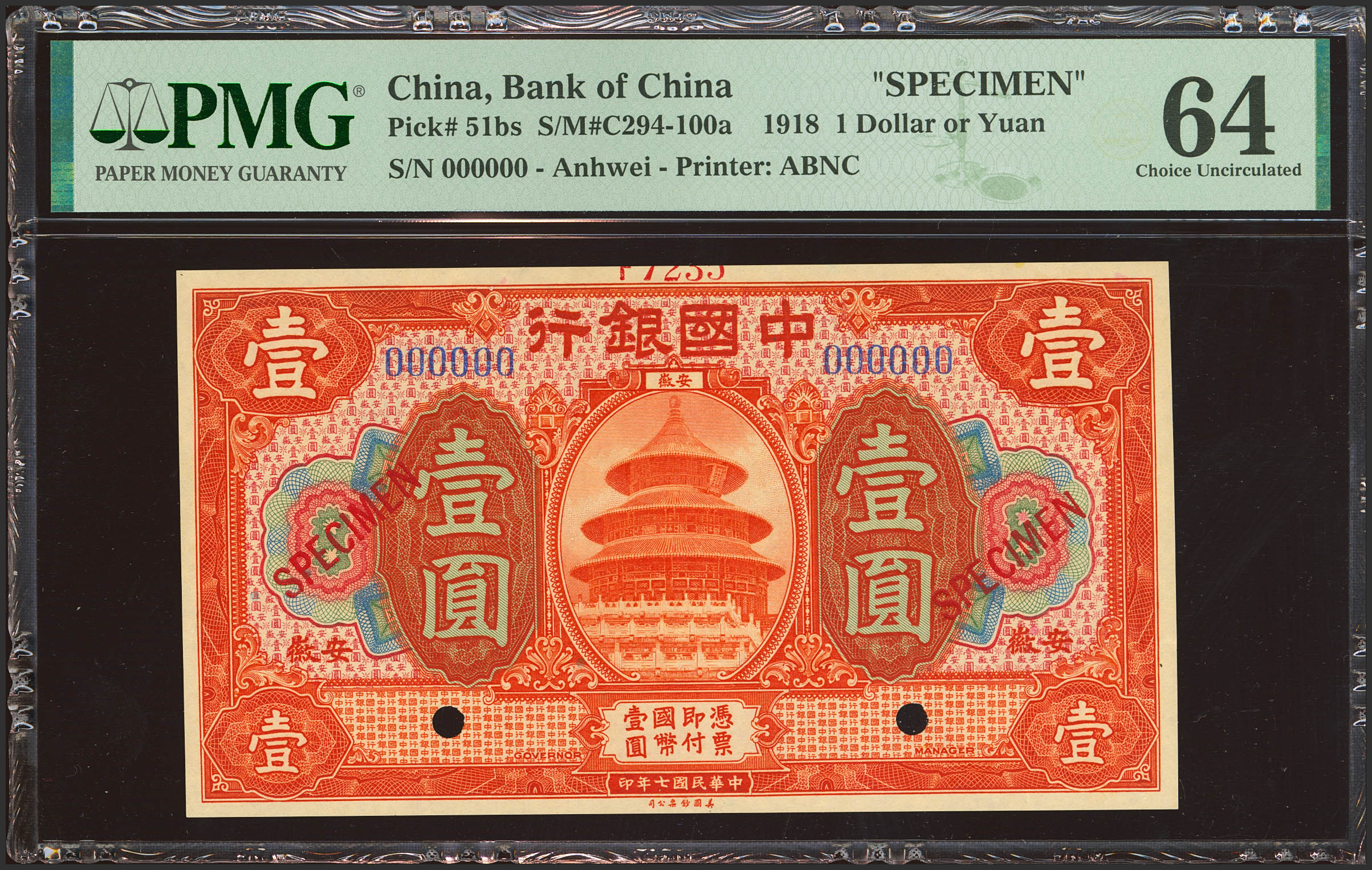 CHINA. 1 Yuan. September 1918. Bank of China. Anhwei. Specimen. (Pick: 51bs, SM: C294-100a). PMG64.