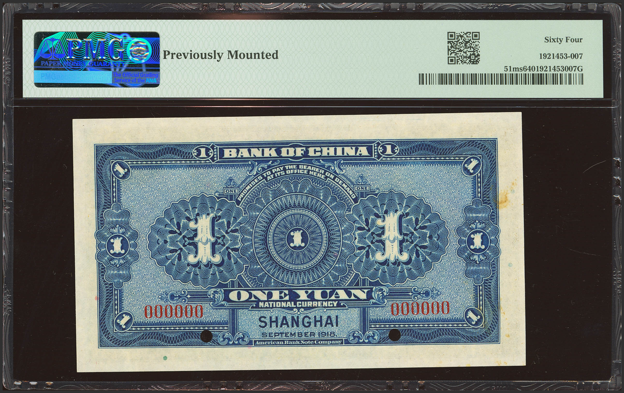 CHINA. 1 Yuan. September 1918. Bank of China. Shanghai. Specimen. (Pick: 51ms, SM: C294-100k). PMG64 (previously mounted).