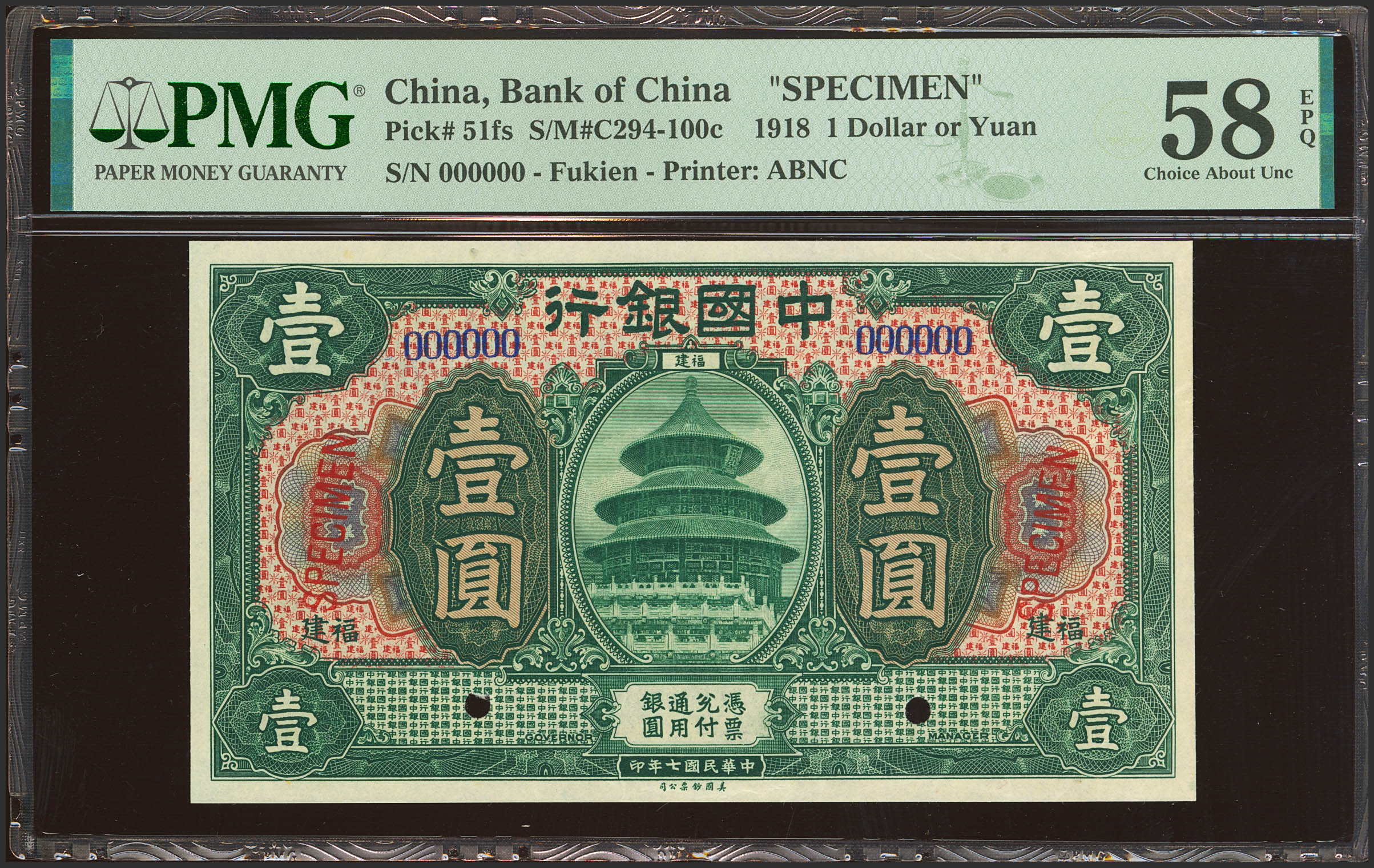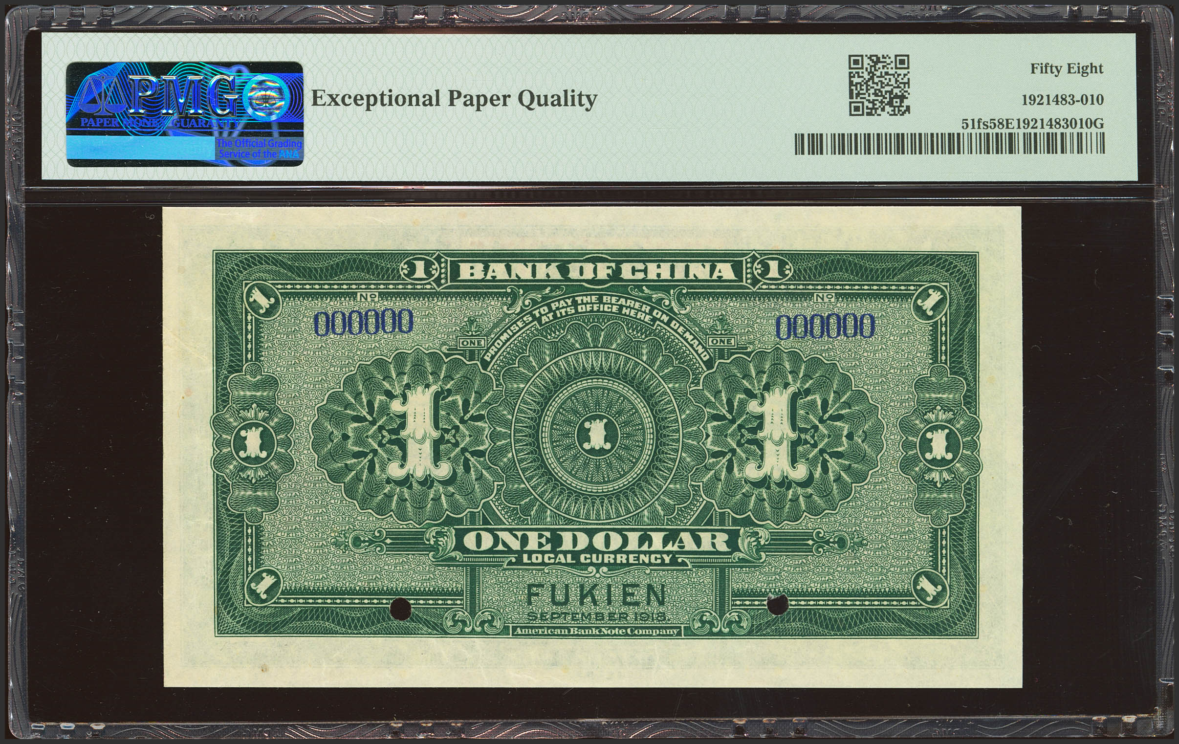 CHINA. 1 Dollar. September 1918. Bank of China. Fukien. Specimen. (Pick: 51fs, SM: C294-100c). PMG58EPQ.