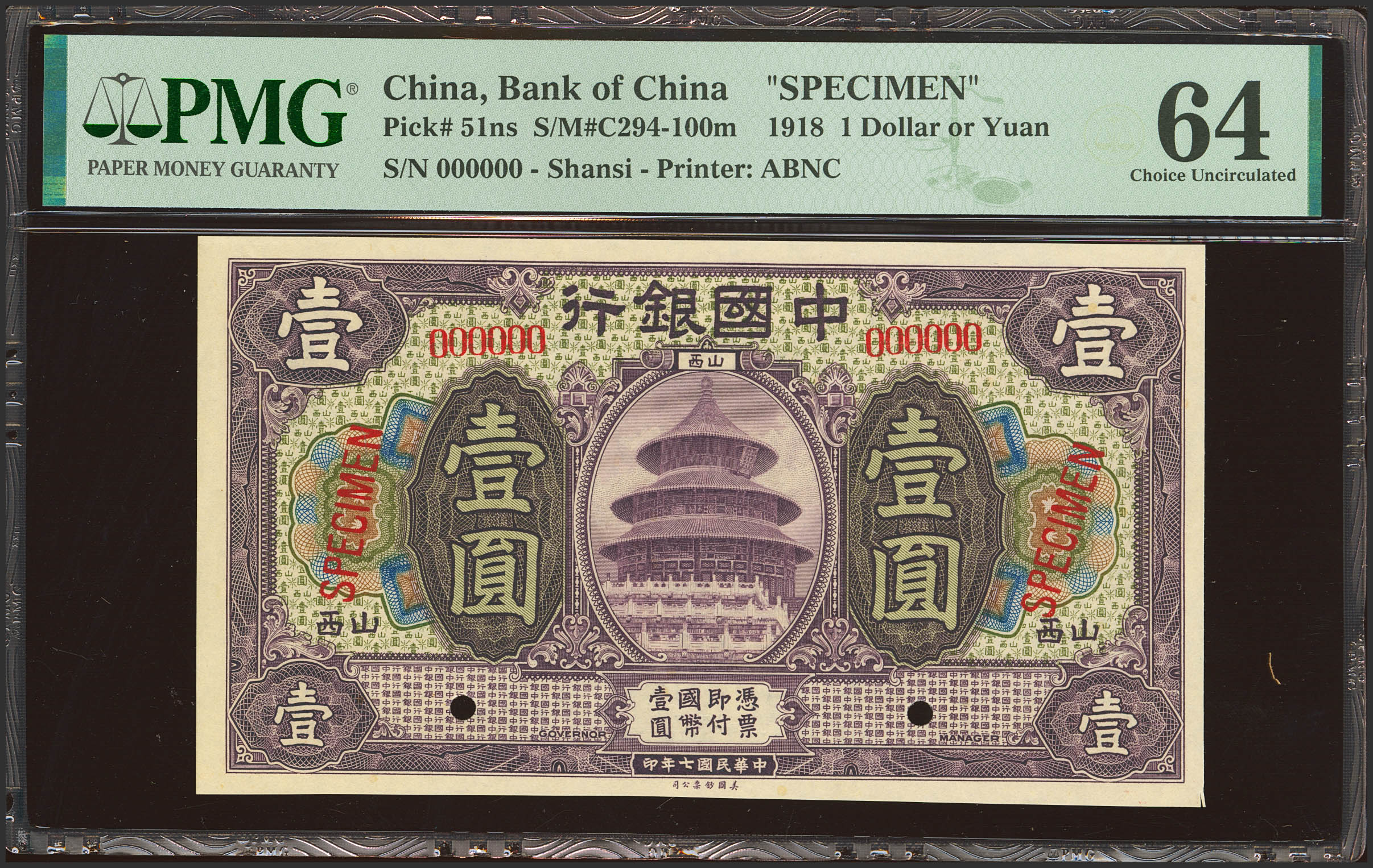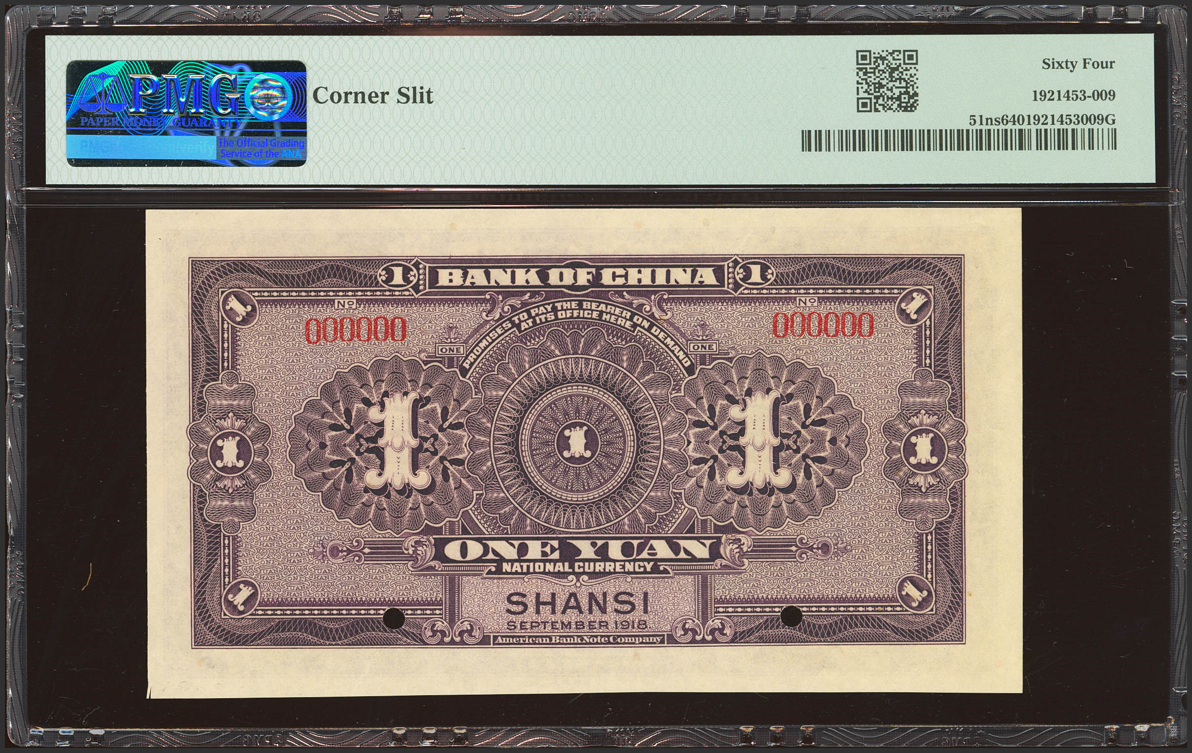 CHINA. 1 Yuan. September 1918. Bank of China. Shansi. Specimen. (Pick: 51ns, SM: C294-100m). PMG64 (corner slit).