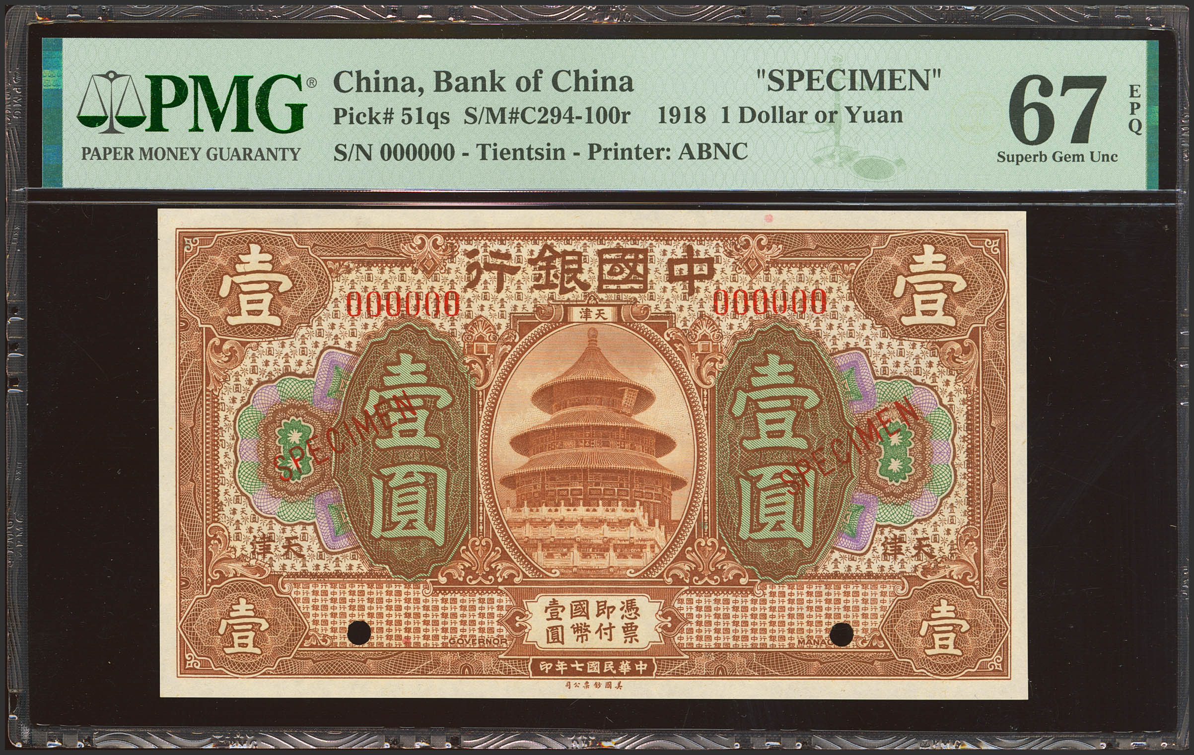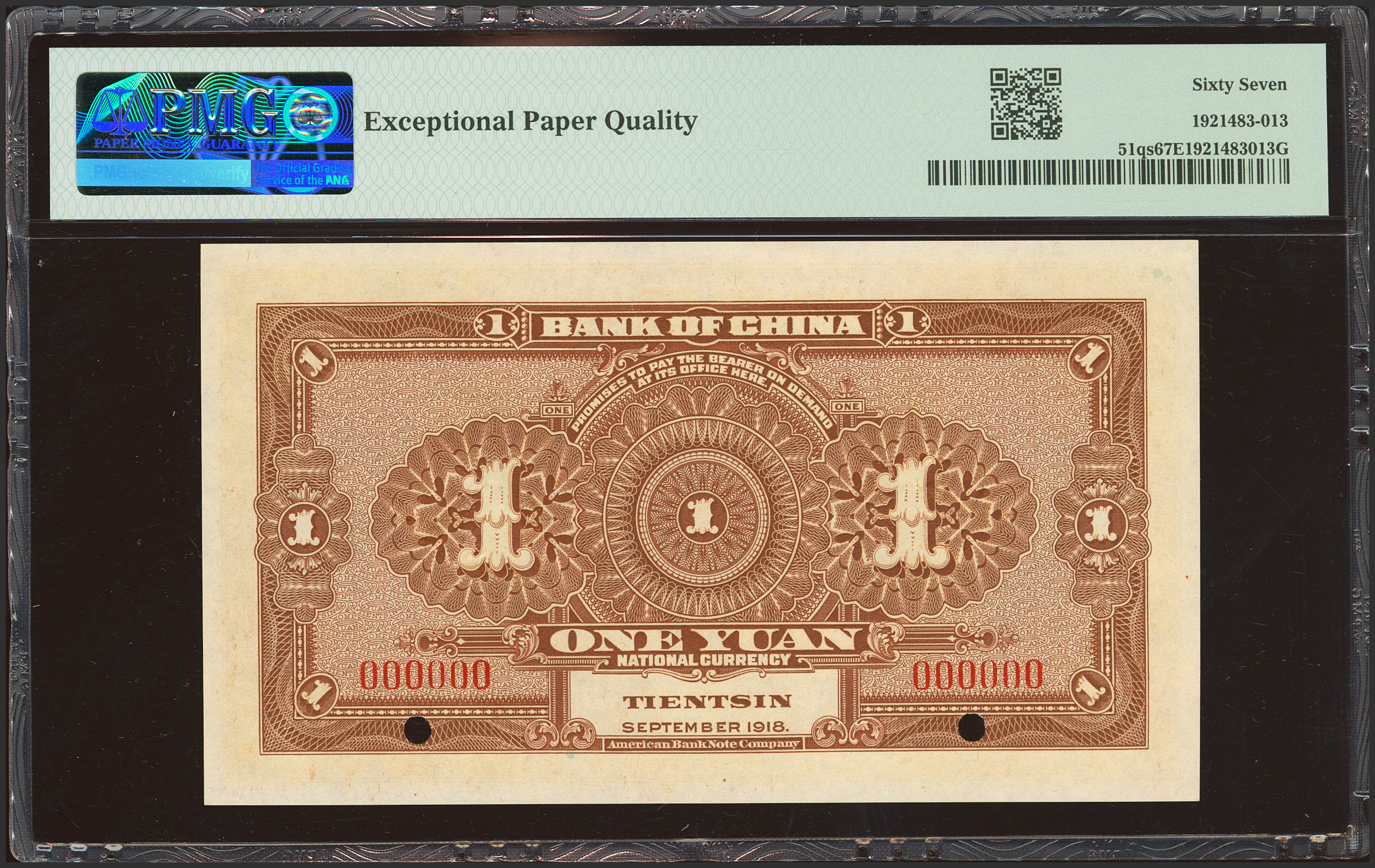 CHINA. 1 Yuan. September 1918. Bank of China. Tientsin. Specimen. (Pick: 51qs, SM: C294-100r). PMG67EPQ.
