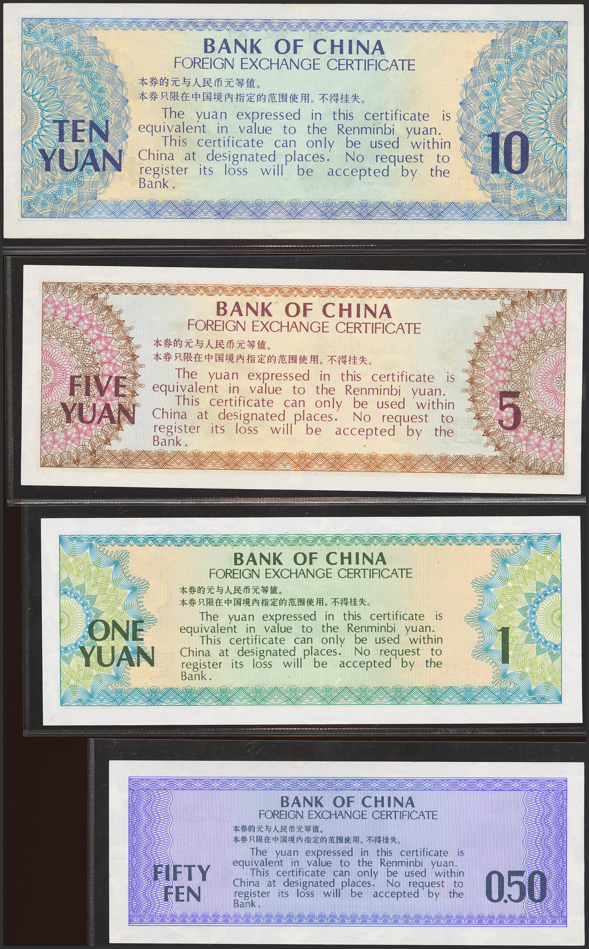 CHINA. Lot of 4 notes of Fen and Yuan. 1979. Bank of China. Foreign Exchange Certificate. (Pick: FX2, FX3, FX4, FX5). From About Uncirculated (FX5) to Uncirculated.