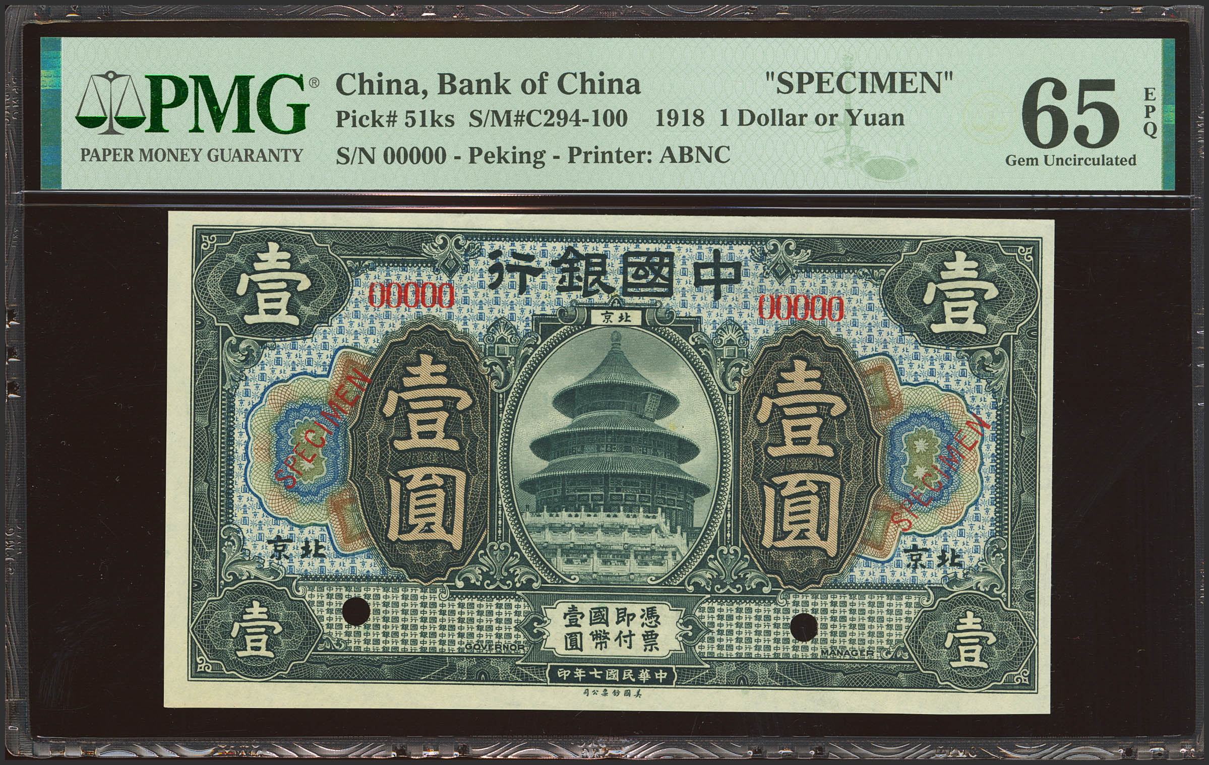 CHINA. 1 Yuan. September 1918. Bank of China. Peking. Specimen. (Pick: 51ks, SM: C294-100). PMG65EPQ.