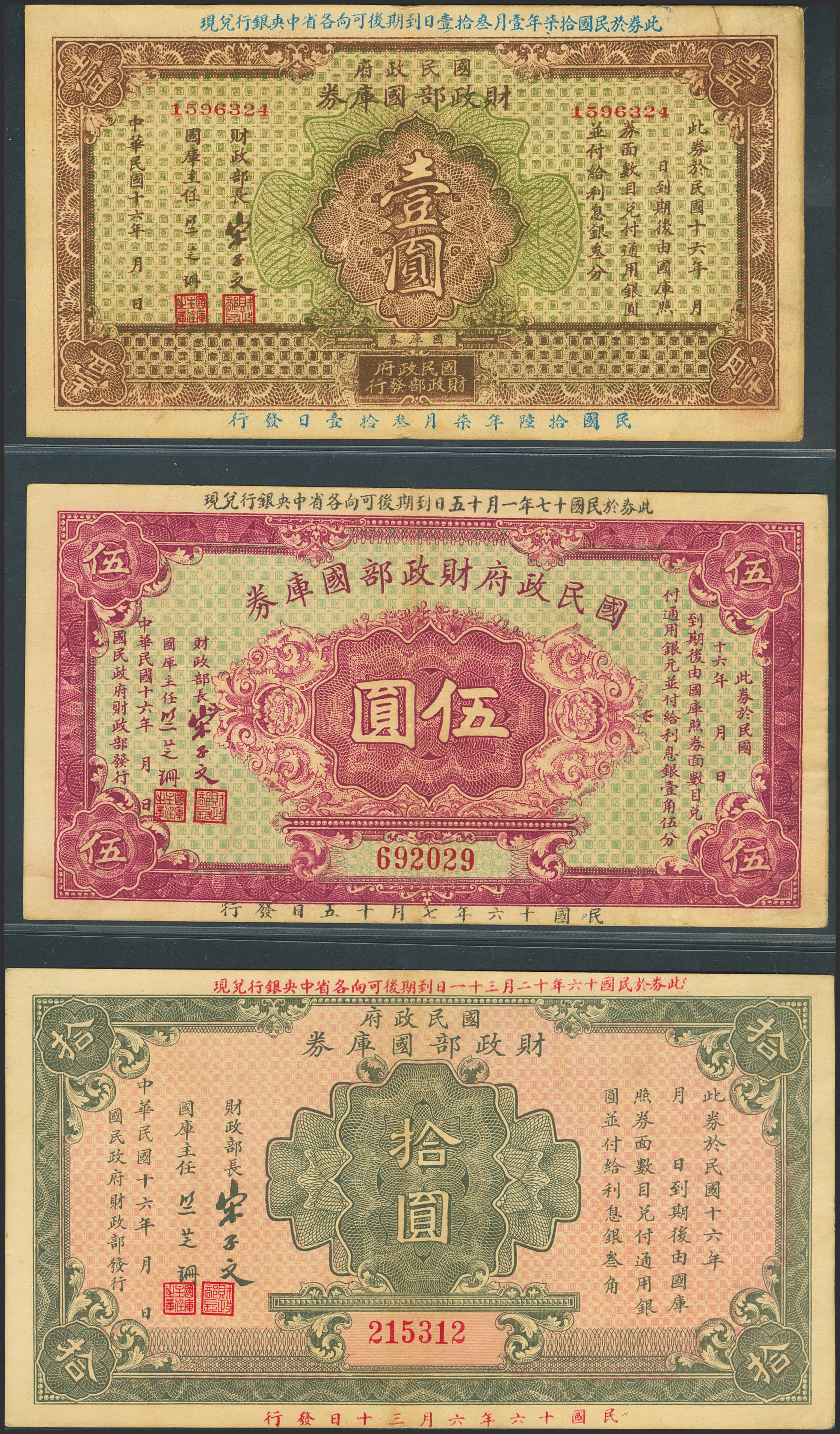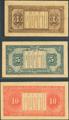 CHINA. Lot of 3 notes of 1, 5 and 10 Yuan. 1927. Ministry of Finance. Treasury Savings Bonds. (Pick: Unlisted, S/M: T182-1, T182-2, T182-3). Extremely Fine.