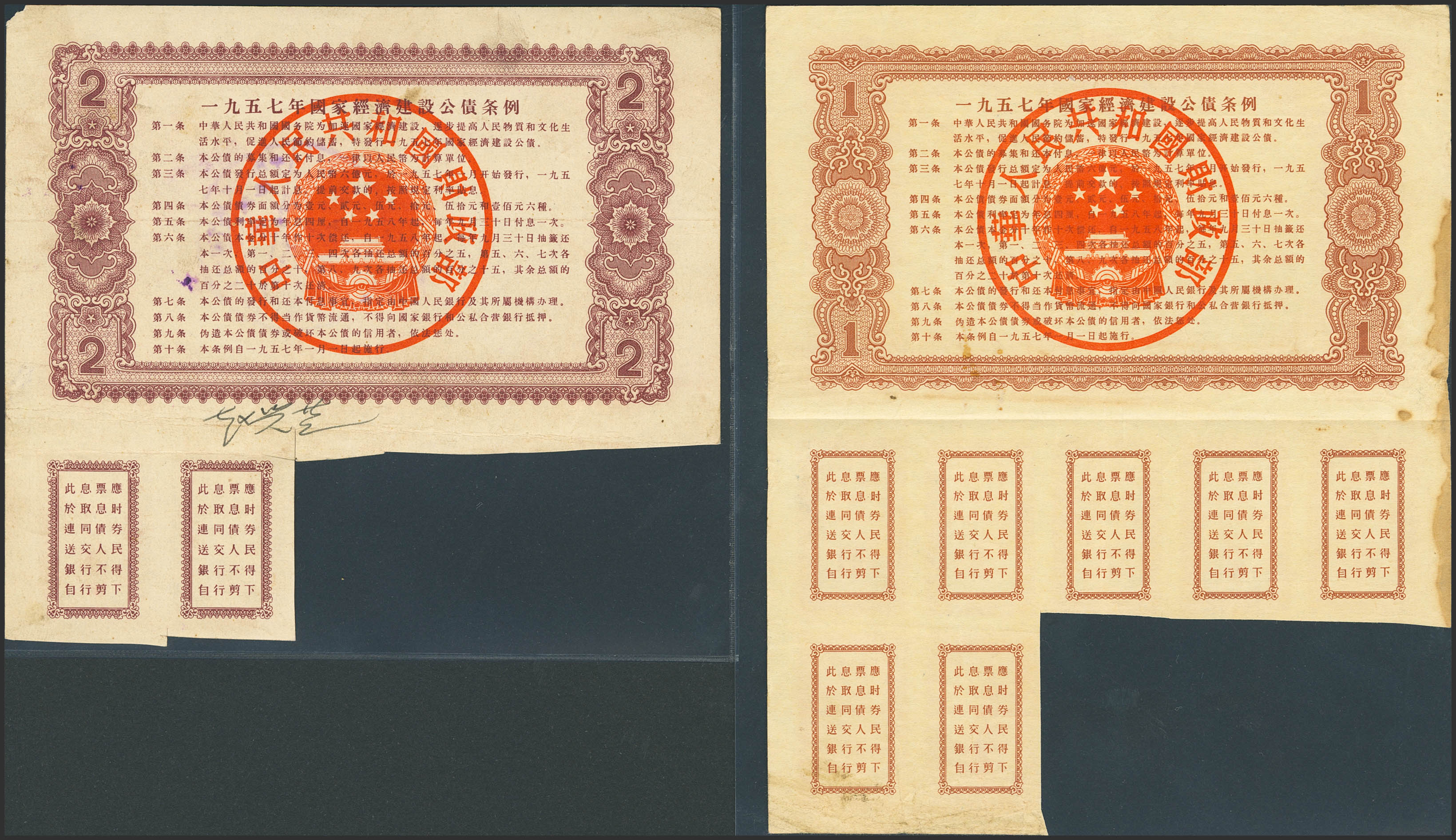 CHINA. Lot of 2 notes of 1 and 2 Yuan. 1957. Government Bonds. (Pick: Unlisted). More than Very Fine / Extremely Fine.