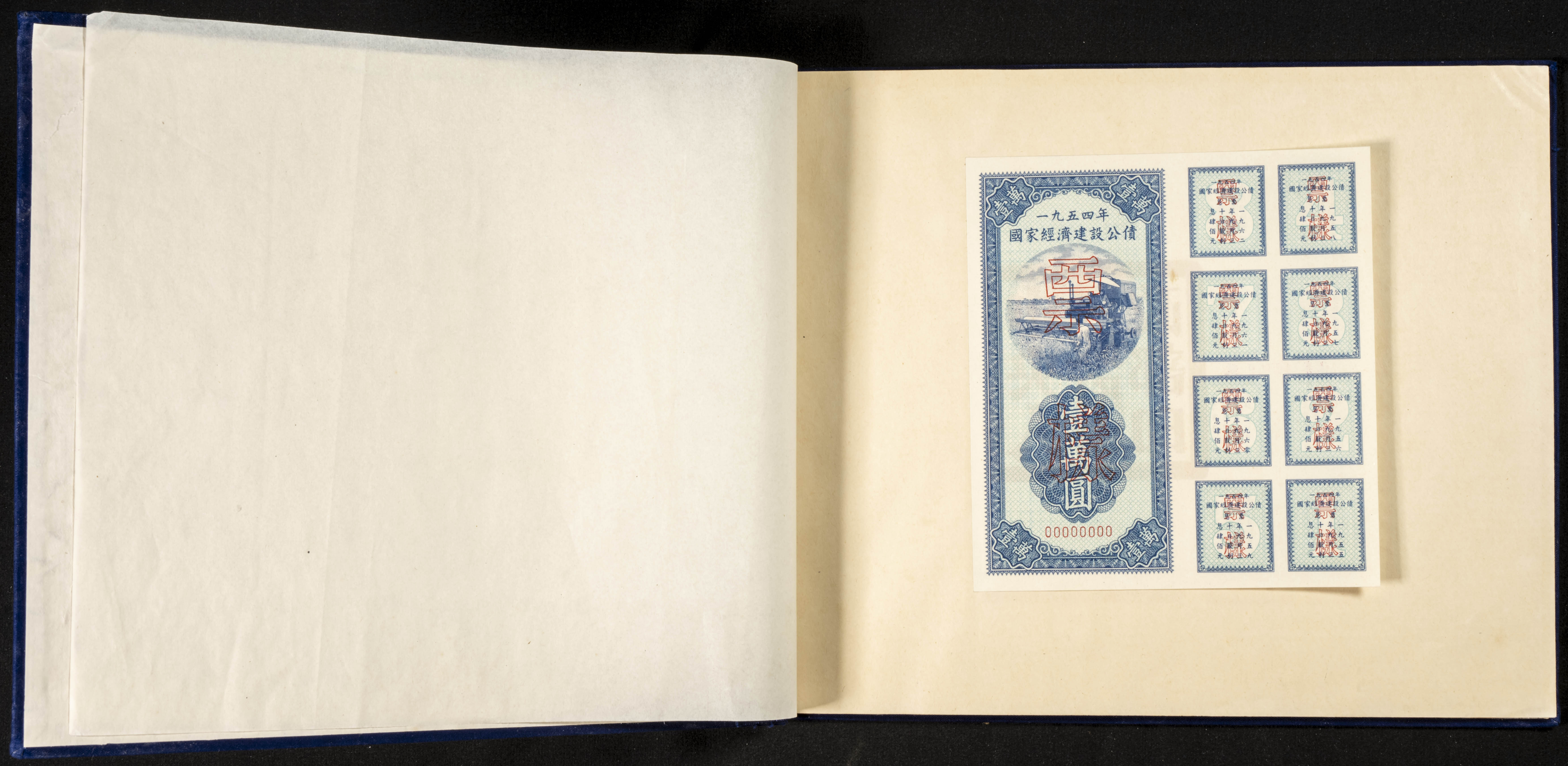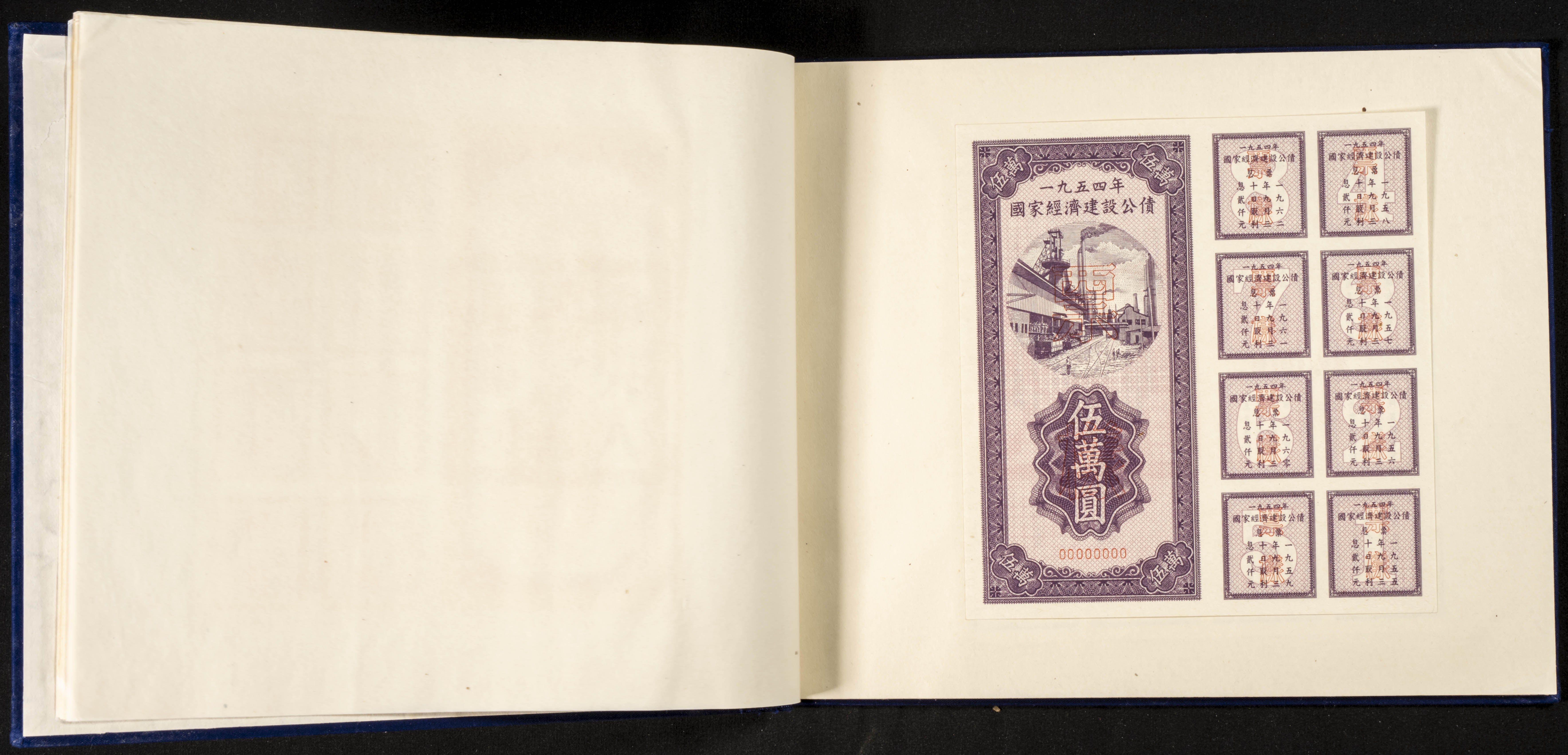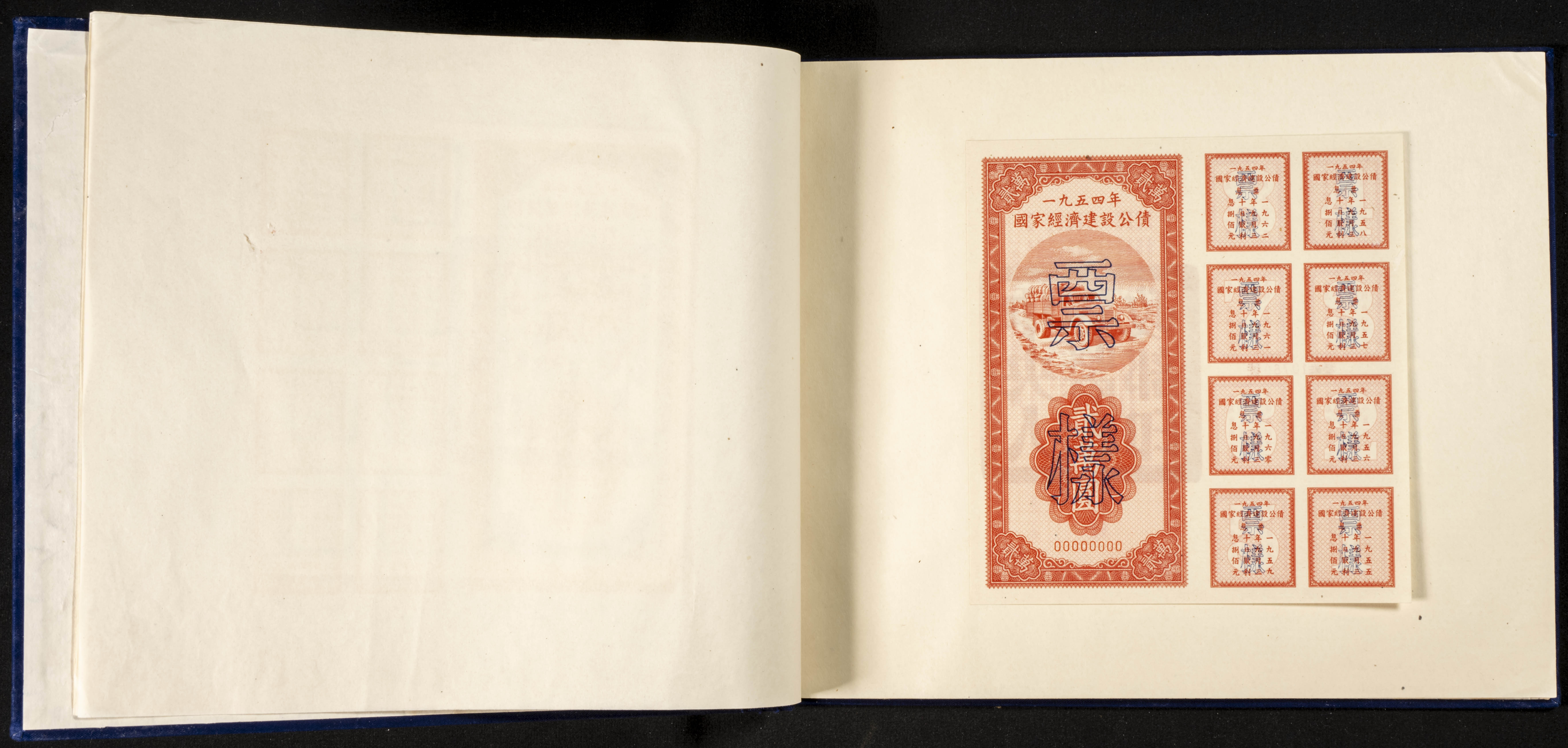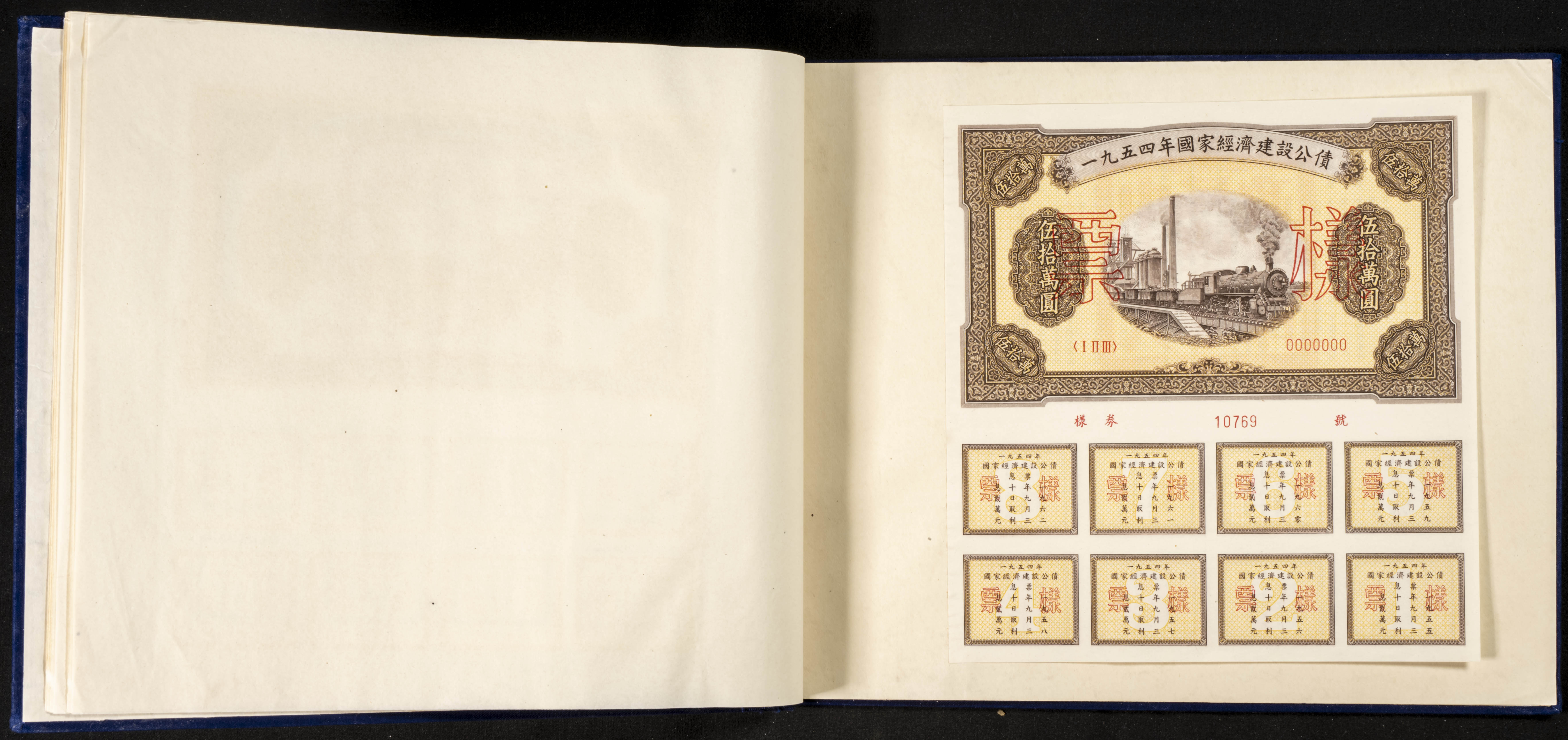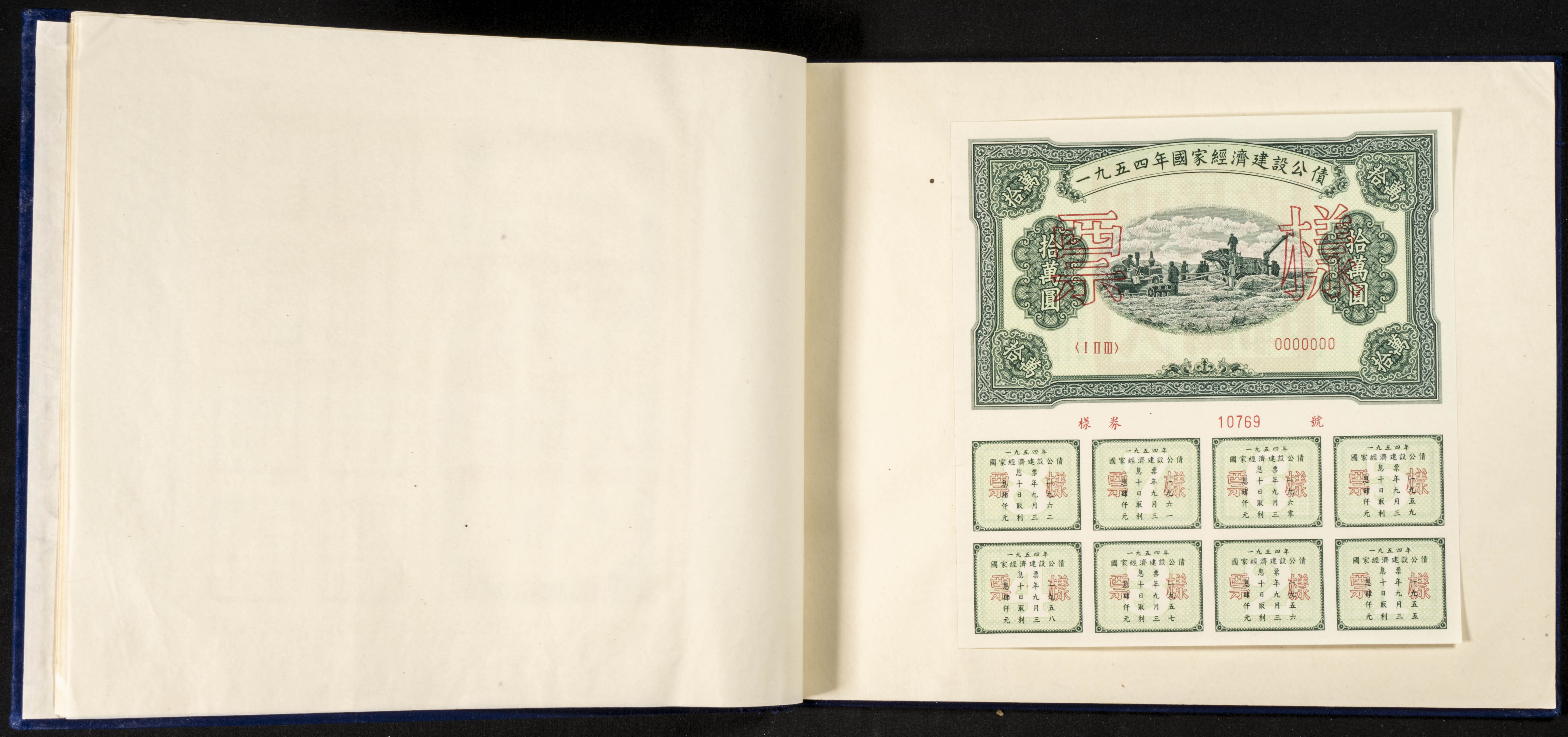 CHINA-BONDS. Lot of 5 Specimen notes. 1954. People’s Republic. National Economic Construction Government Bonds. Complete specimens, each with front and back. All denominations. (Pick: Unlisted). Notes mounted in the booklet by the top margin. Less than Uncirculated.