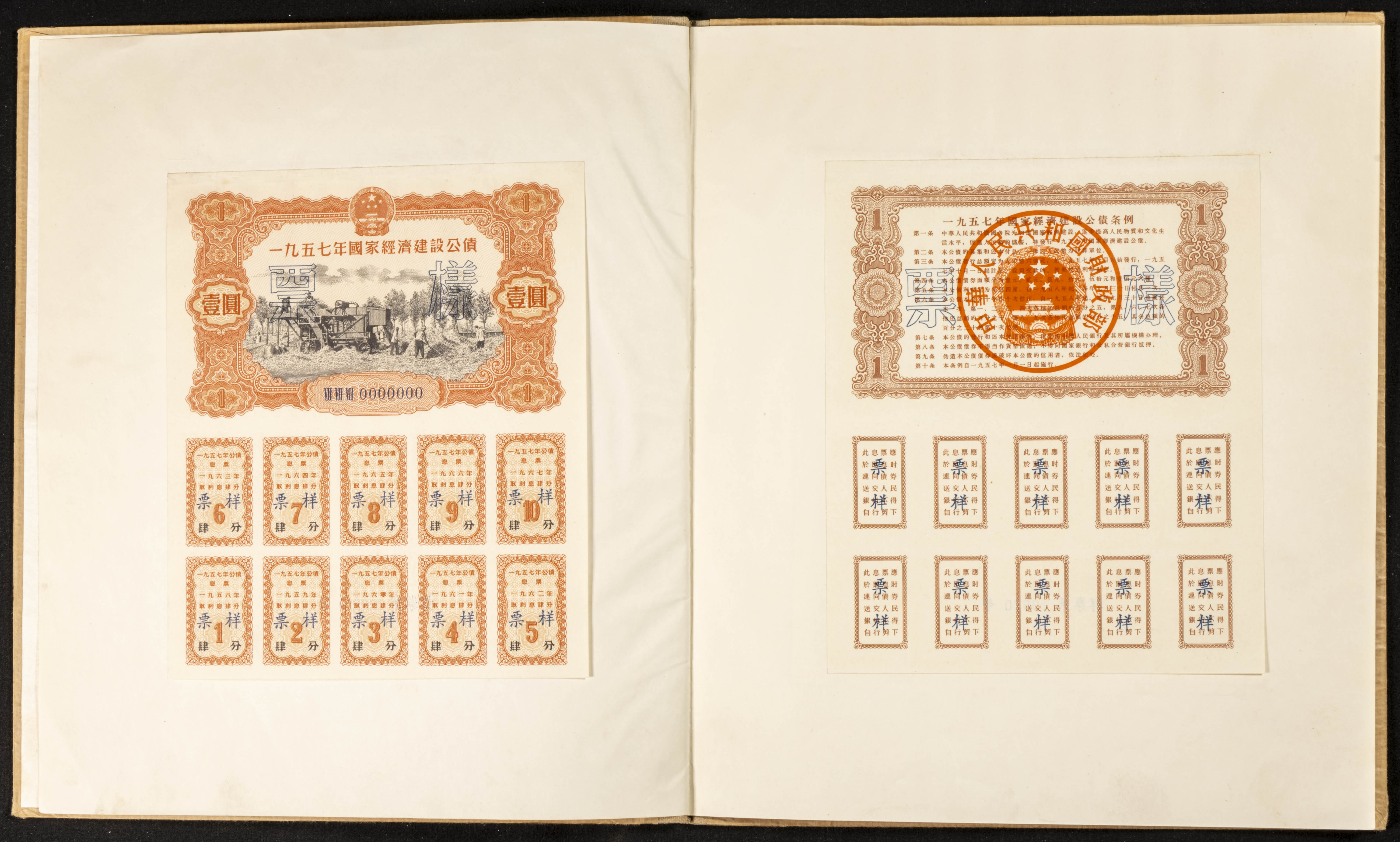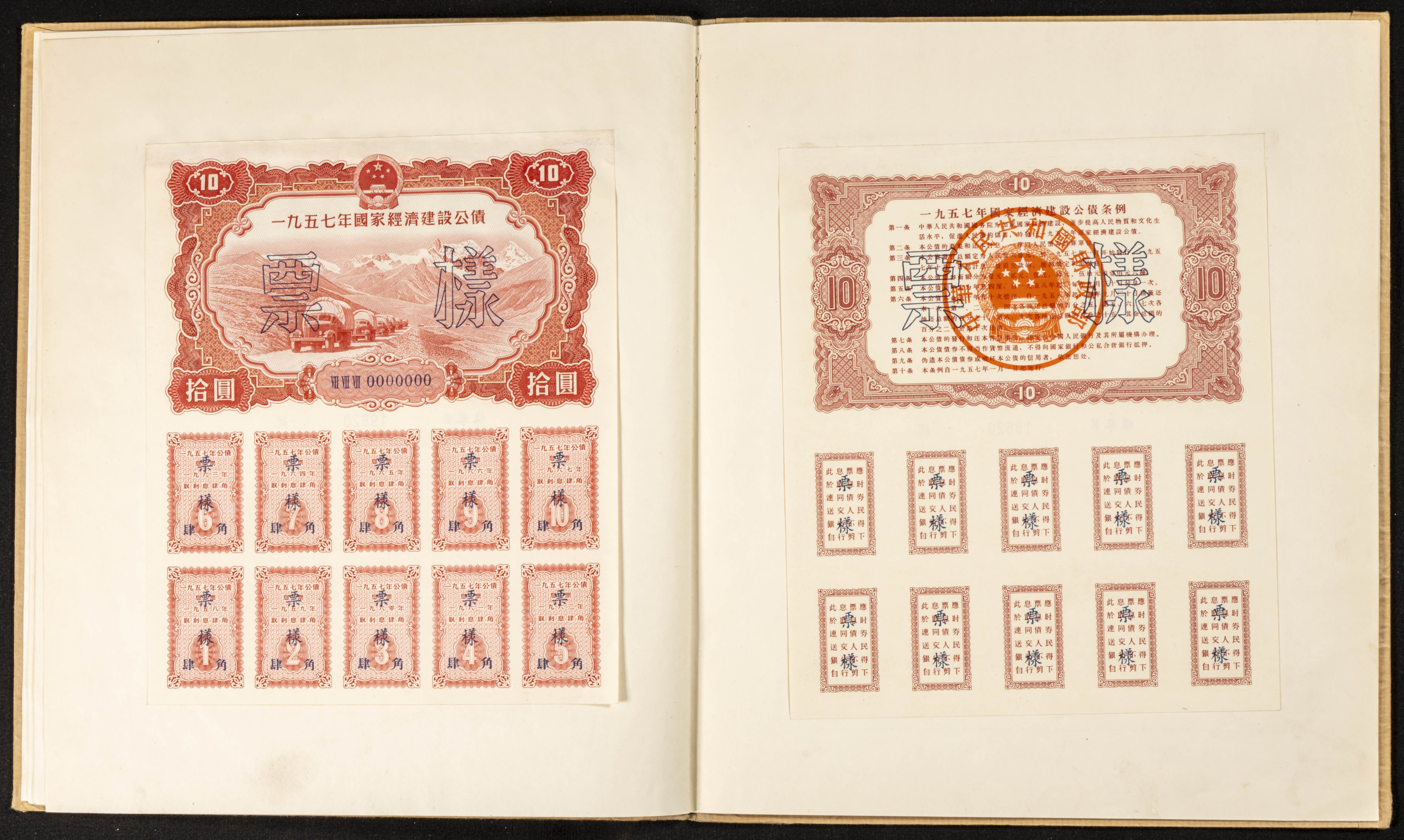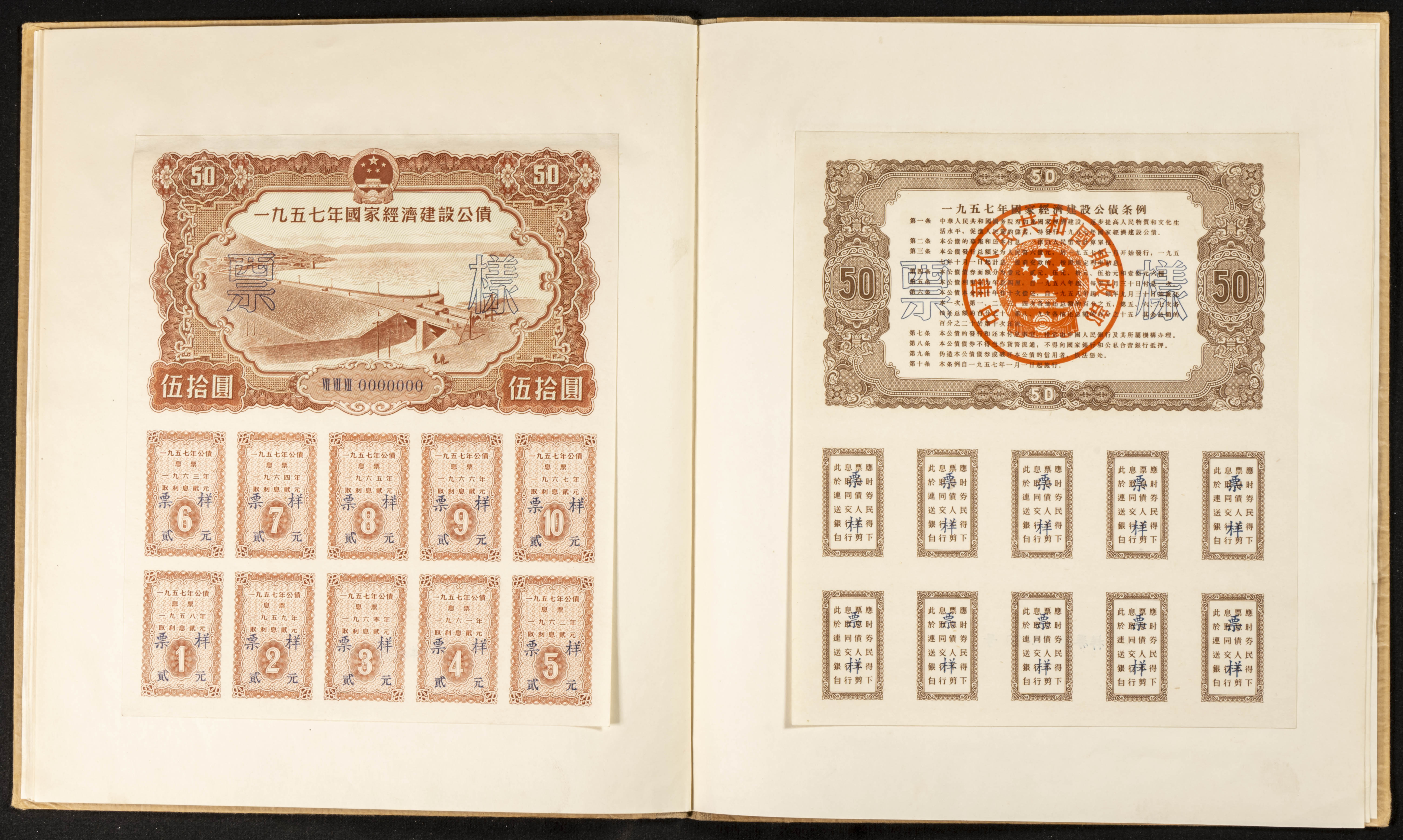 CHINA-BONDS. Lot of 12 note proofs. 1957. People’s Republic. National Economic Construction Government Bonds. Front and back proofs of 1, 2, 5, 10, 50 and 100 Yuan. All numbered on the reverse. (Pick: Unlisted). Notes mounted in the booklet by the top margin. Less than Uncirculated.