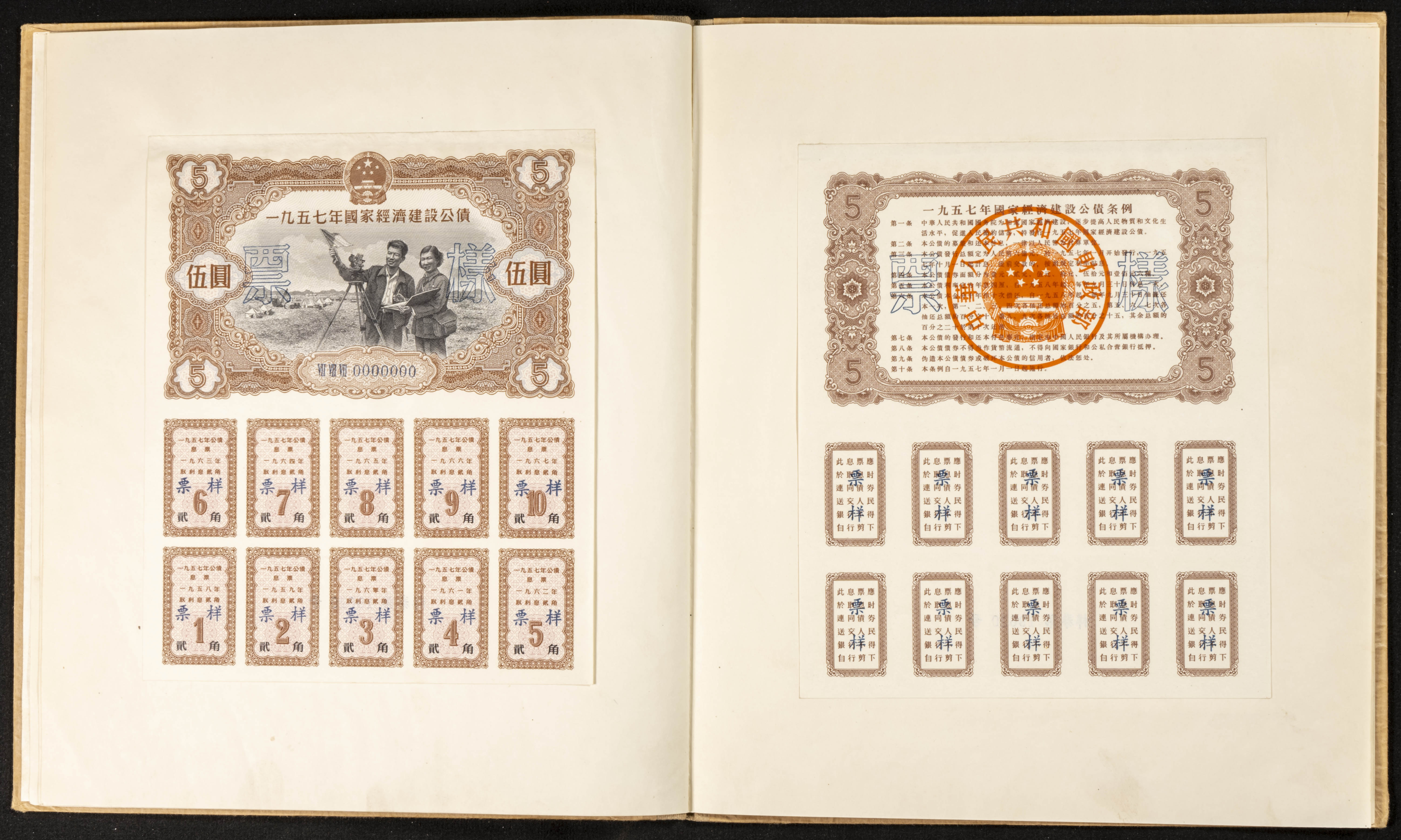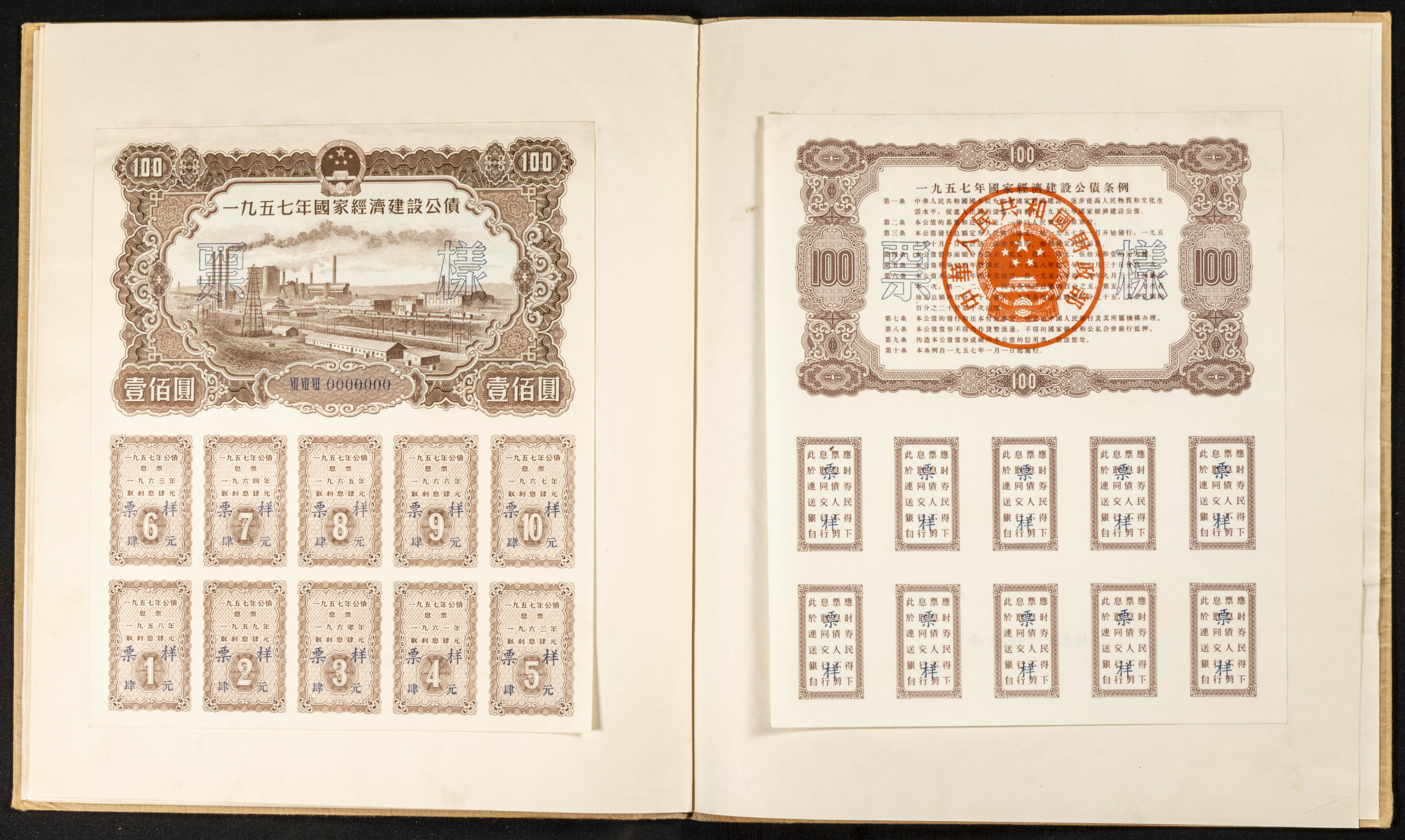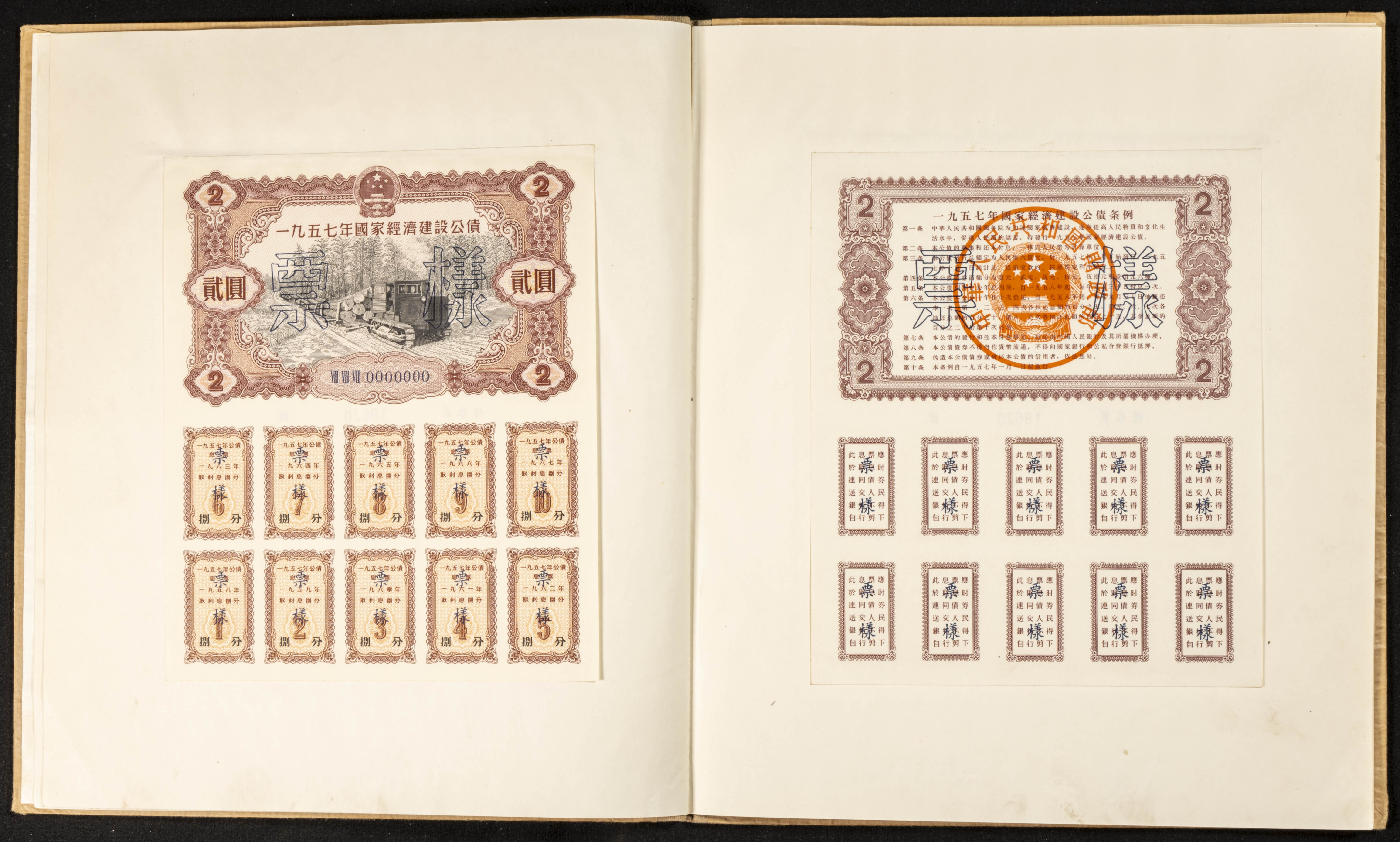 CHINA-BONDS. Lot of 12 note proofs. 1957. People’s Republic. National Economic Construction Government Bonds. Front and back proofs of 1, 2, 5, 10, 50 and 100 Yuan. All numbered on the reverse. (Pick: Unlisted). Notes mounted in the booklet by the top margin. Less than Uncirculated.