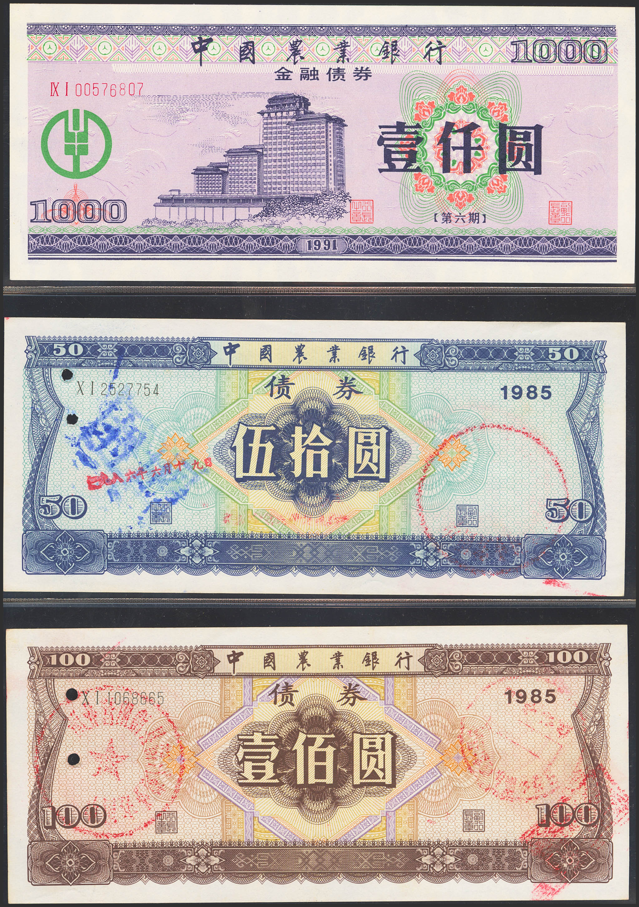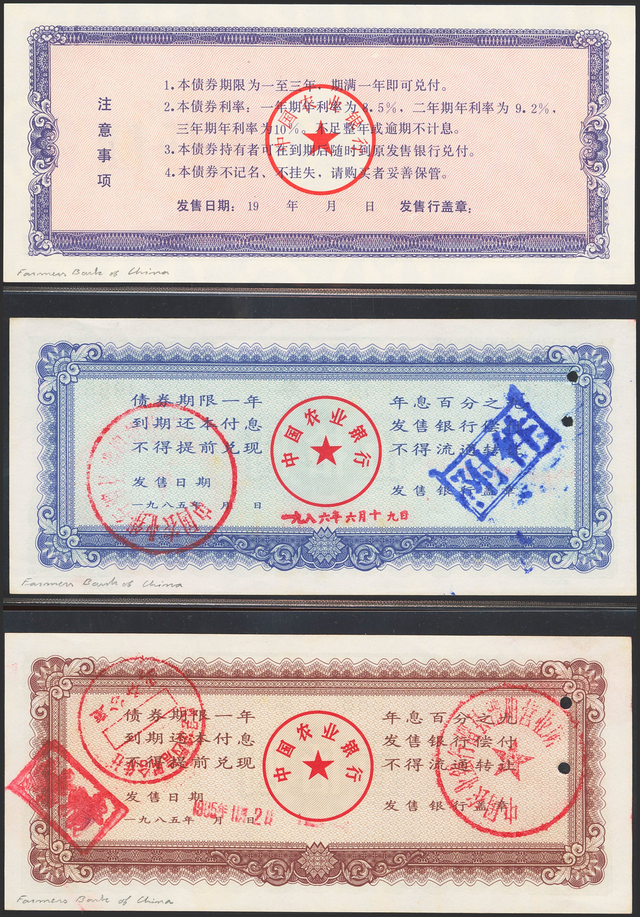 CHINA. Lot of 3 notes of Yuan. (1985ca). Farmers Bank Bonds. (Pick: Unlisted). About Uncirculated / Uncirculated.