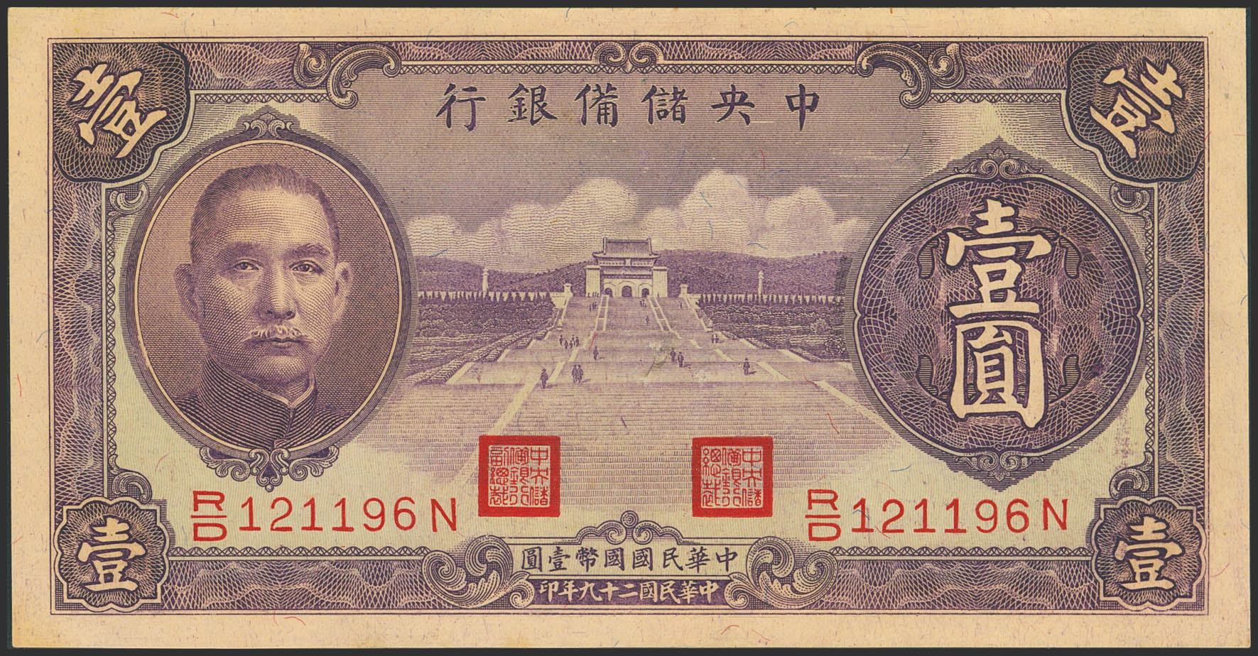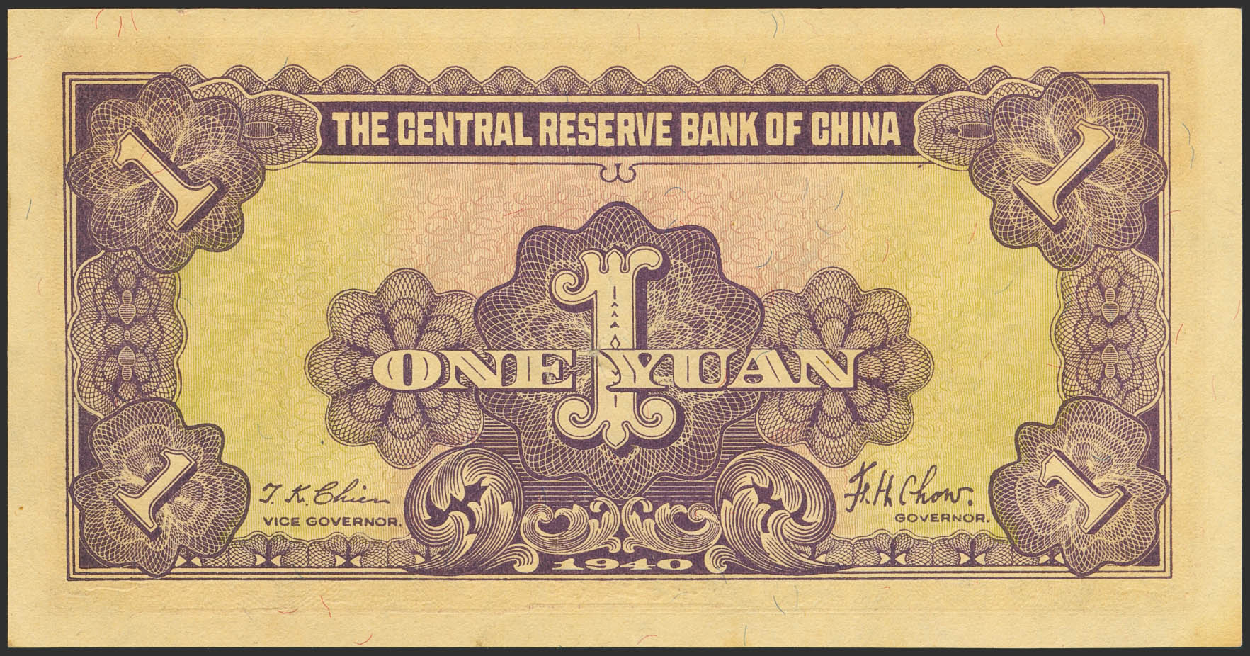 CHINA-PUPPET BANKS. 1 Yuan. 1940. Central Reserve Bank. (Pick: J9c). Pinhole. Almost Uncirculated.