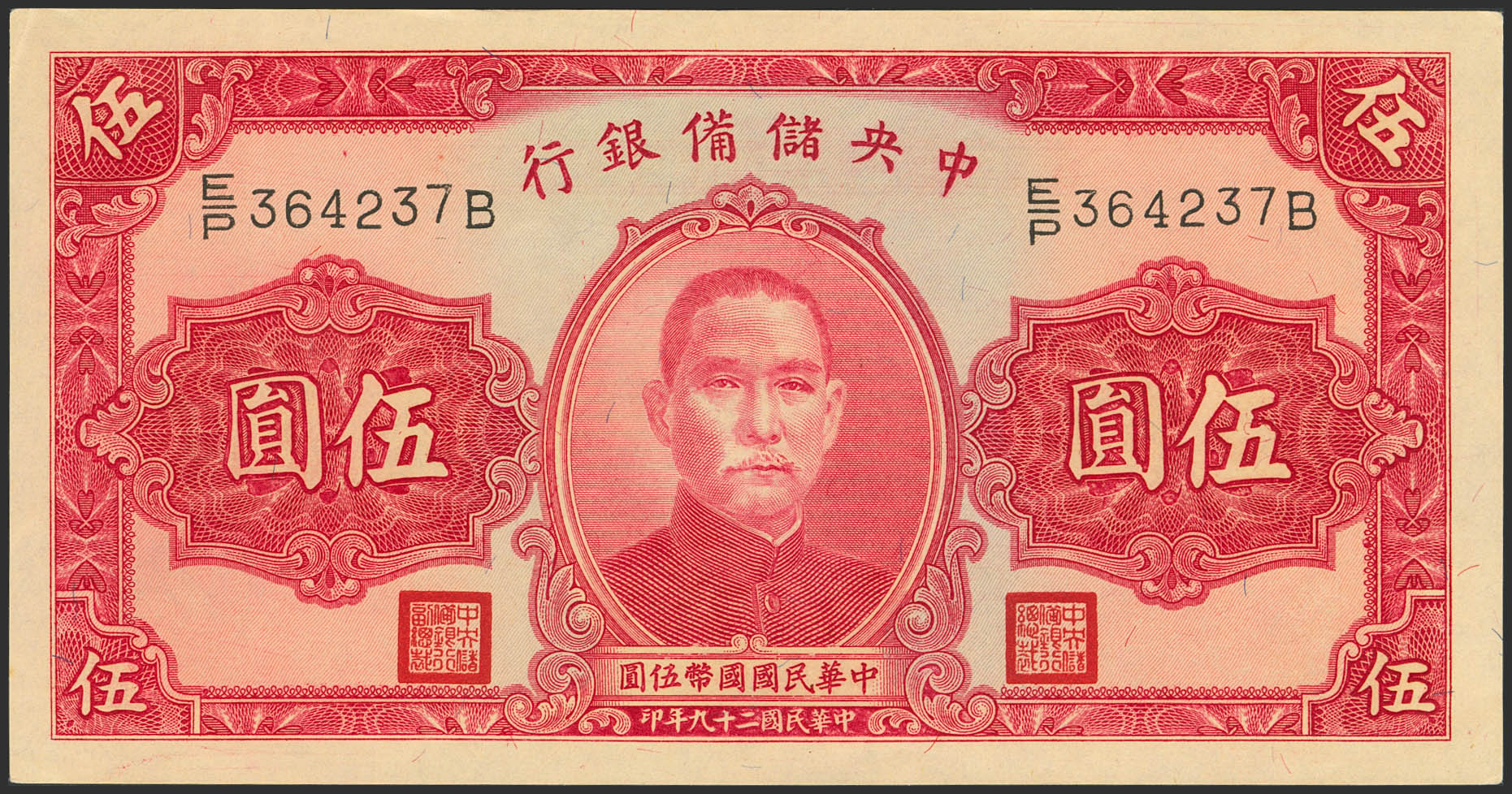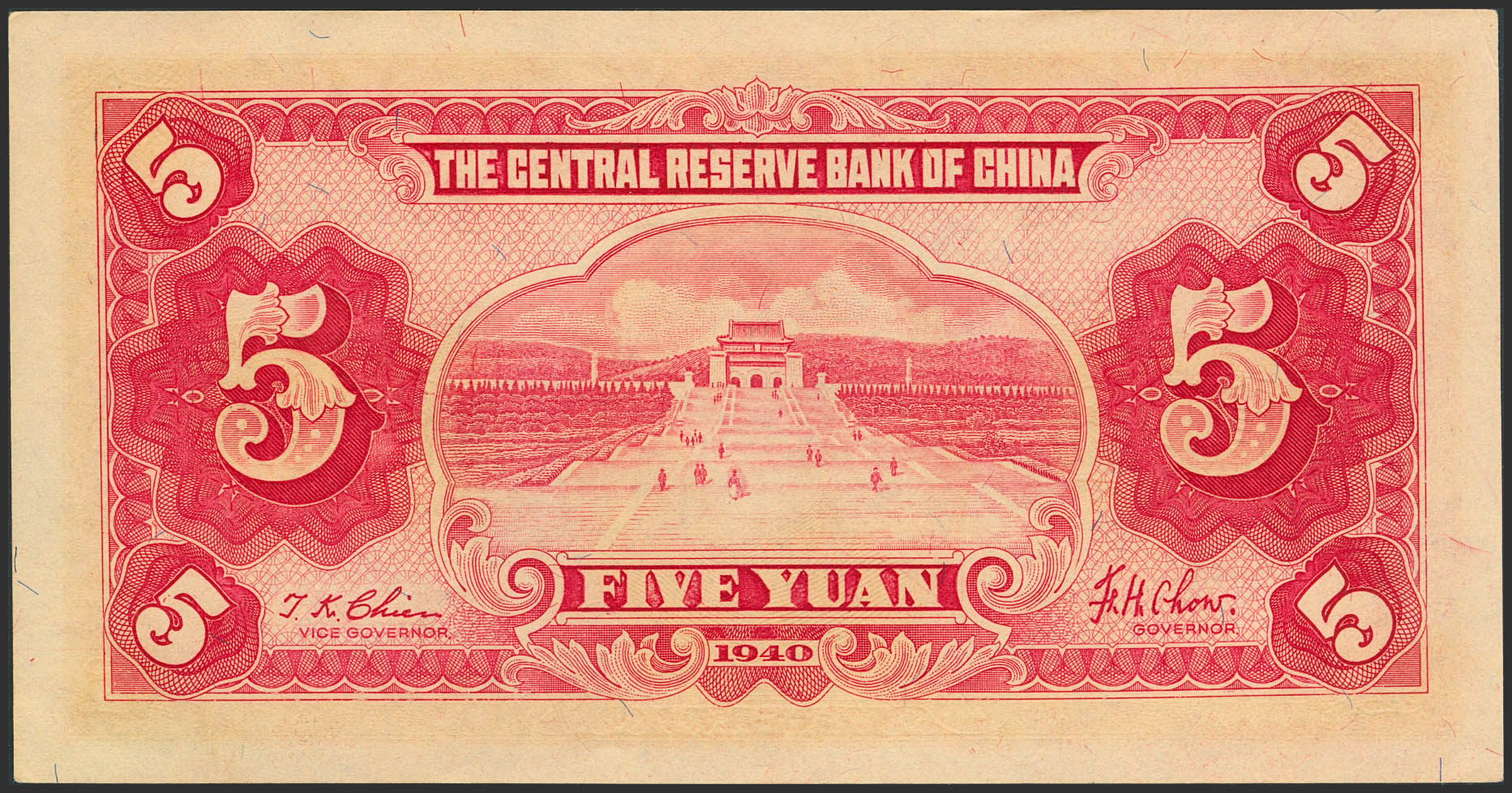 CHINA-PUPPET BANKS. 5 Yuan. 1940. Central Reserve Bank. (Pick: J10e). More than Extremely Fine.