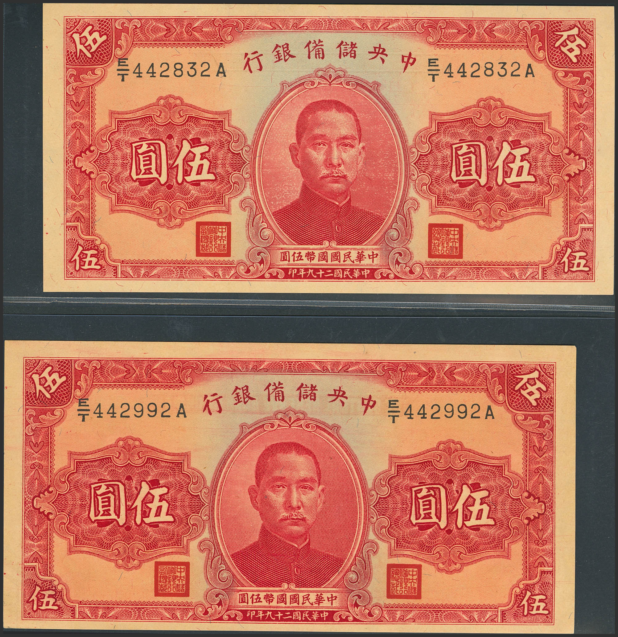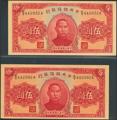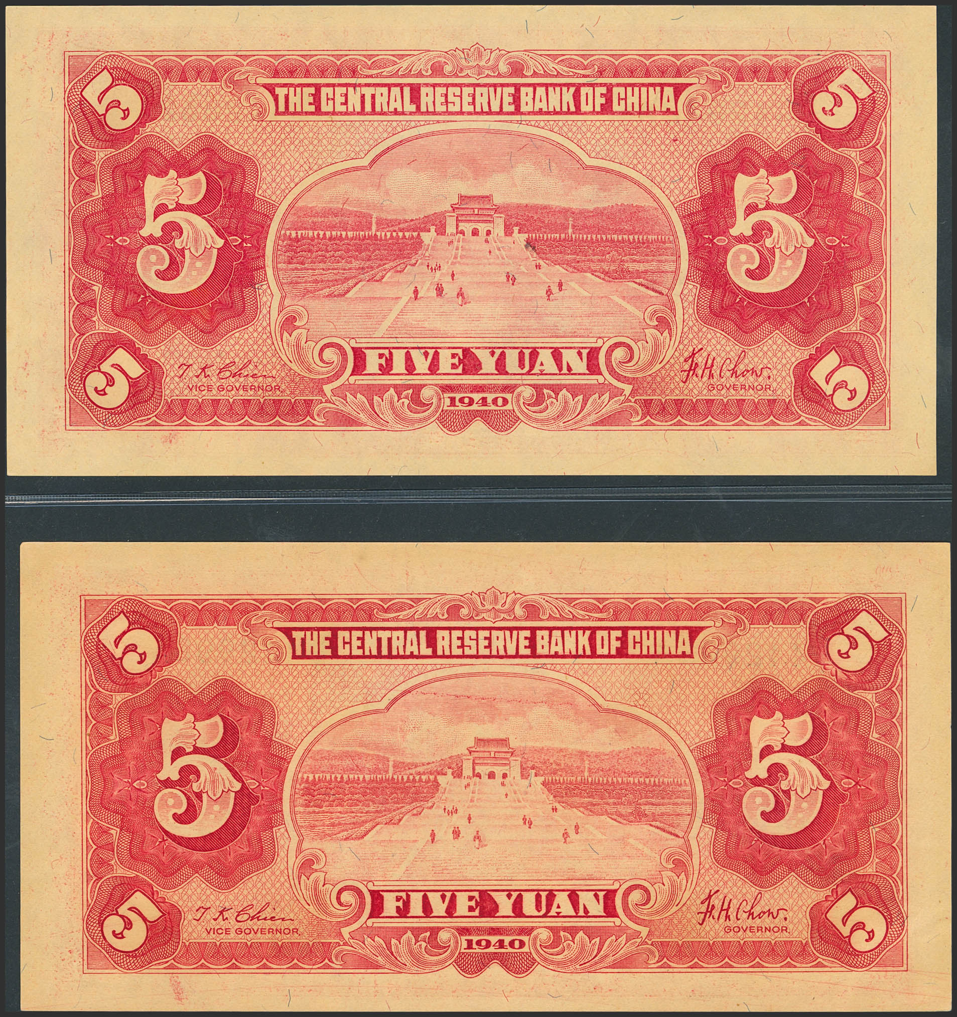 CHINA-PUPPET BANKS. Lot of 2 notes of 5 Yuan. 1940. Central Reserve Bank. (Pick: J10e). Extremely Fine and About Uncirculated.