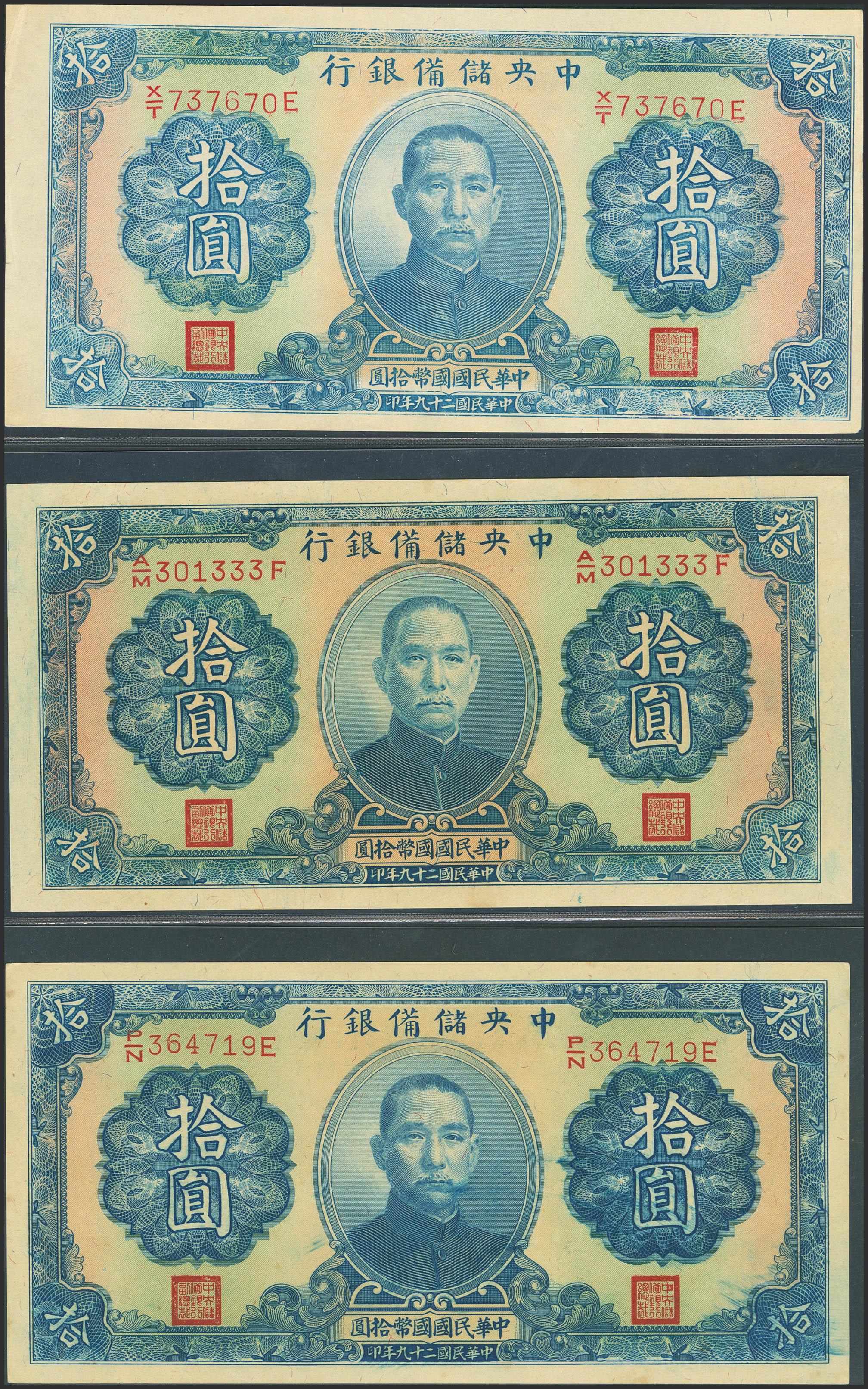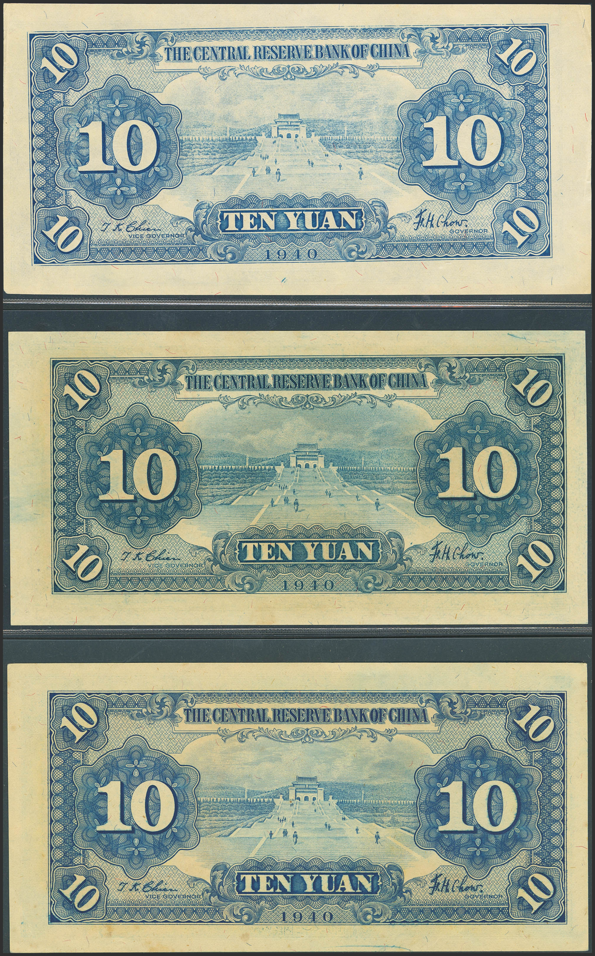 CHINA-PUPPET BANKS. Lot of 3 notes of 10 Yuan. 1940. Central Reserve Bank. (Pick: J12h). Uncirculated (1) and Less than Uncirculated (2).
