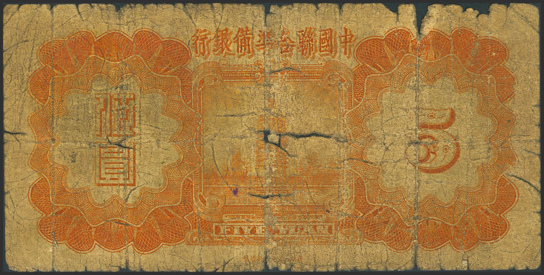CHINA-PUPPET BANKS. 5 Yuan. 1938. Federal Reserve Bank. (Pick: J62a). Severe damage. Good