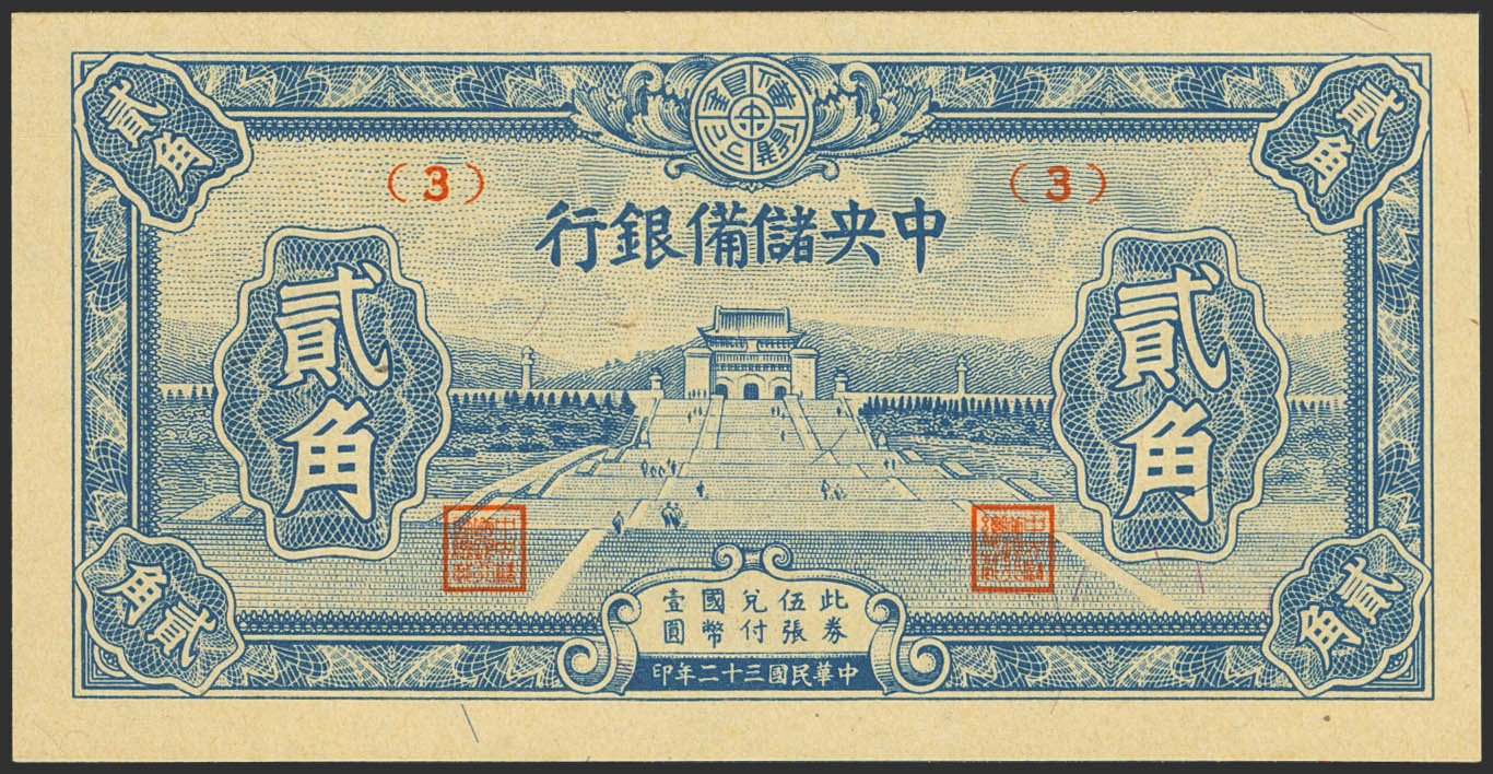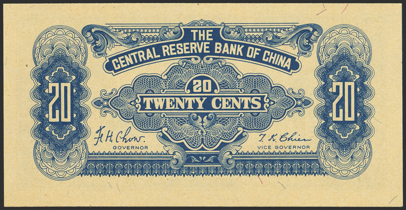 CHINA-PUPPET BANKS. 20 Cents. 1943. Central Reserve Bank. (Pick: J17a). Less than Uncirculated.