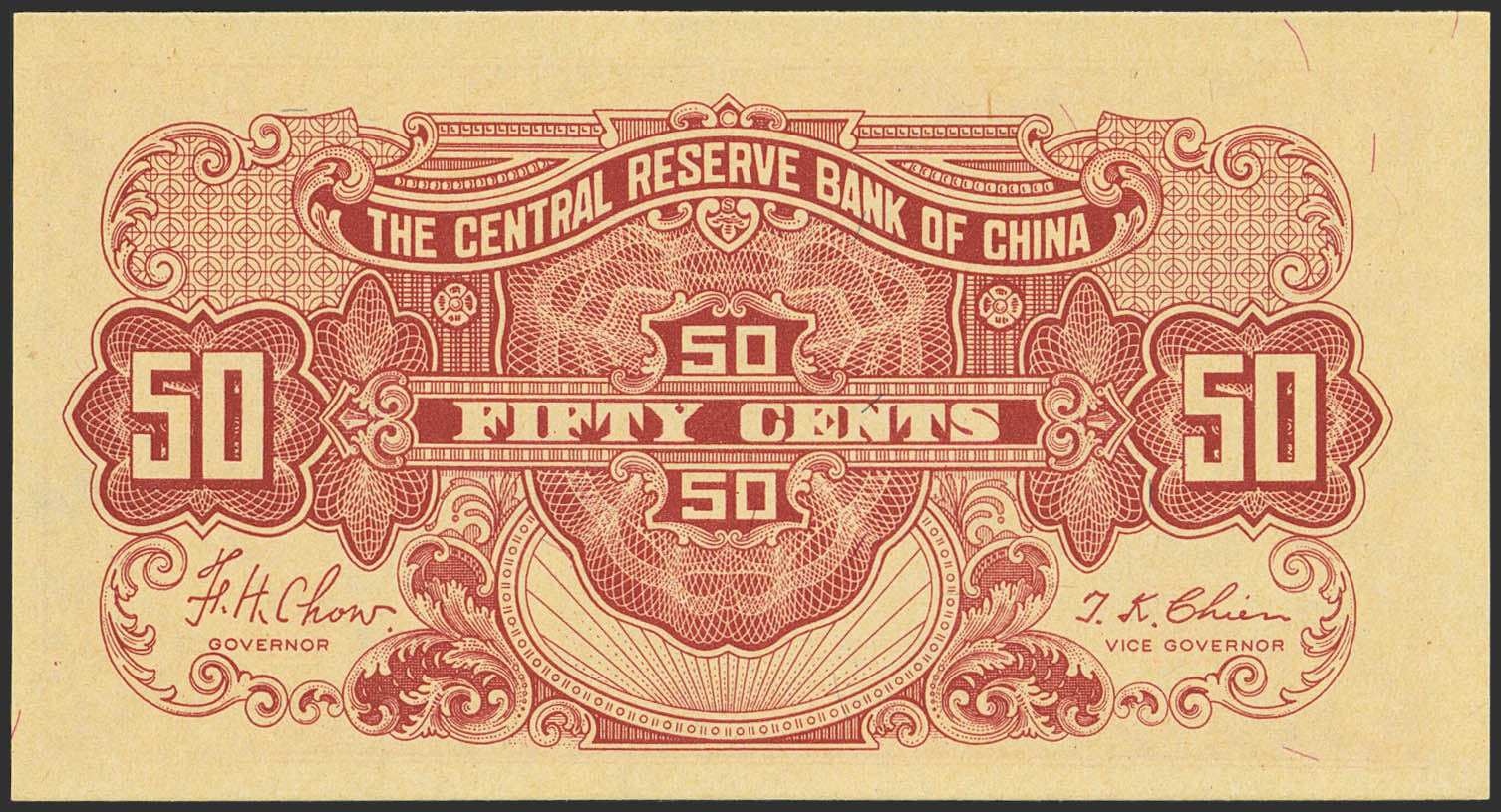 CHINA-PUPPET BANKS. 50 Cents. 1943. Central Reserve Bank. (Pick: J18b). Less than Uncirculated.