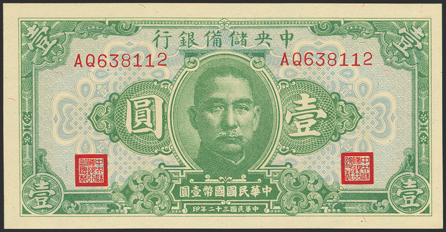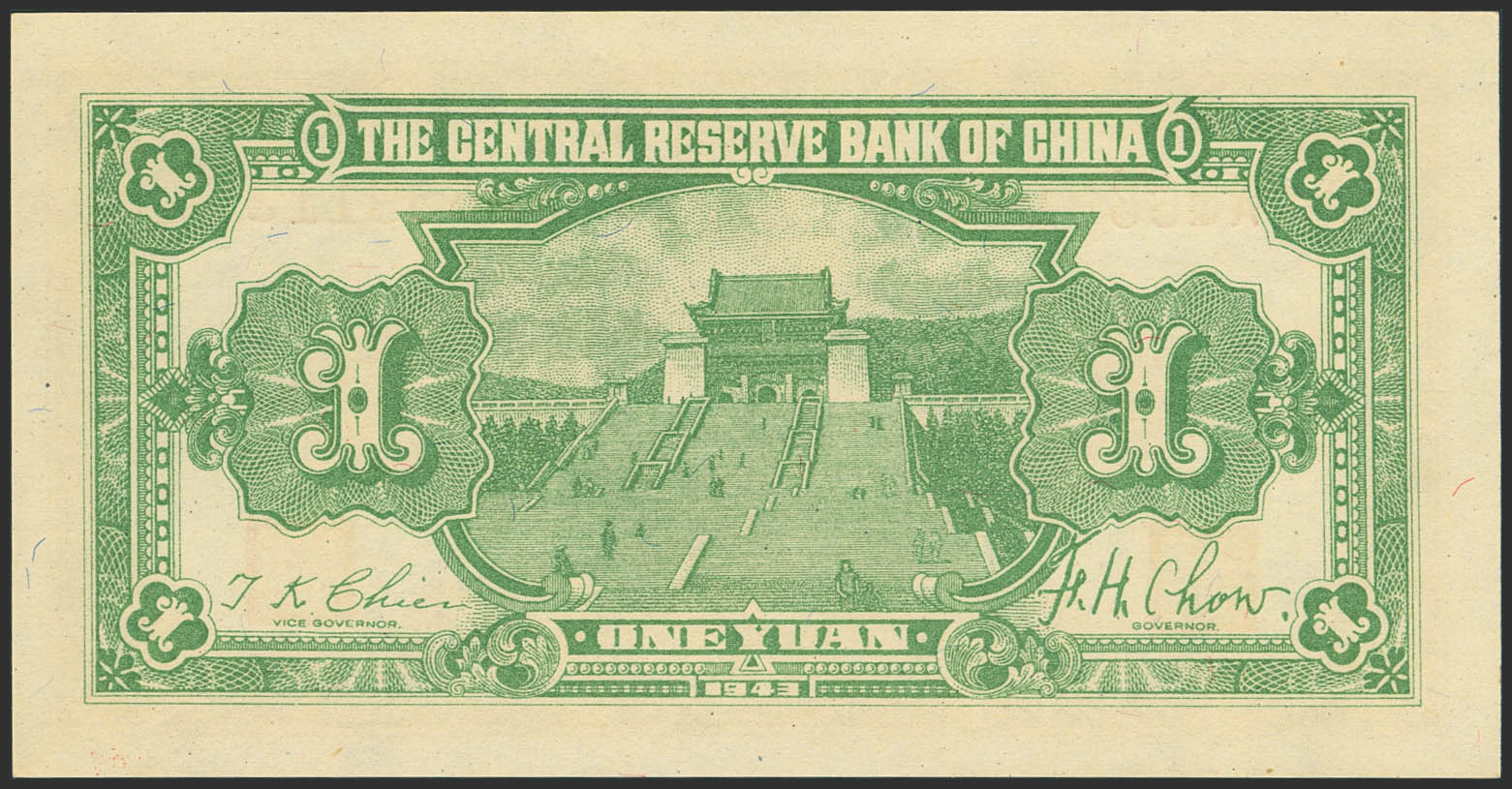 CHINA-PUPPET BANKS. 1 Yuan. 1943. Central Reserve Bank. (Pick: J19a). Less than Uncirculated.