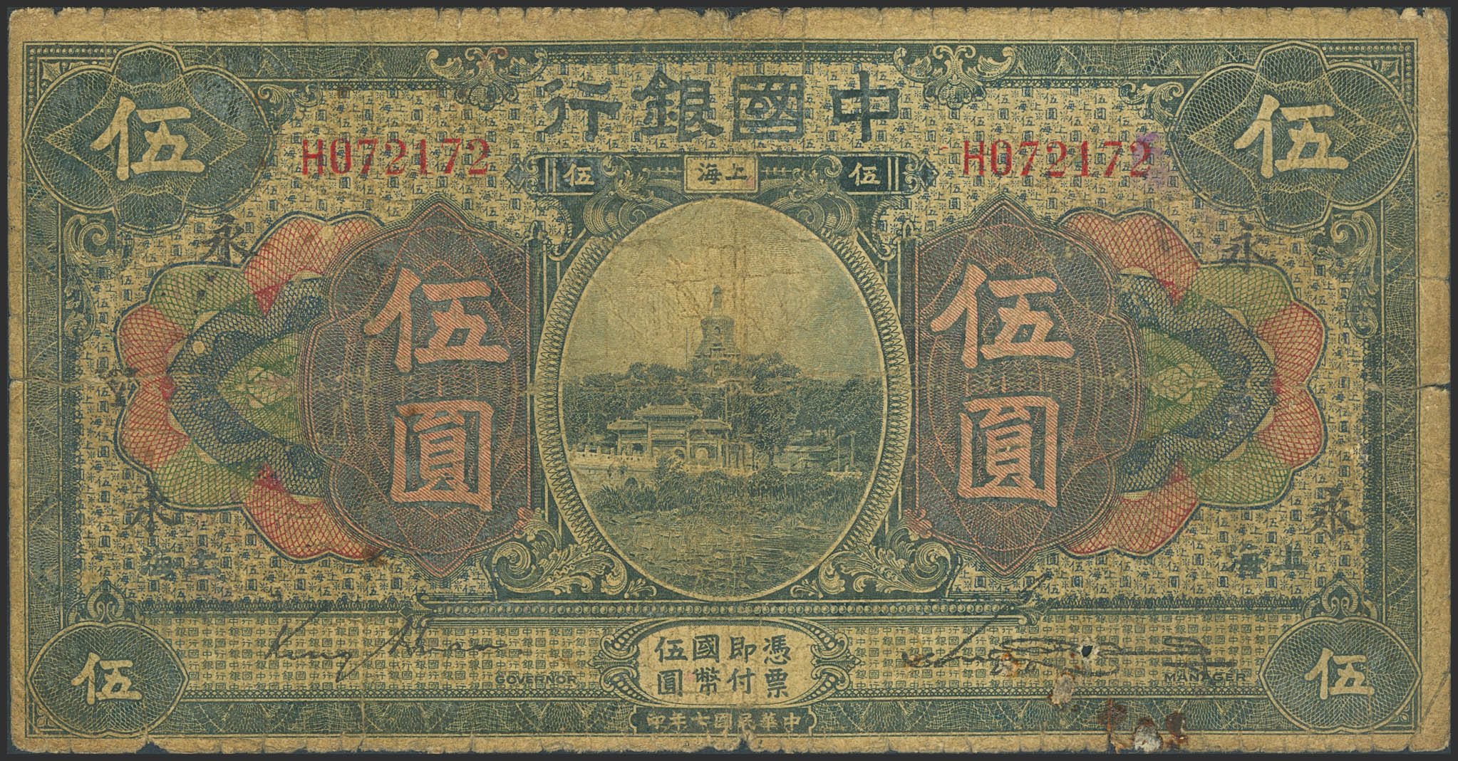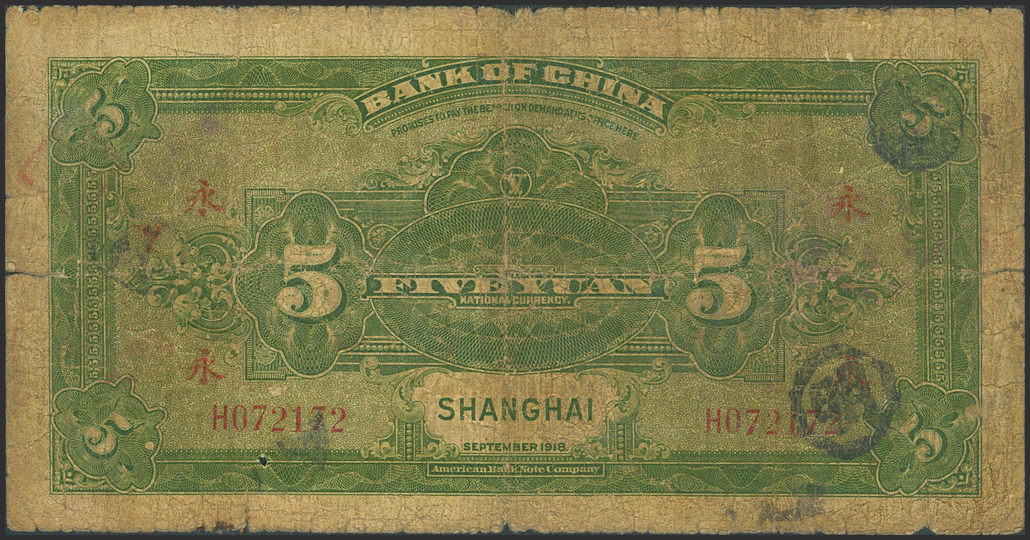 CHINA. 5 Yuan. September 1918. Bank of China. Shanghai. Jin Hai / Sung Hang-Chang. (Pick: 52k). Very Good.