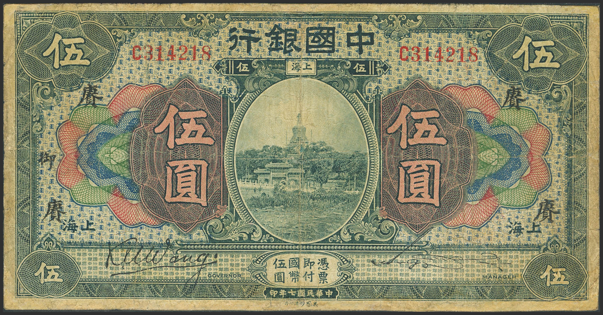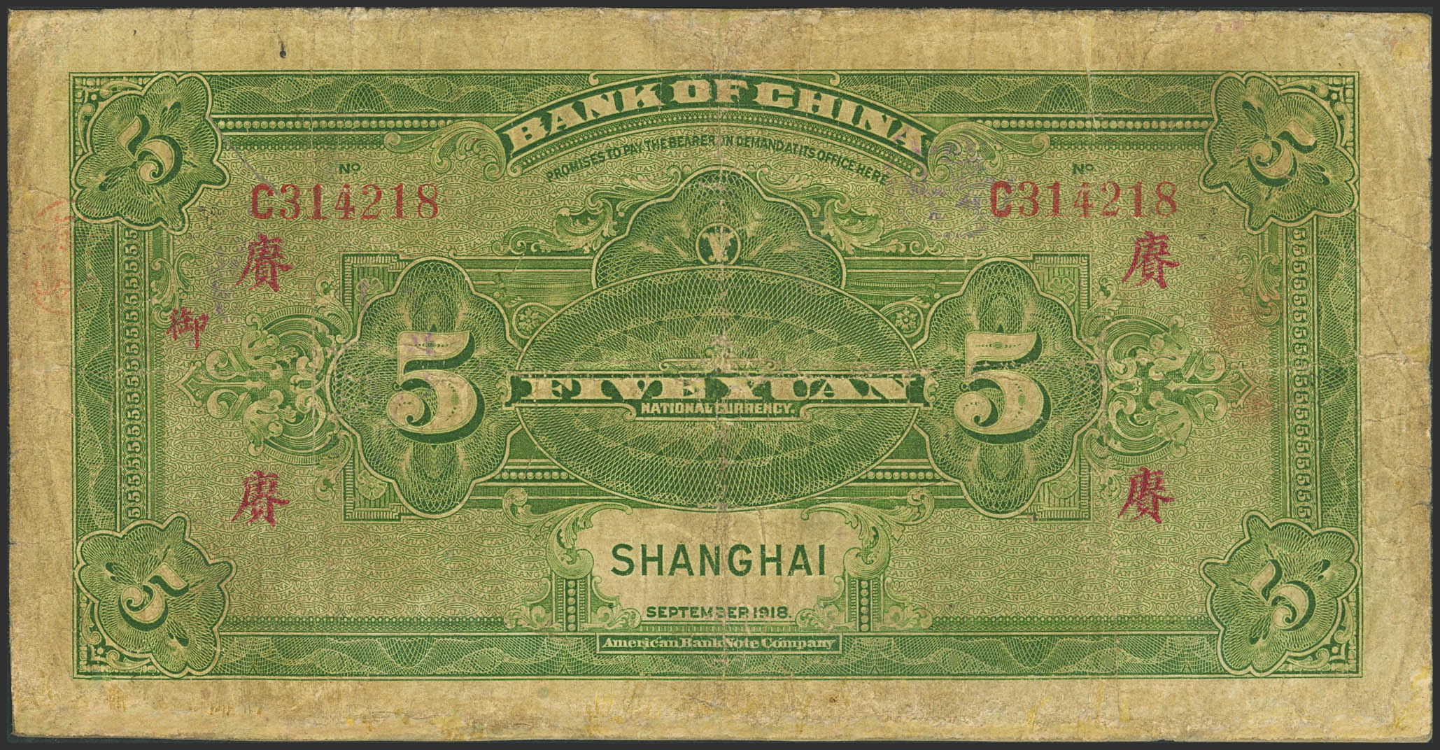 CHINA. 5 Yuan. September 1918. Bank of China. Shanghai. Wang Kemin / Sung Hang-Chang. (Pick: 52k). Fine.