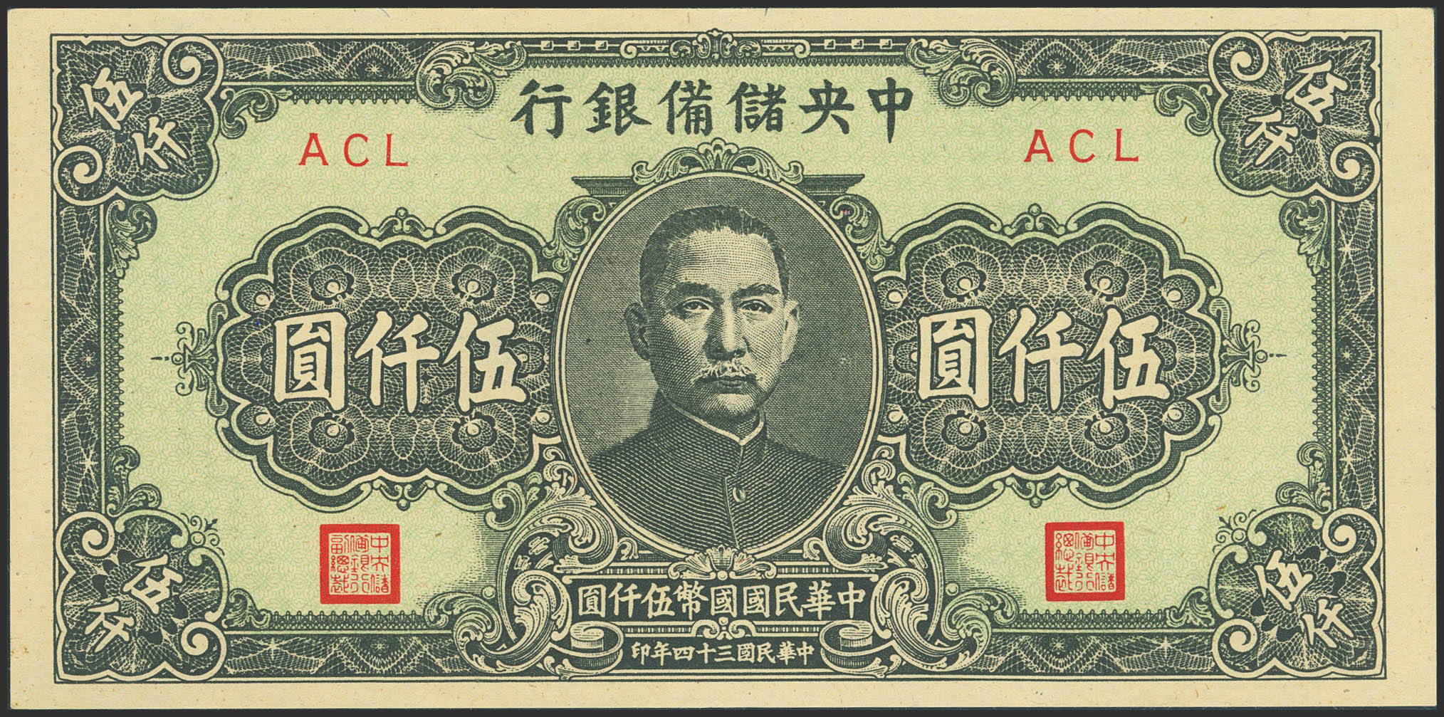 CHINA-PUPPET BANKS. 5000 Yuan. 1945. Central Reserve Bank. (Pick: J41a). Almost Uncirculated.