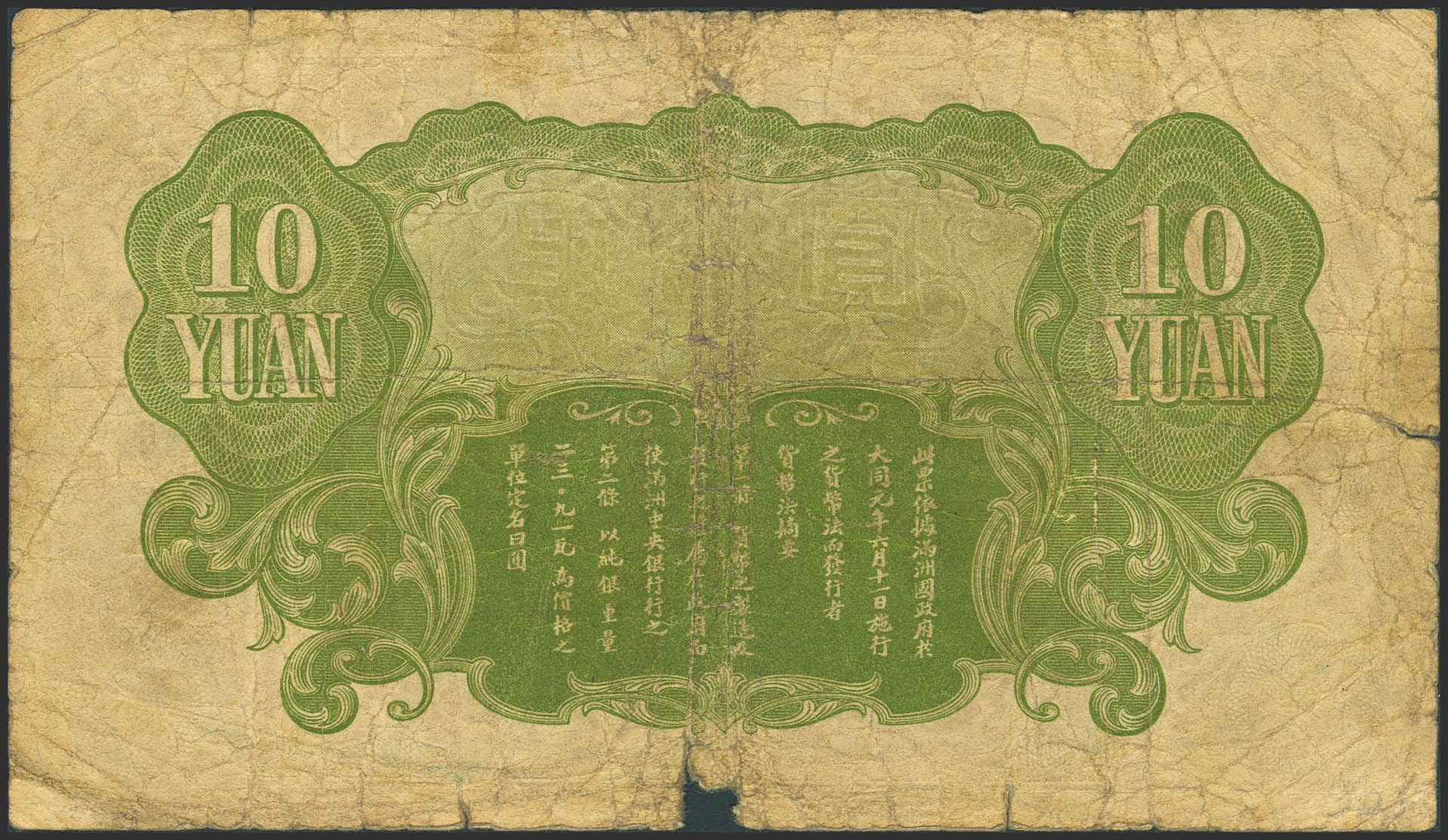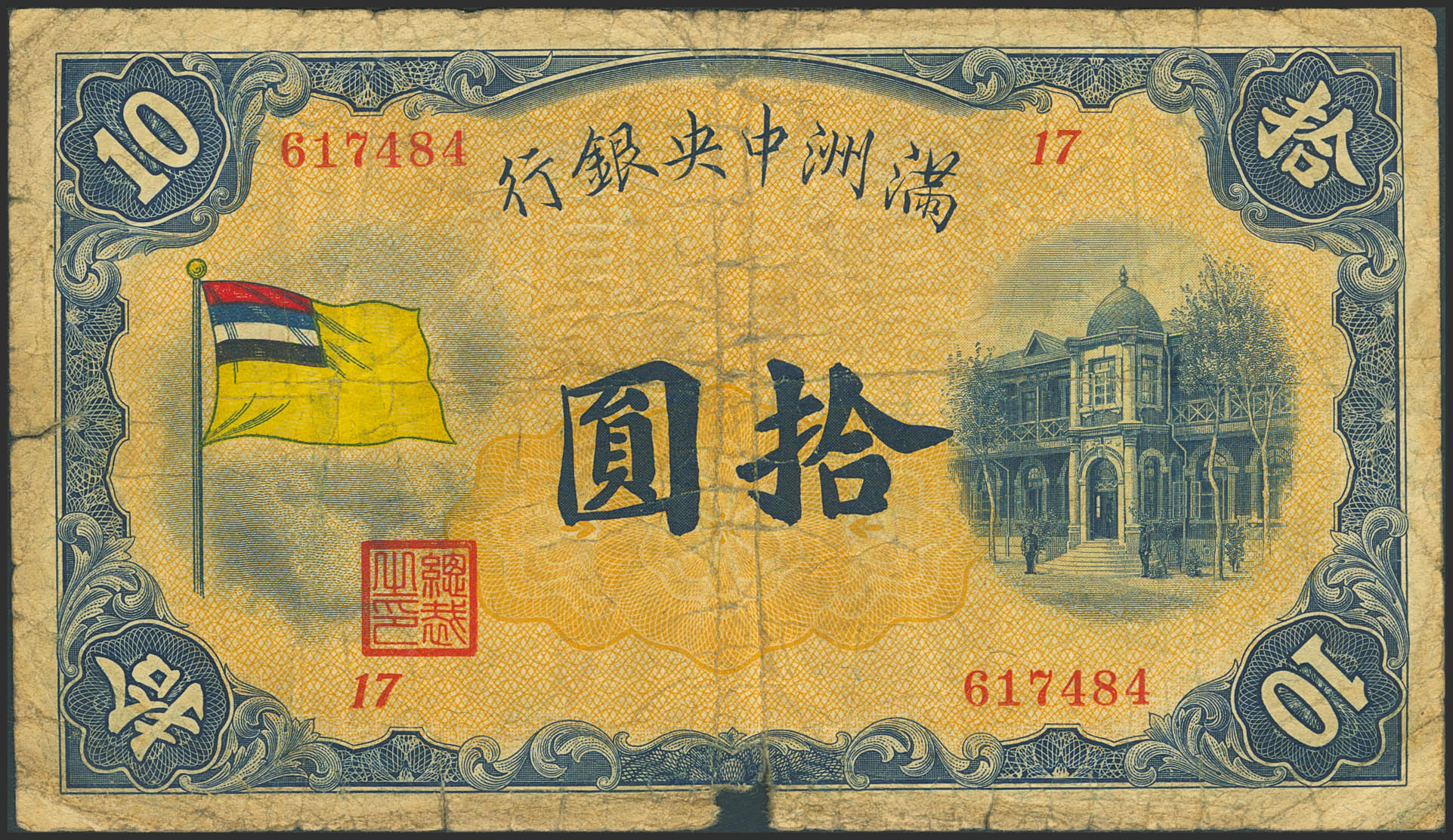 CHINA-MANCHUKUO. 10 Yuan. (1932ca). Central Bank of Manchukuo. (Pick: J127a). Missing piece from bottom margin and tears. Very Good.