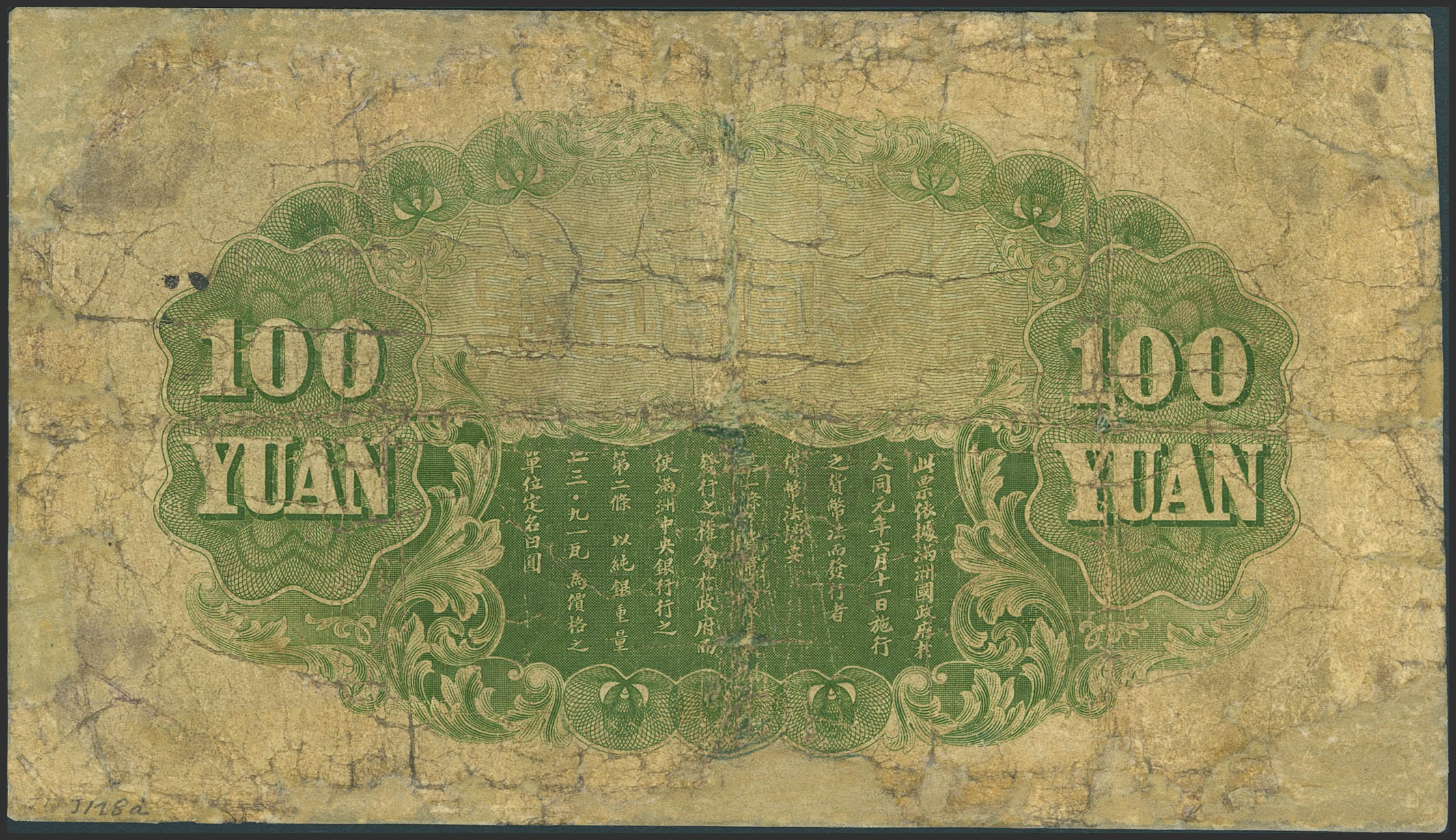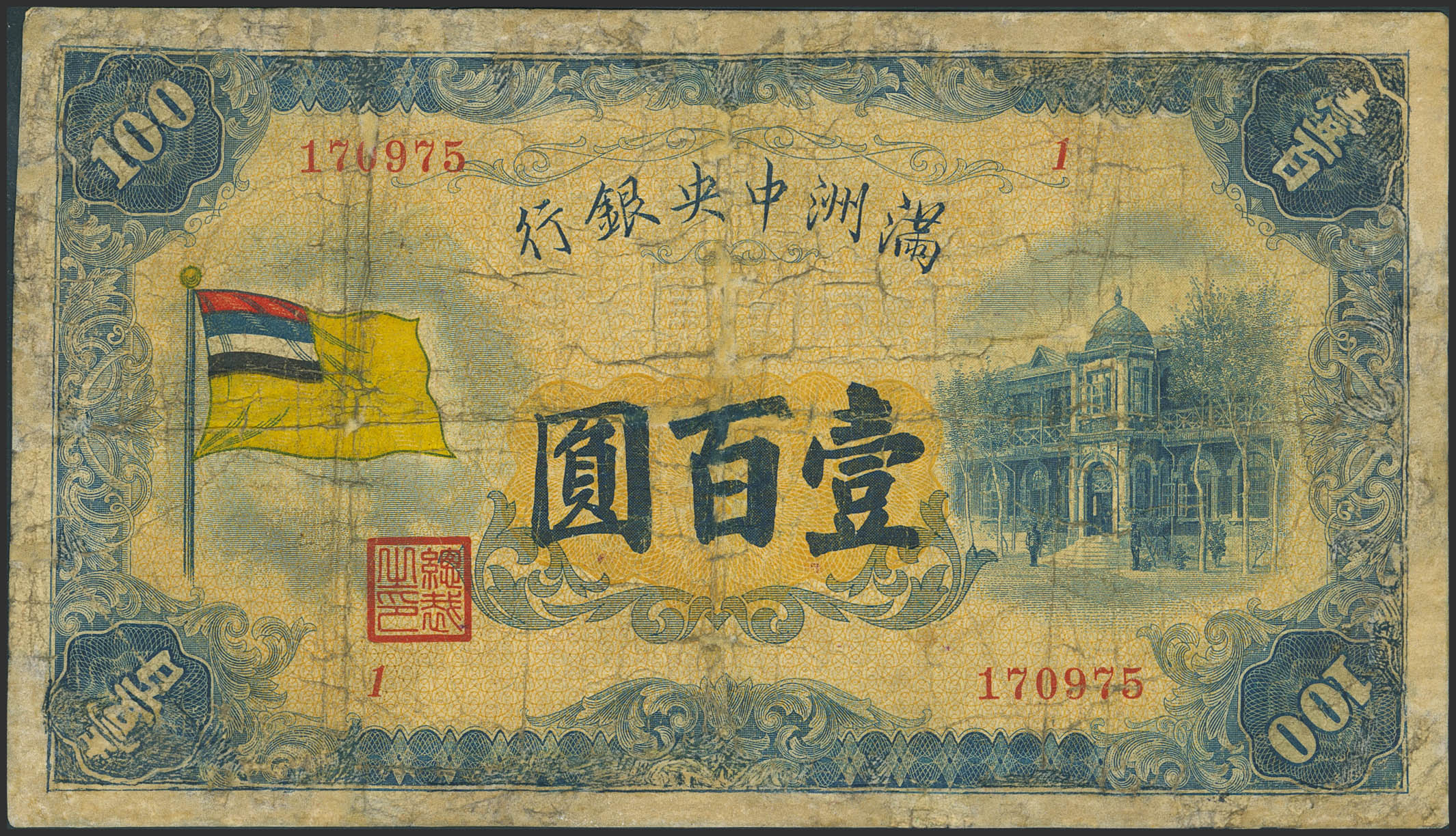 CHINA-MANCHUKUO. 100 Yuan. (1933ca). Central Bank of Manchukuo. (Pick: J128a). Severe restoration. Very Good.