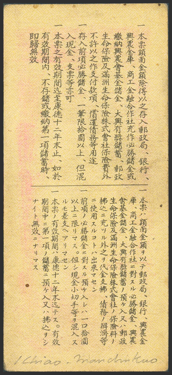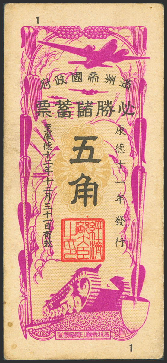 CHINA-MANCHUKUO. 50 Cents. Redemption date 31 December 1945. Manchukuo Imperial Government. Victory Saving bond. (Pick: Unlisted. S/M: P41-1). Less than Uncirculated.
