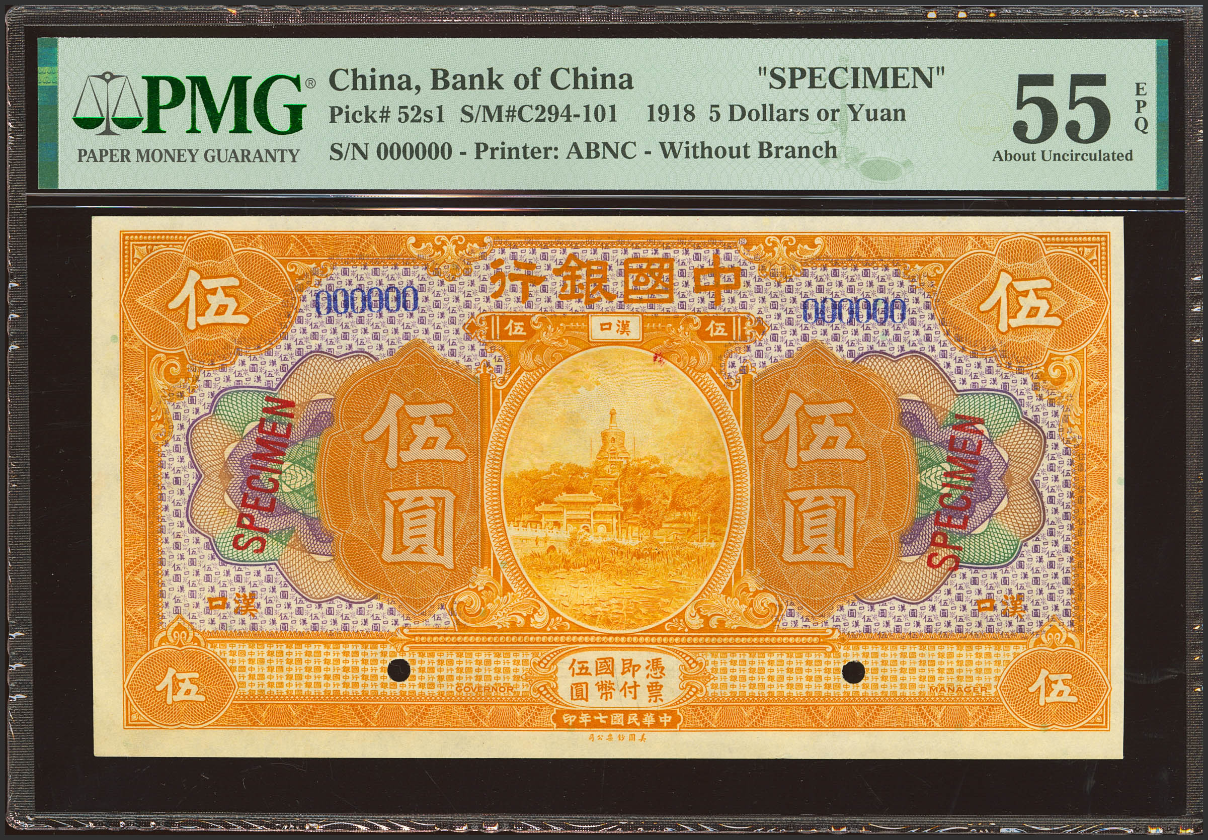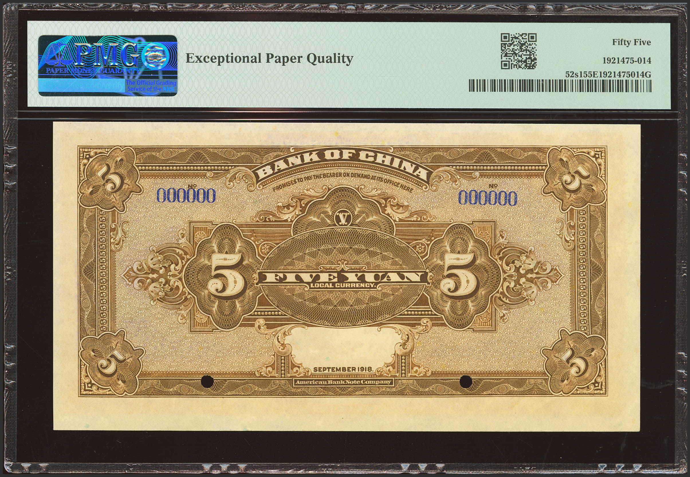 CHINA. 5 Yuan. September 1918. Bank of China. Specimen. (Pick: 52fs, SM: C294-101). PMG55EPQ.