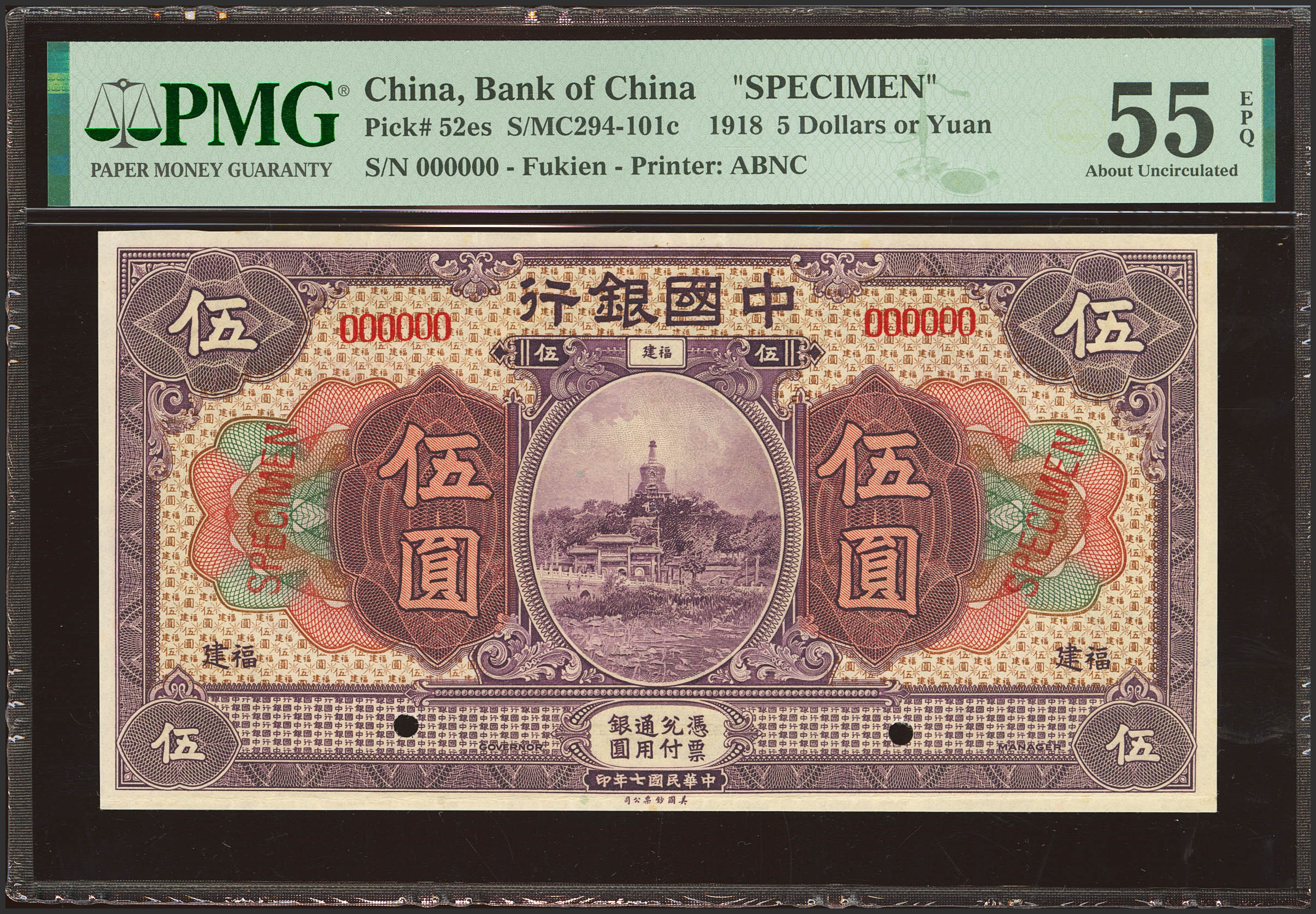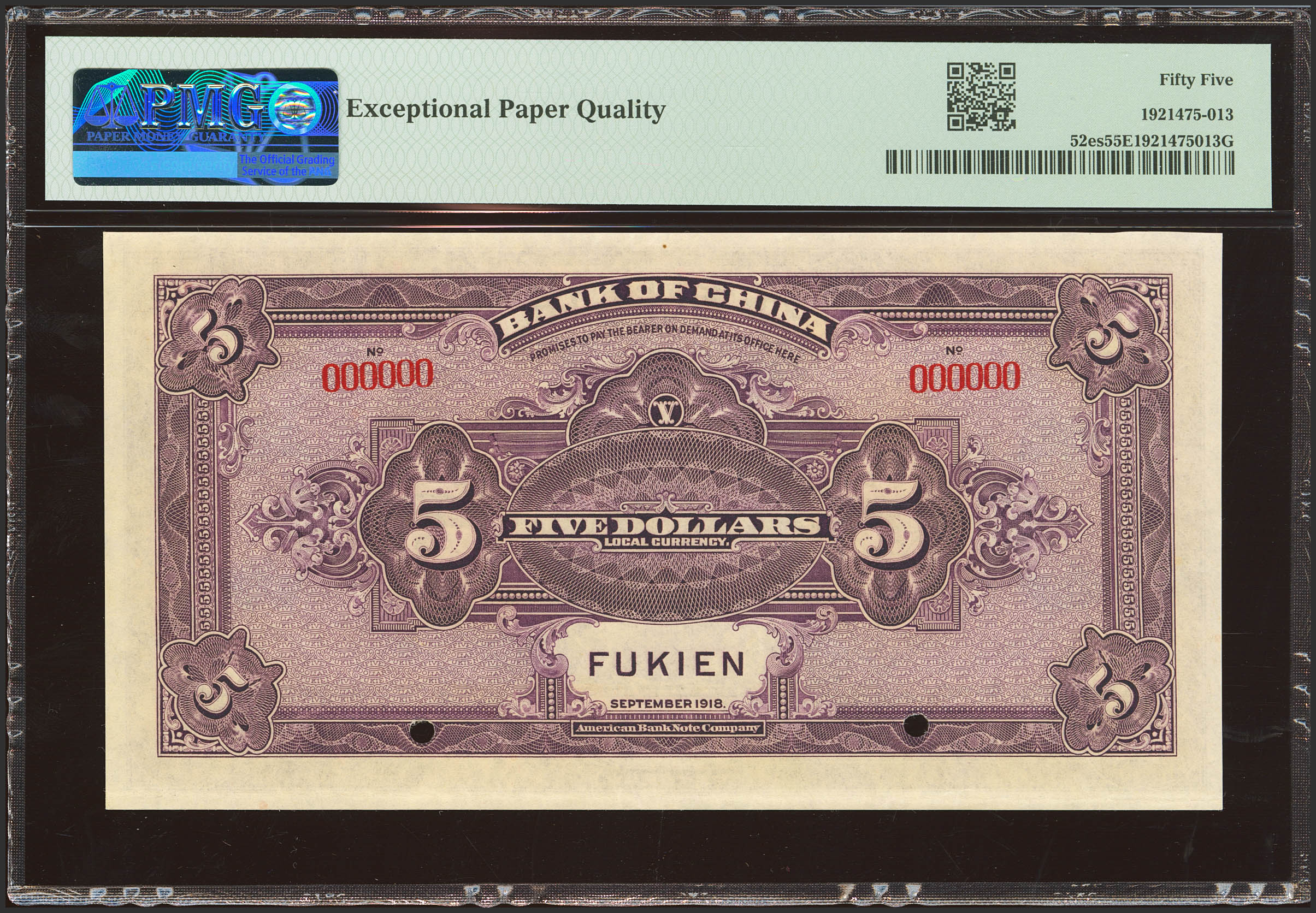 CHINA. 5 Dollars. September 1918. Bank of China. Fukien. Specimen. (Pick: 52es, SM: S294-101c). PMG55EPQ.