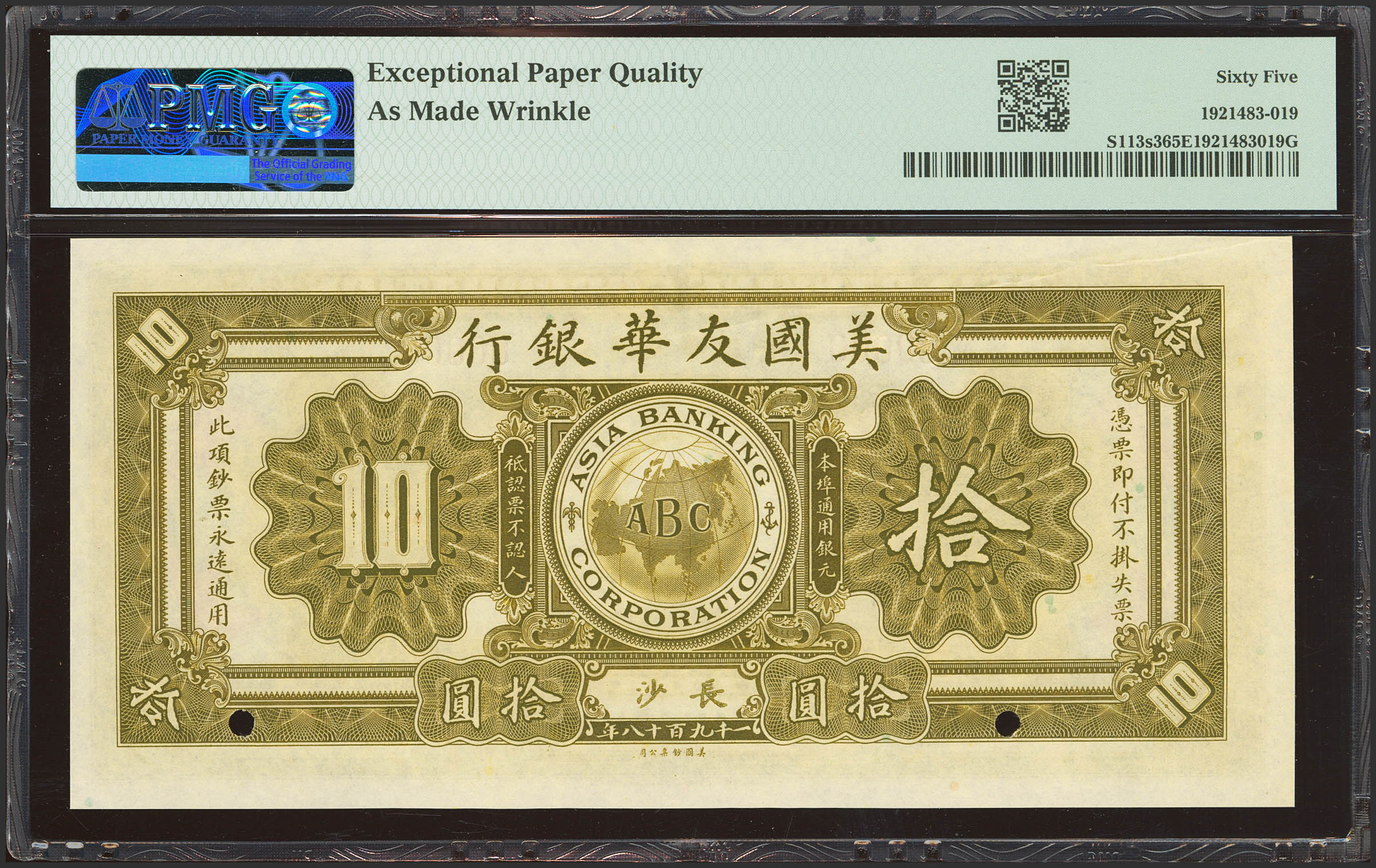 CHINA. 10 Dollars. 1918. Asia Banking Corporation. Changsha. Specimen. (Pick: S113s3, SM: Y35-3). PMG65EPQ.