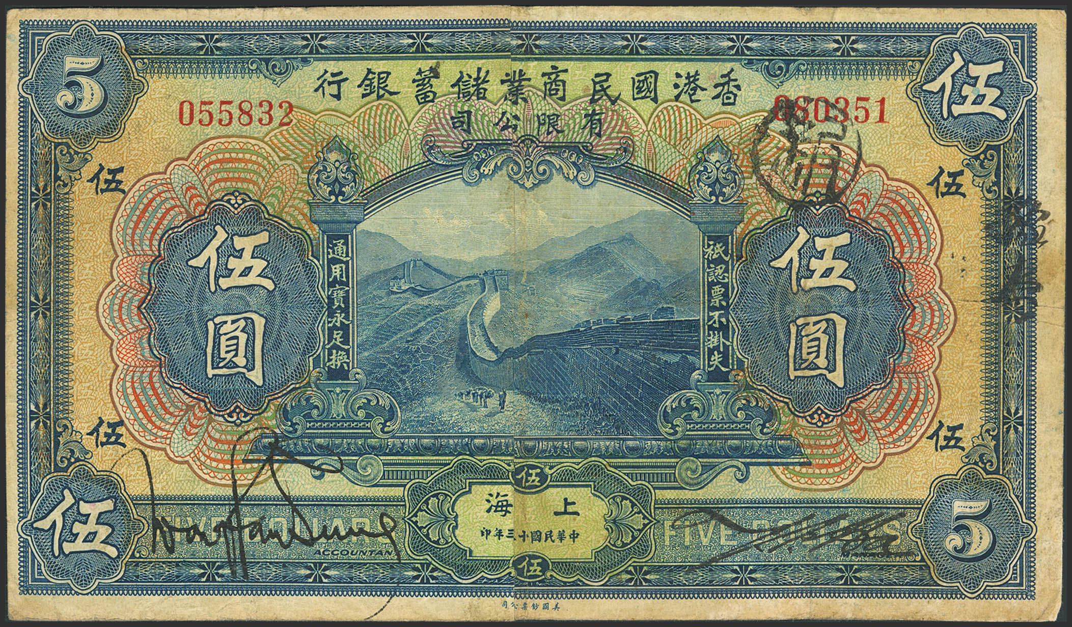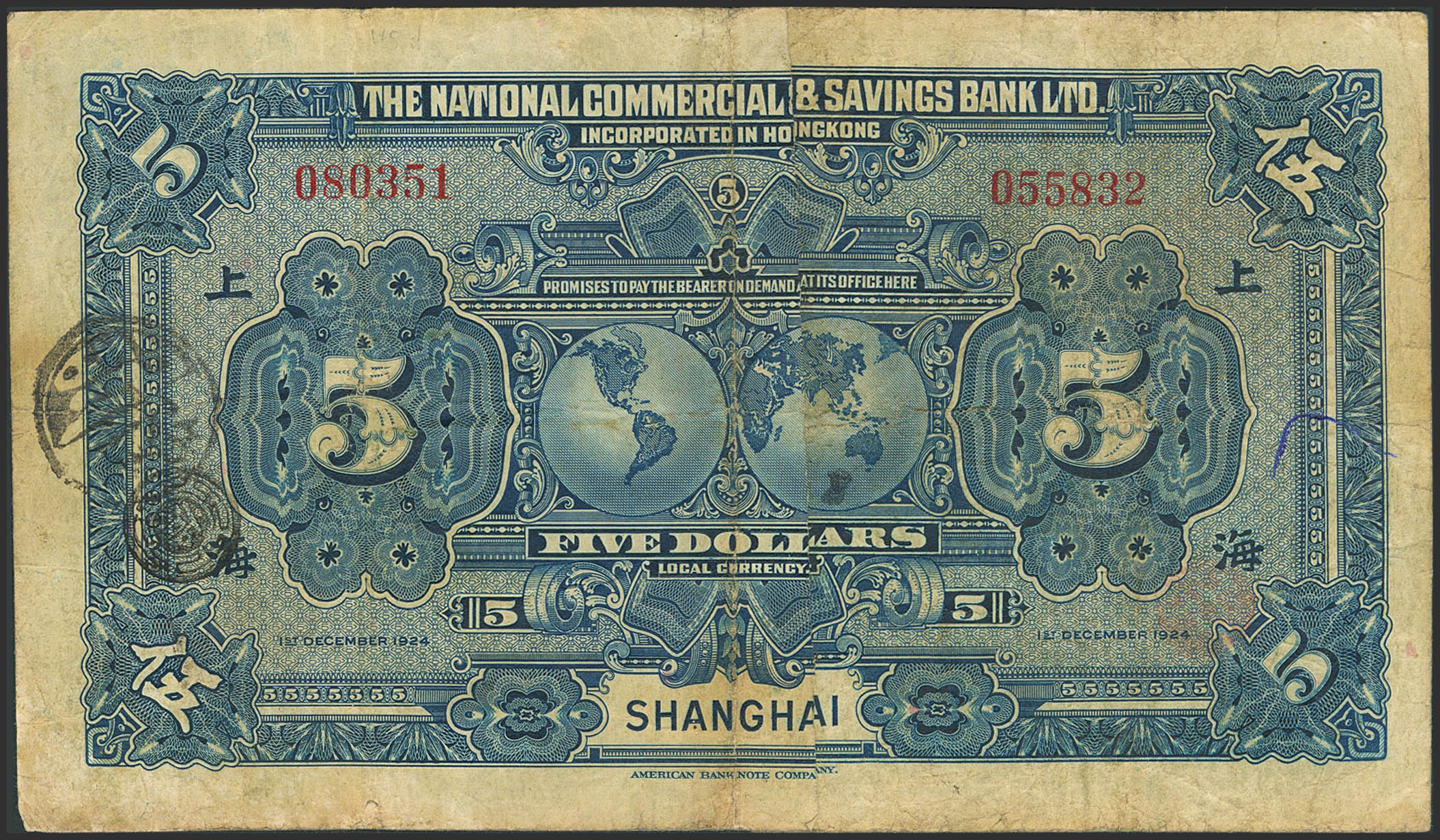 CHINA. 5 Dollars. 1 December 1924. National Commercial and Savings Bank. Shanghai. (Pick: S453b). Half of two different banknotes glued together. More than Fine.