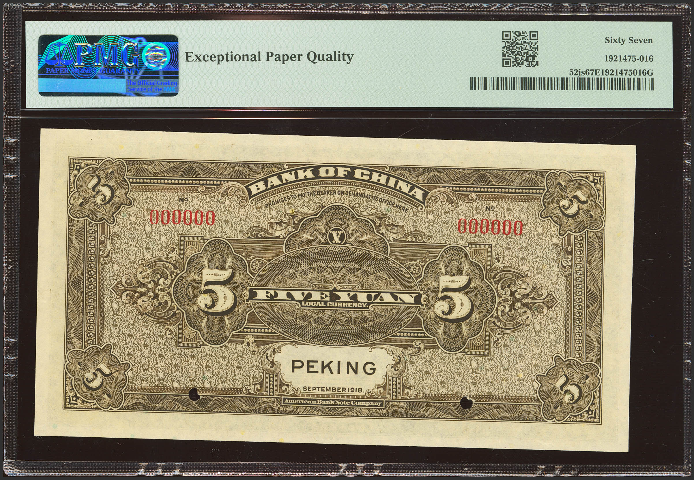 CHINA. 5 Yuan. September 1918. Bank of China. Peking. Specimen. (Pick: 52js, SM: C294-101j). PMG67EPQ.