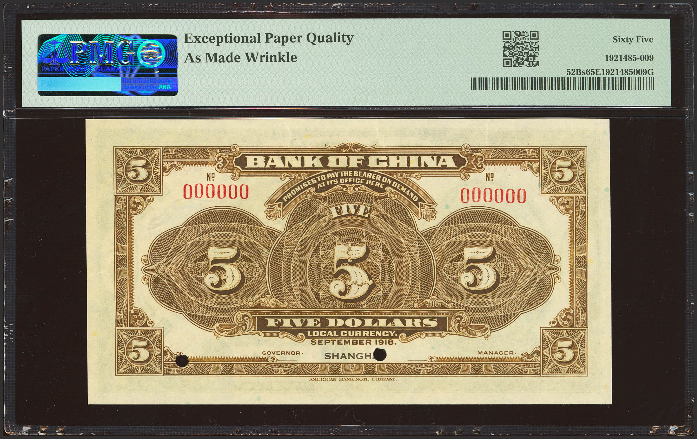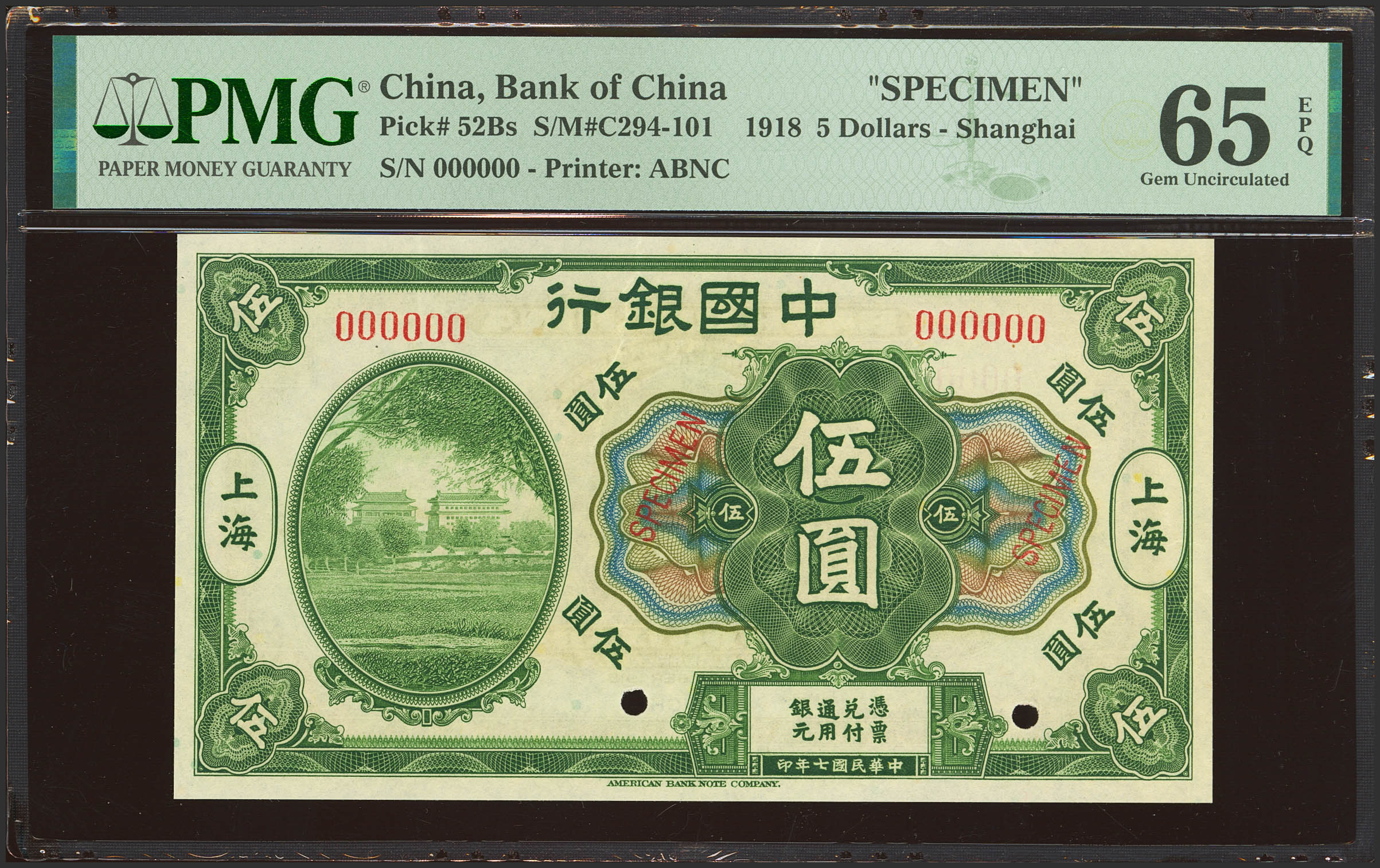CHINA. 5 Dollars. September 1918. Bank of China. Specimen. (Pick: 52Bs, SM: C294-101). PMG65EPQ (as made wrinkle).