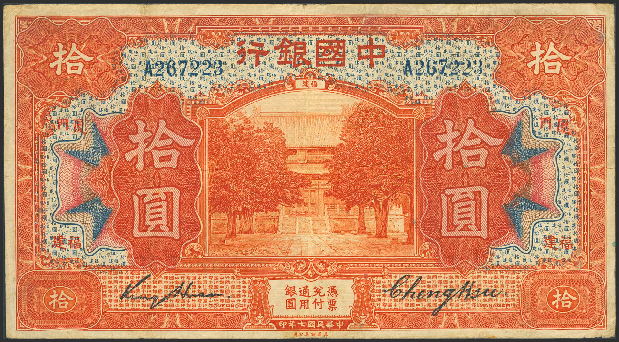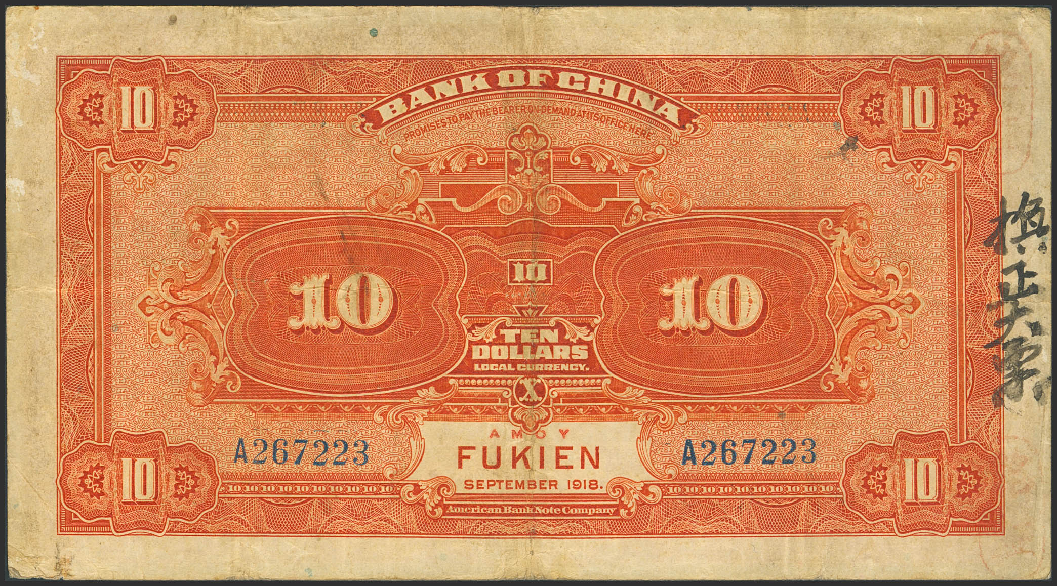 CHINA. 10 Dolalrs. September 1918. Bank of China. Amoy / Fukien. (Pick: 53a). Very Fine.