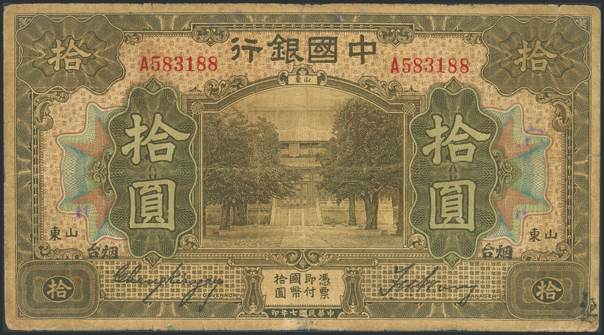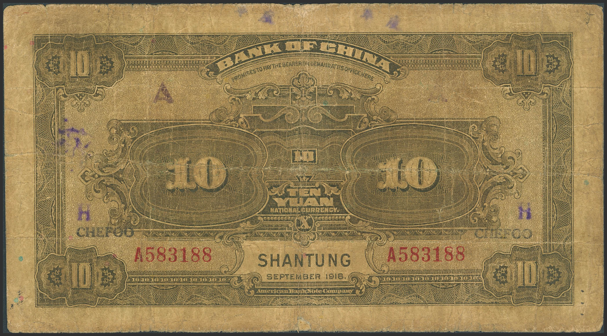 CHINA. 10 Yuan. September 1918. Bank of China. Chefoo / Shantung. (Pick: 53c). Fine.