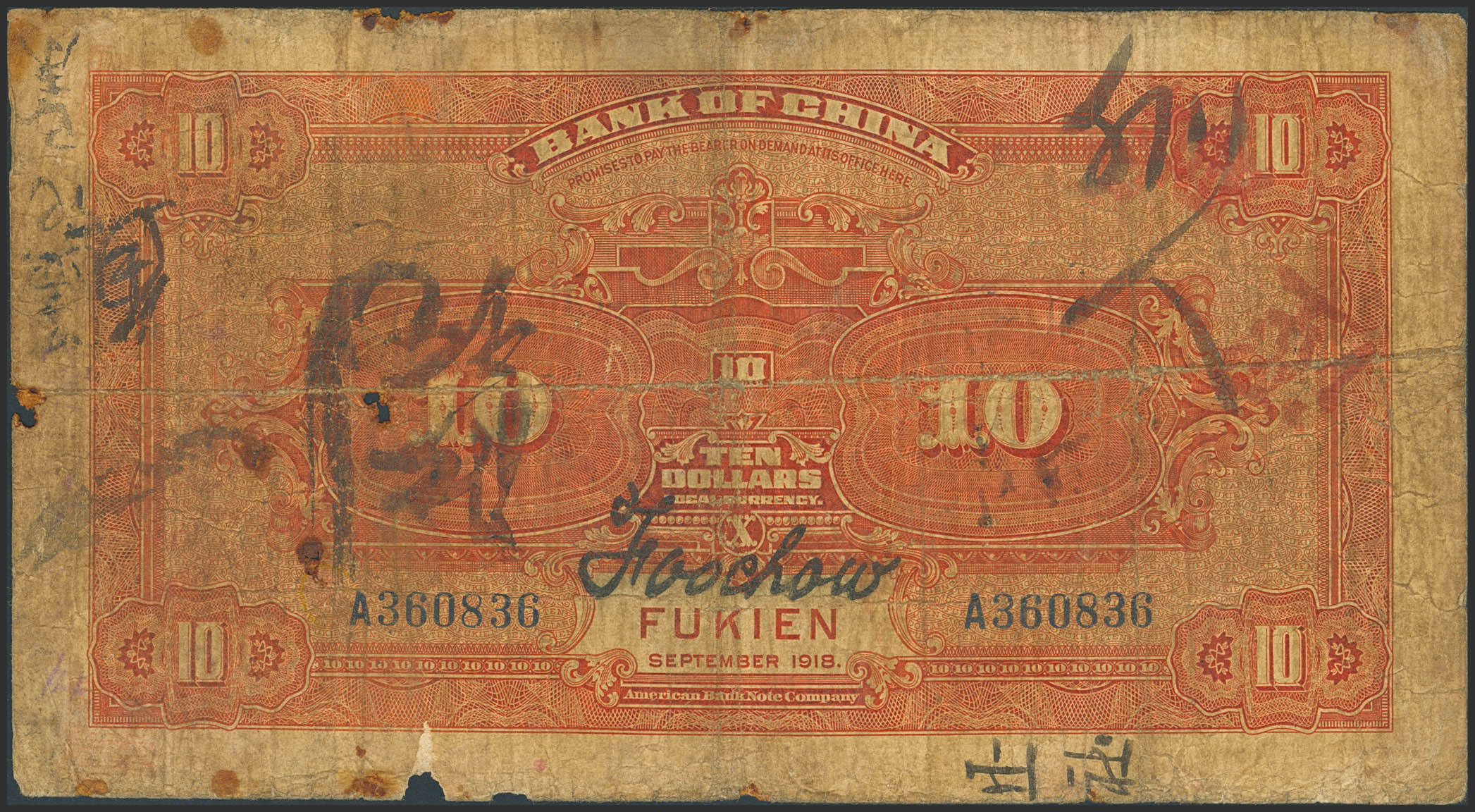 CHINA. 10 Dollars. September 1918. Bank of China. Foochow / Fukien. This place of issue is not referenced in the WPM. (Pick: 53unl). Very Good.