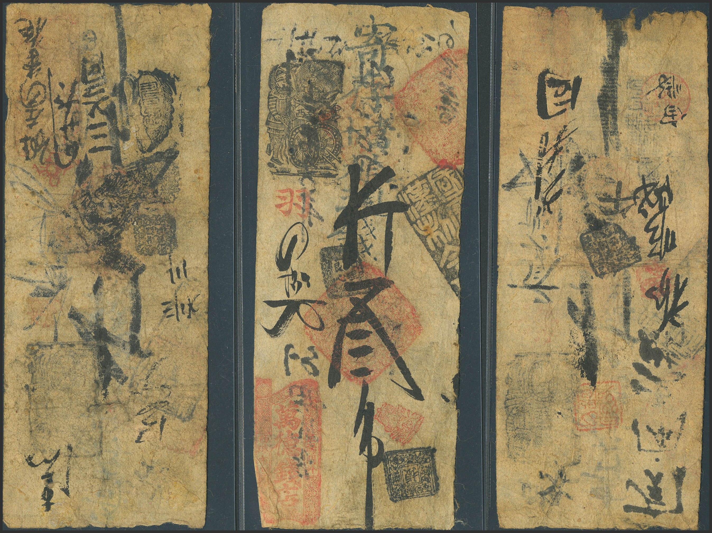 CHINA. Lot of 3 notes of 3 Tiao. (1900ca). Wan Te Chien Tien. Private Issue. Partially hand stamped and partially hand written on thin white paper. (Pick: Unlisted. S/M: W30c). Weak Paper. Very Good.
