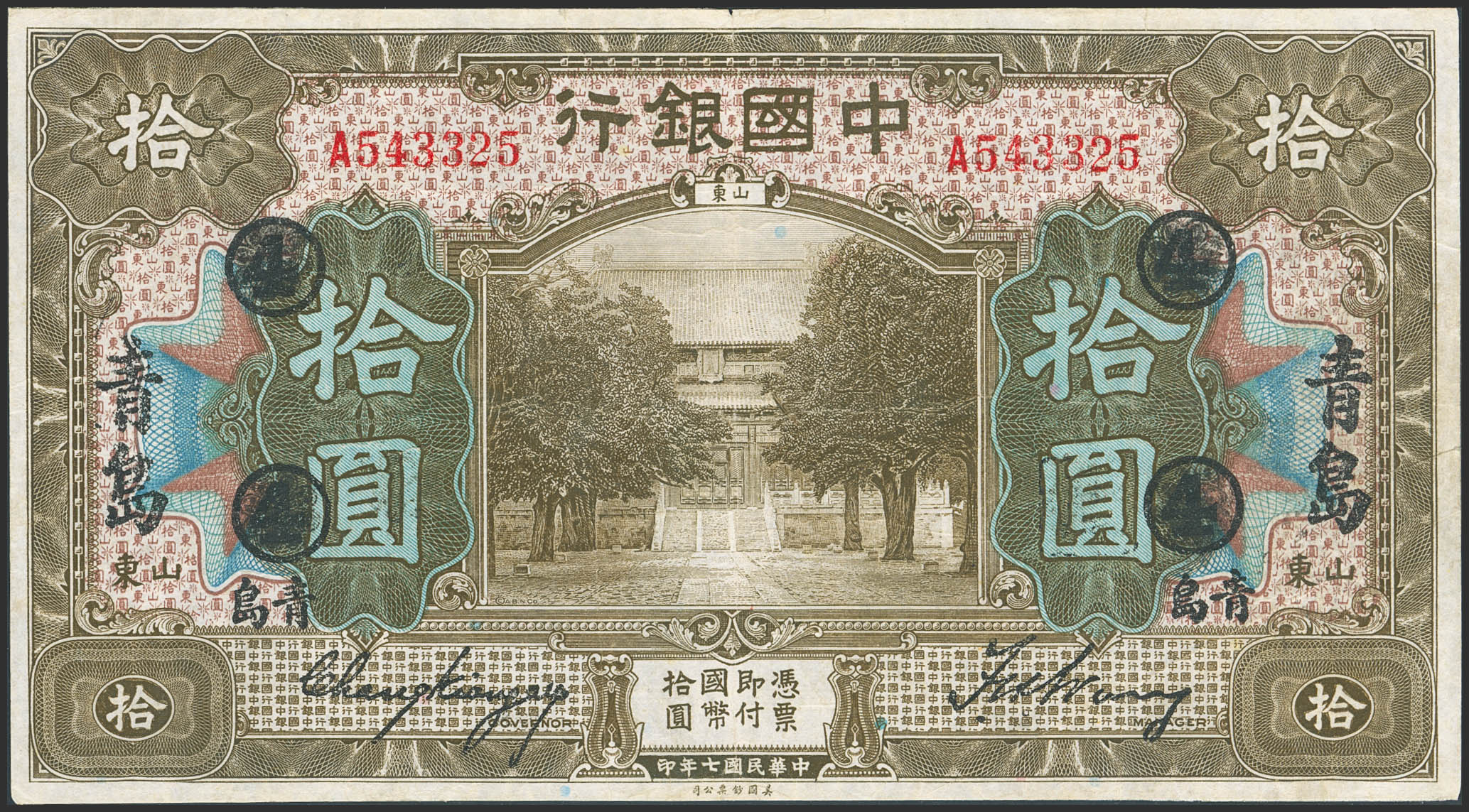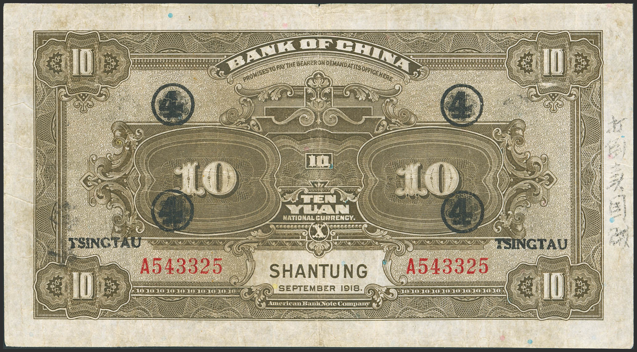CHINA. 10 Yuan. September 1918. Bank of China. Tsingtau / Shantung. Zhang Jia’ao / Wang Zuxun. (Pick: 53s). Very Fine.