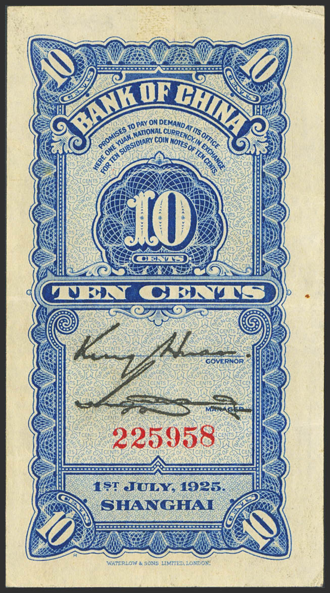 CHINA. 10 Cents. 1 July 1925. Bank of China. (Pick: 63). Extremely Fine.