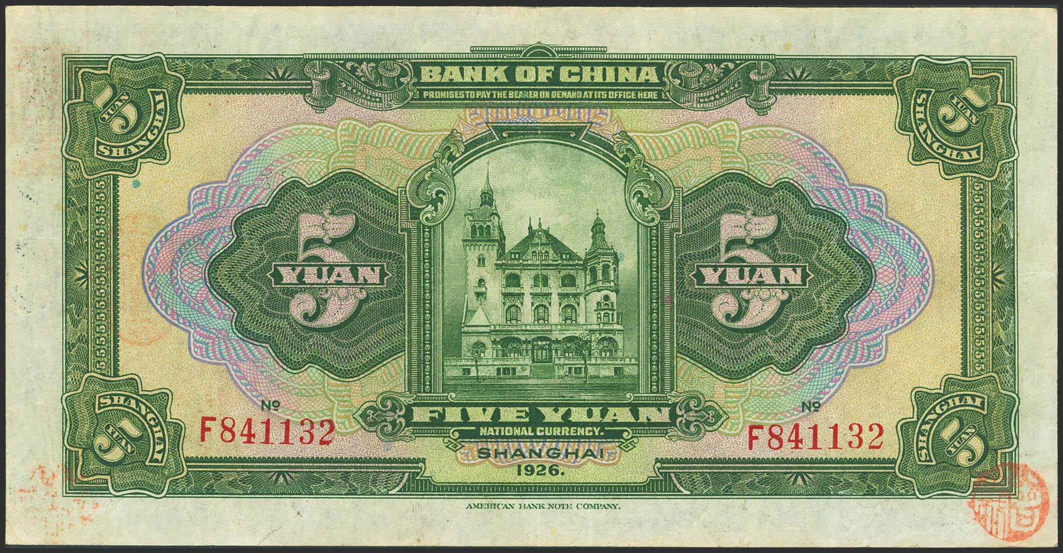 CHINA. 5 Yuan. 1926. Bank of China. Shanghai. Feng Gengguang / Bei Zuyi. (Pick: 66a). More than Very Fine.