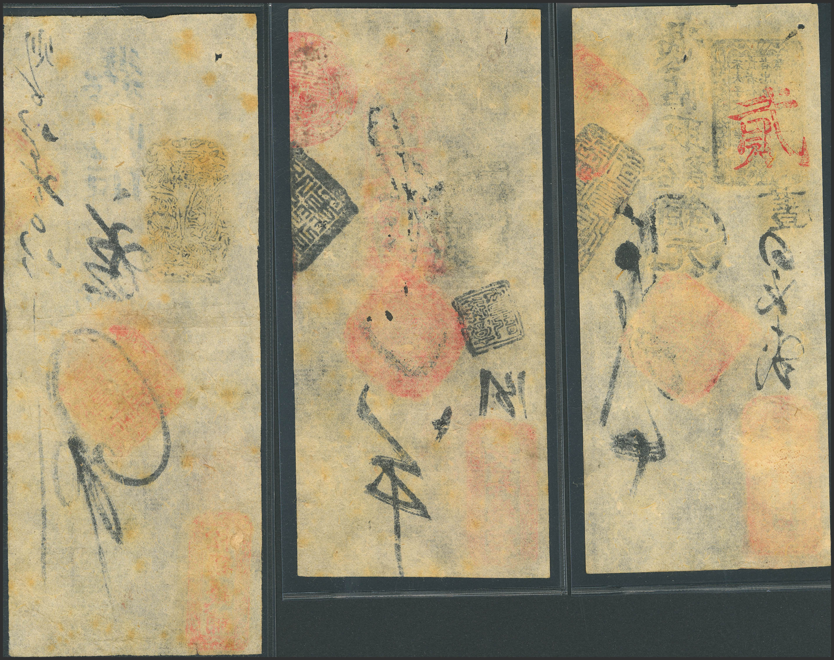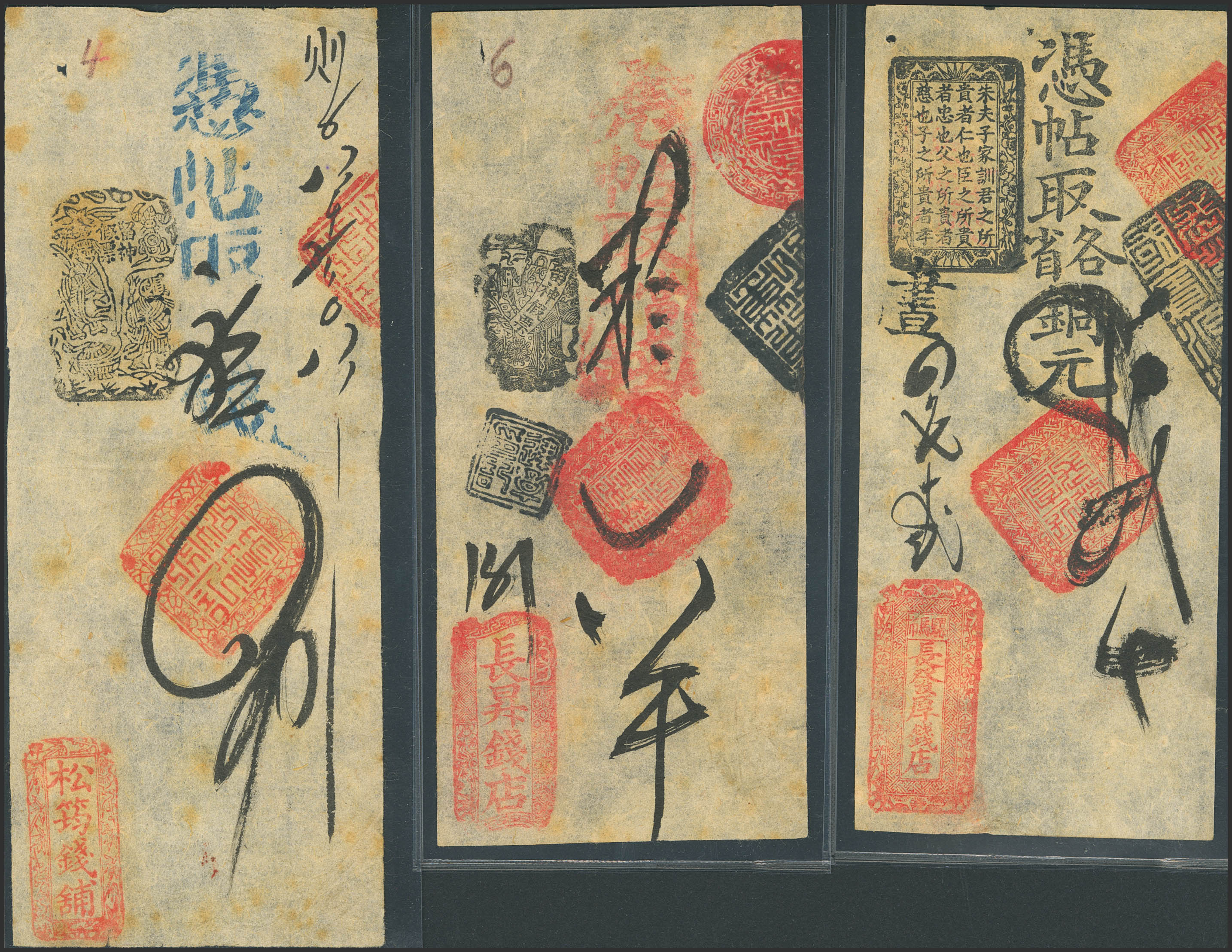 CHINA. Lot of 3 banknotes with unknown denominations. (1900ca). Chang Sheng Qian Dian. Song Lai Quian Pu. Chang Qing Dong Qian Dian. Partially hand stamped and partially hand written on thin white paper. (Pick: Unlisted). Fine to Very Fine.
