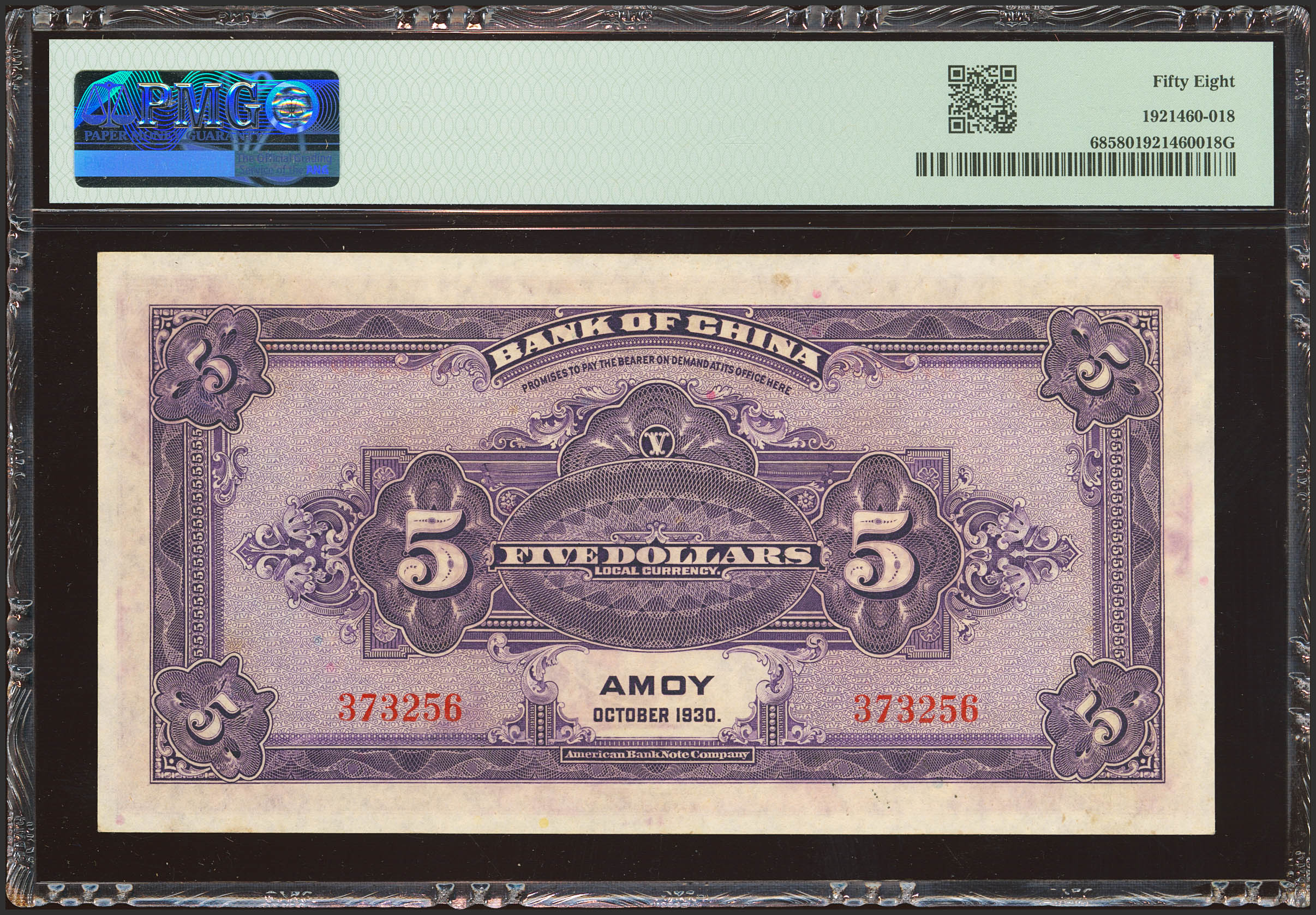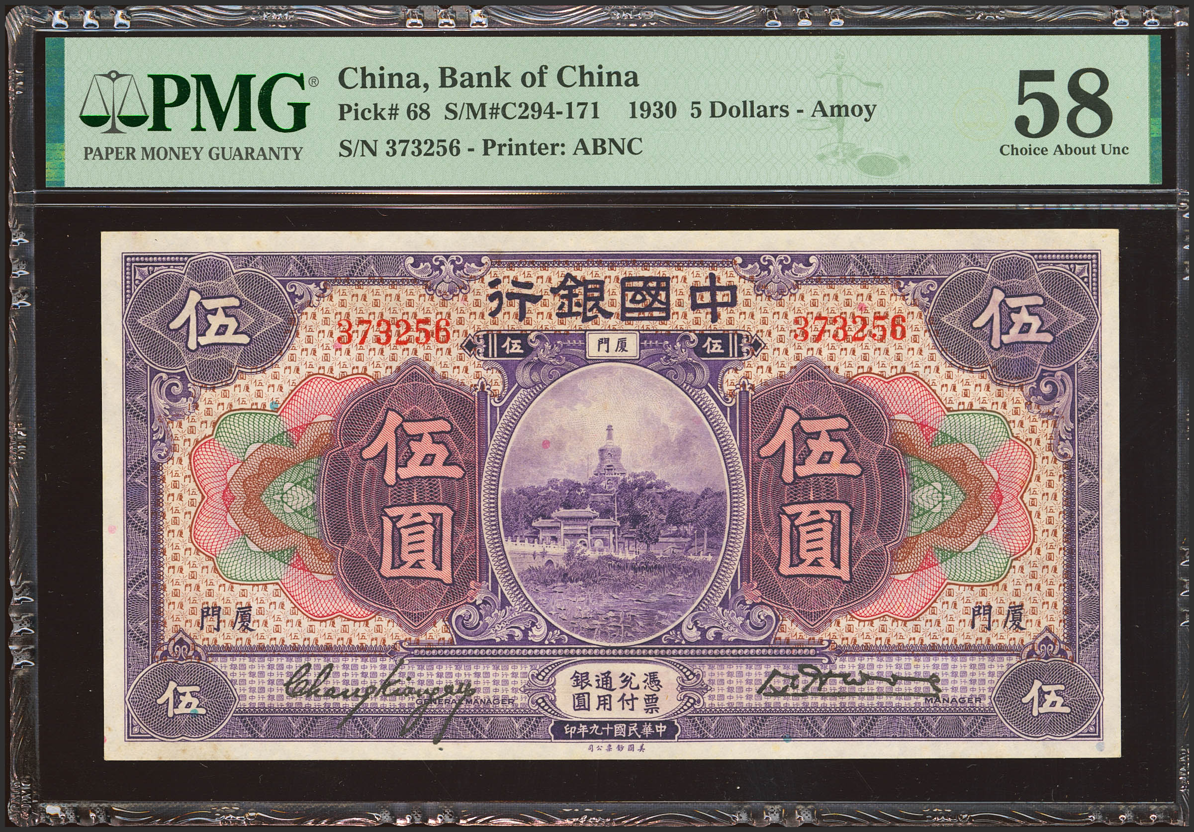CHINA. 5 Dollars. October 1930. Bank of China. Amoy. Zhang Jia’ao / Huang Pei-Chuan. (Pick: 68, SM: C294-171). PMG58.