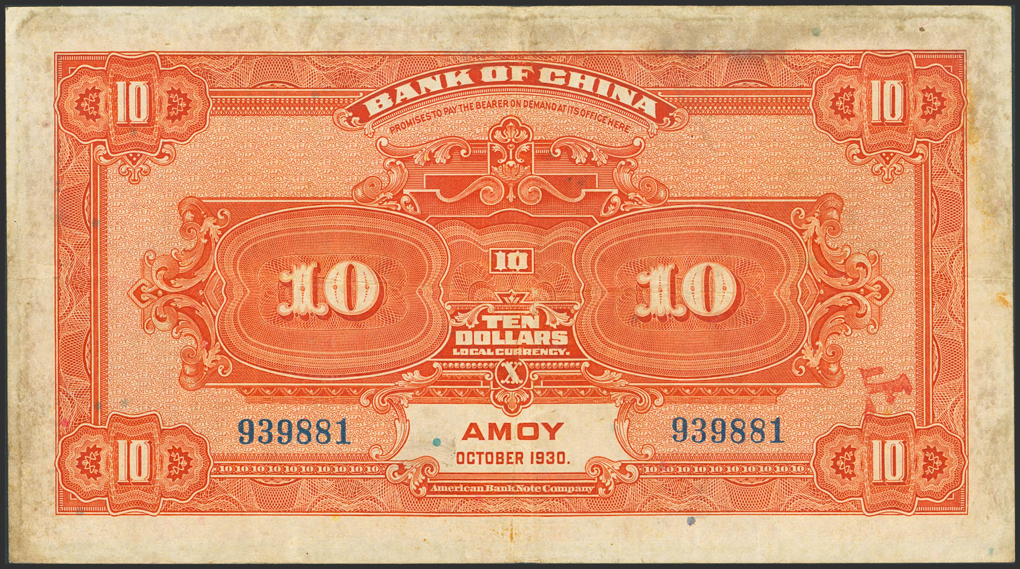 CHINA. 10 Dollars. October 1930. Bank of China. Amoy. Sung Hang-Chang / Huang Pei-Chuan. (Pick: 69). More than Very Fine.