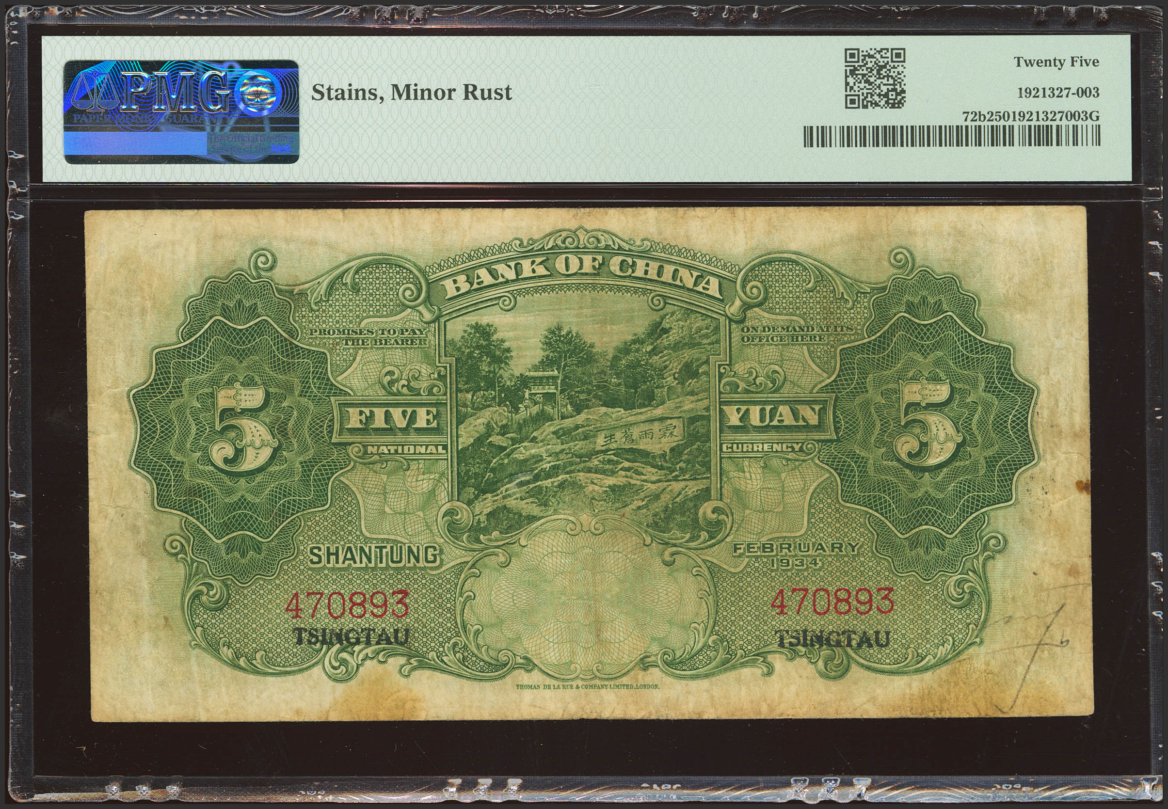 CHINA. 5 Yuan. February 1934. Bank of China. Tsingtau / Shantung. (Pick: 72b, SM: C294-192b). PMG25 (stains, minor rust).