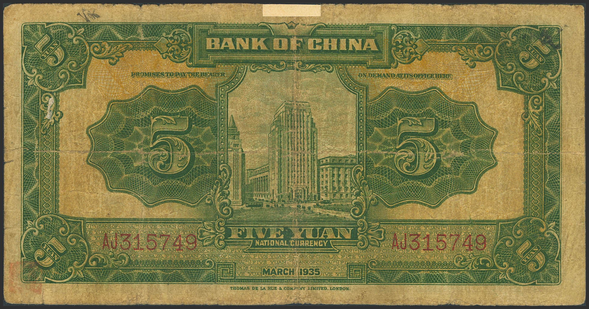 CHINA. 10 Yuan. March 1935. Bank of China. (Pick: 77b). Pinholes, adhesive paped added covering paper missing. Fine.