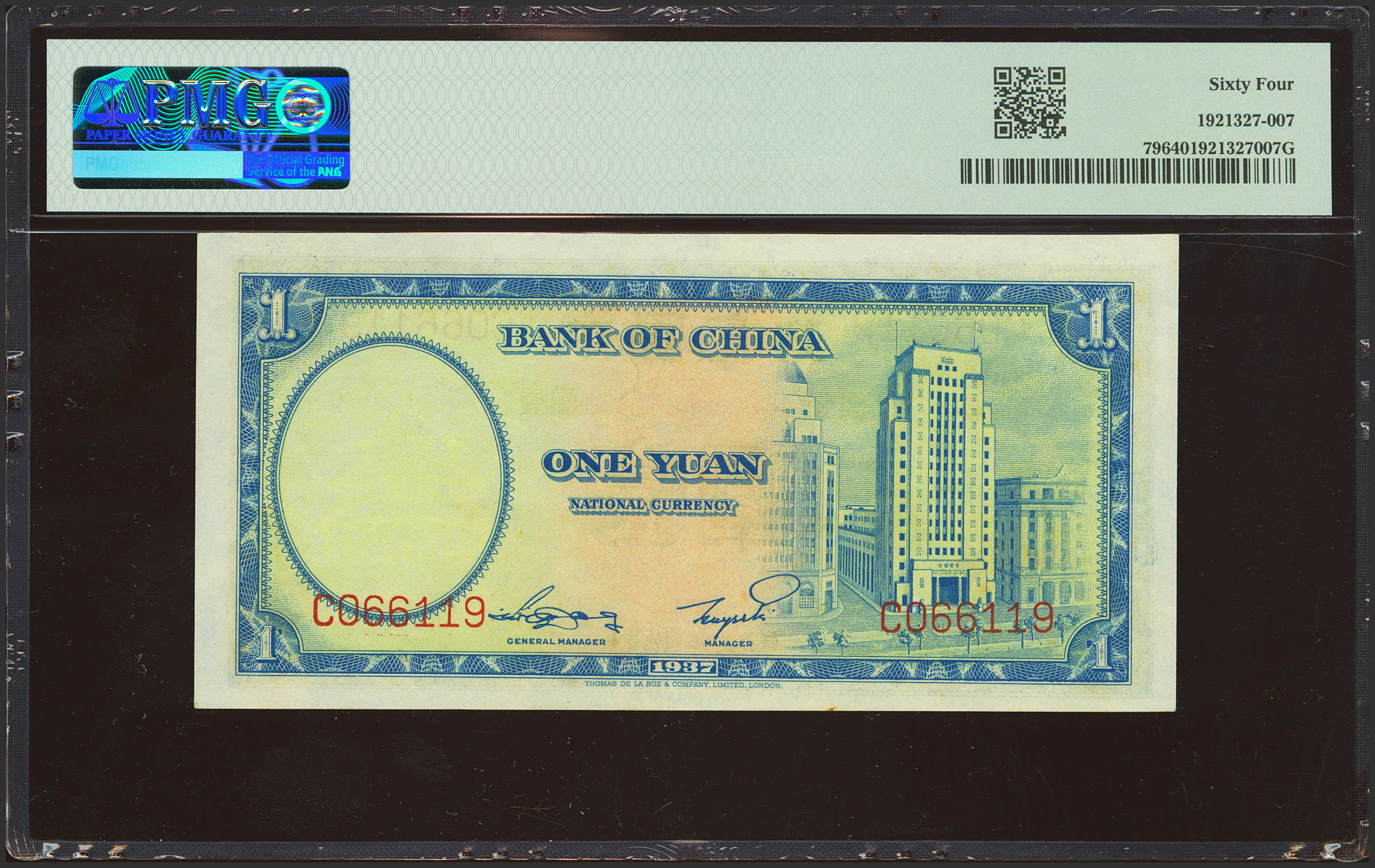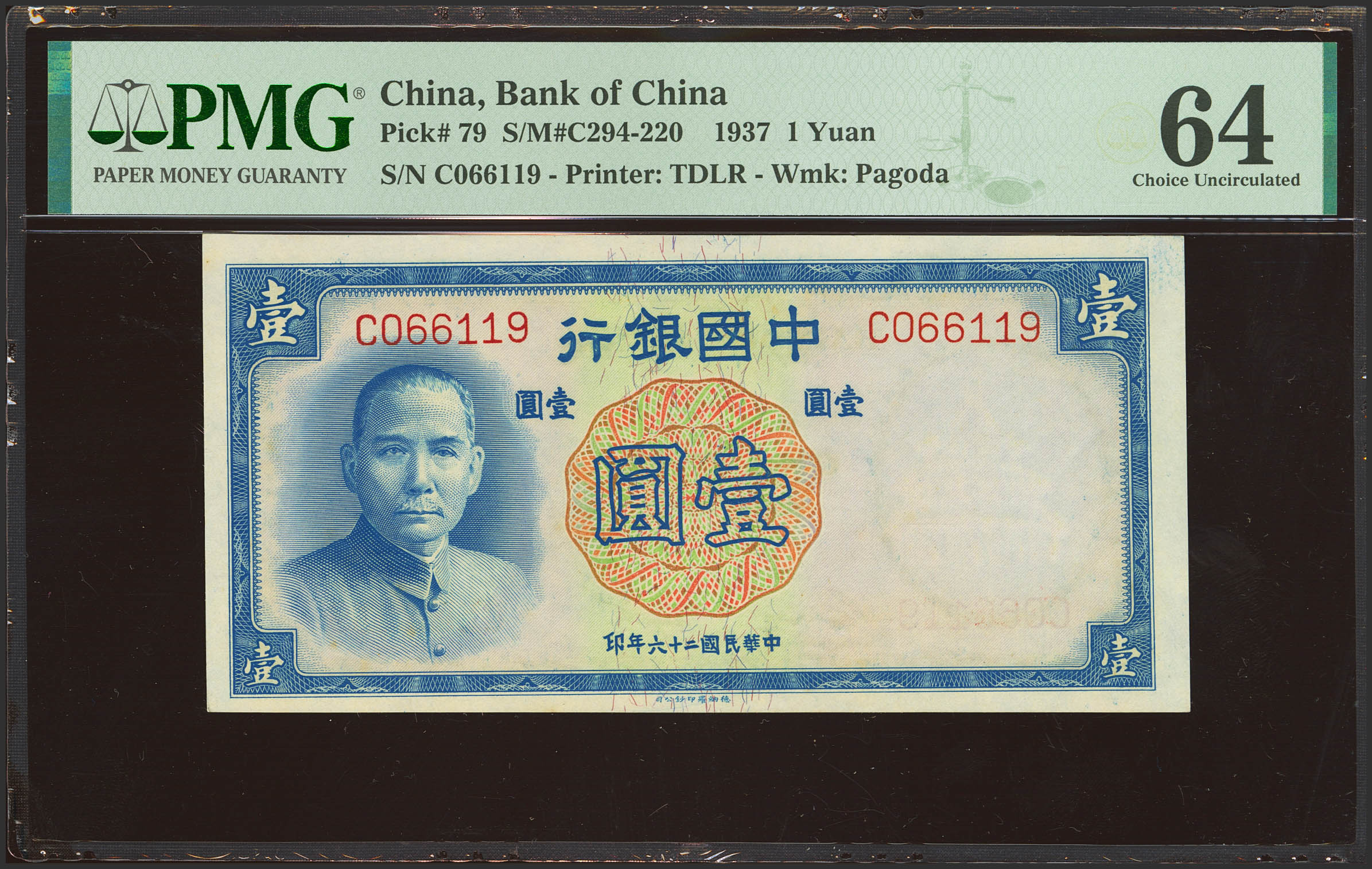 CHINA. 1 Yuan. 1937. Bank of China. (Pick: 79, SM: C294-220). PMG64.