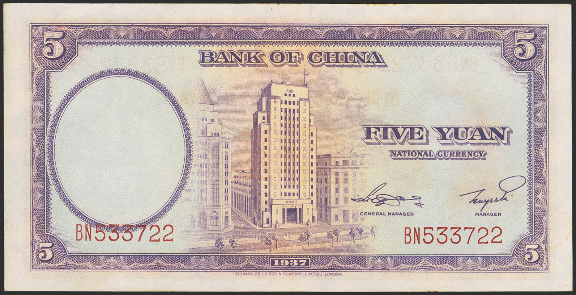 CHINA. 5 Yuan. 1937. Bank of China. (Pick: 80). Almost Uncirculated.