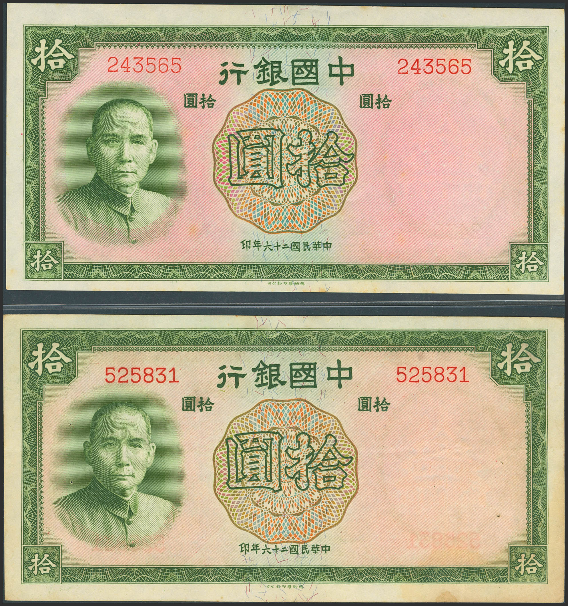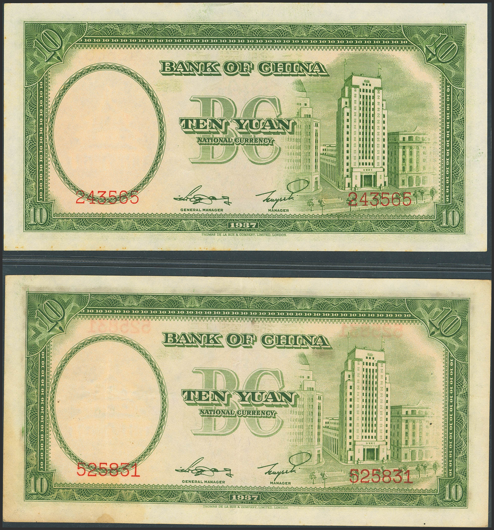 CHINA. Set of 2 notes of 10 Yuan. 1937. Bank of China. (Pick: 81). Series 525831 has a pinhole. Very Fine to Less than Uncirculated.